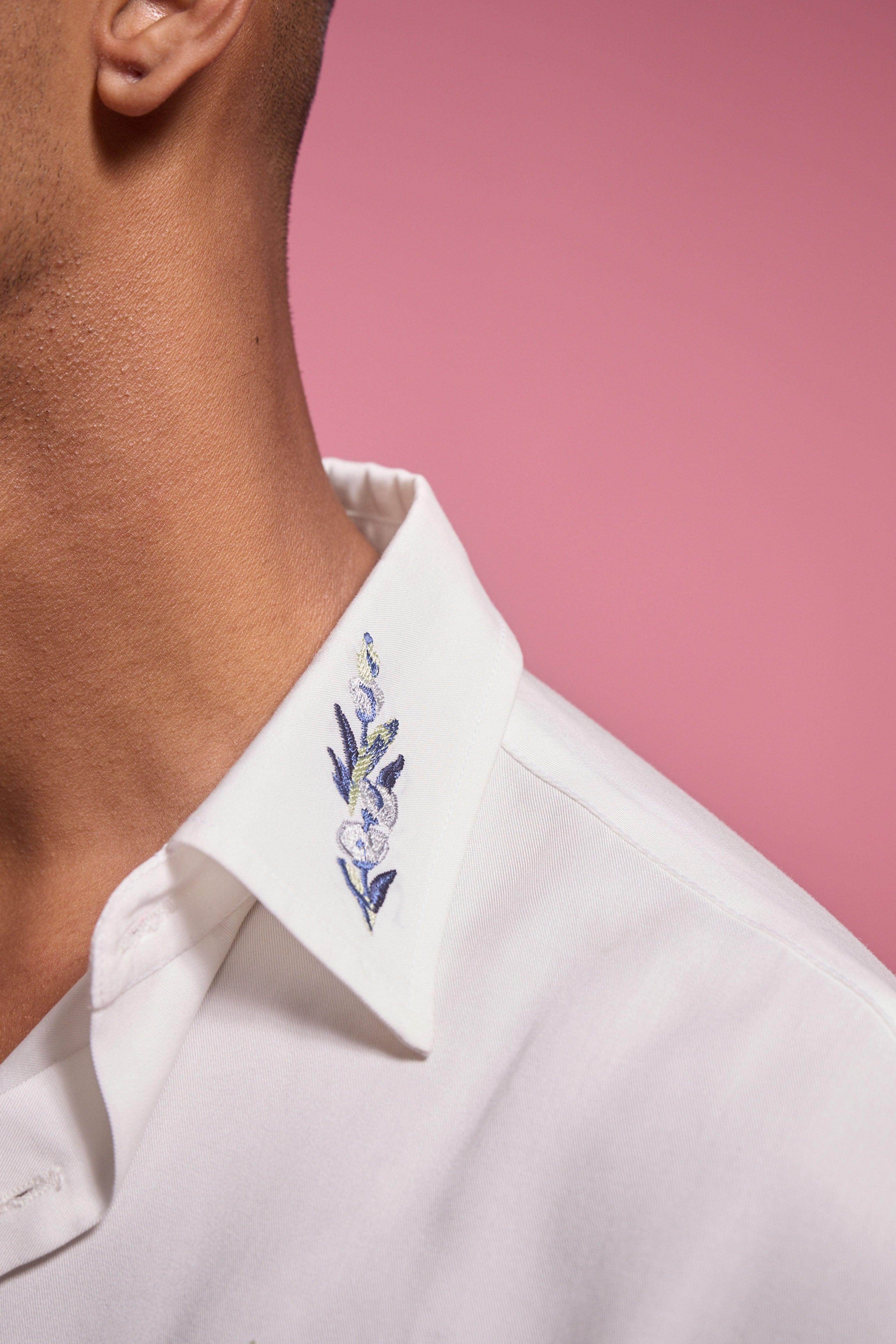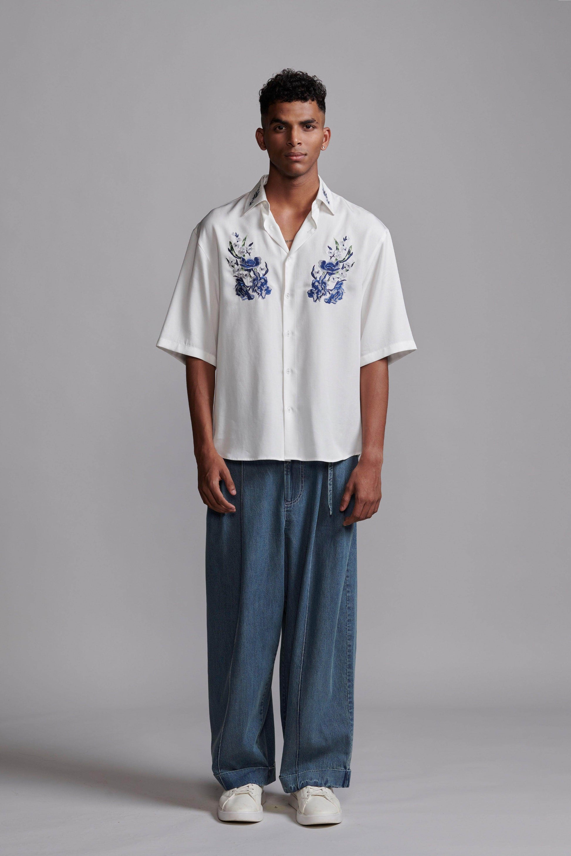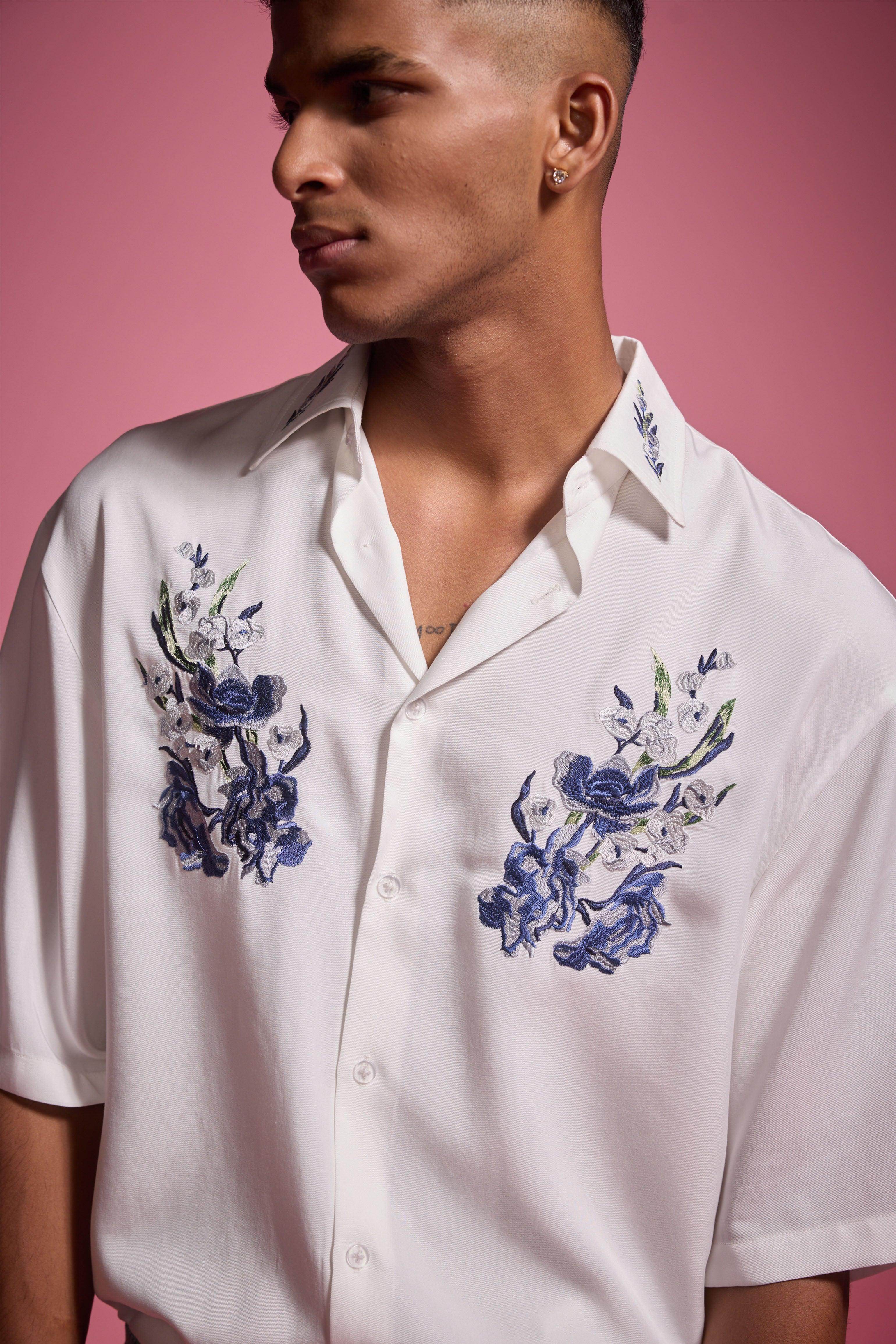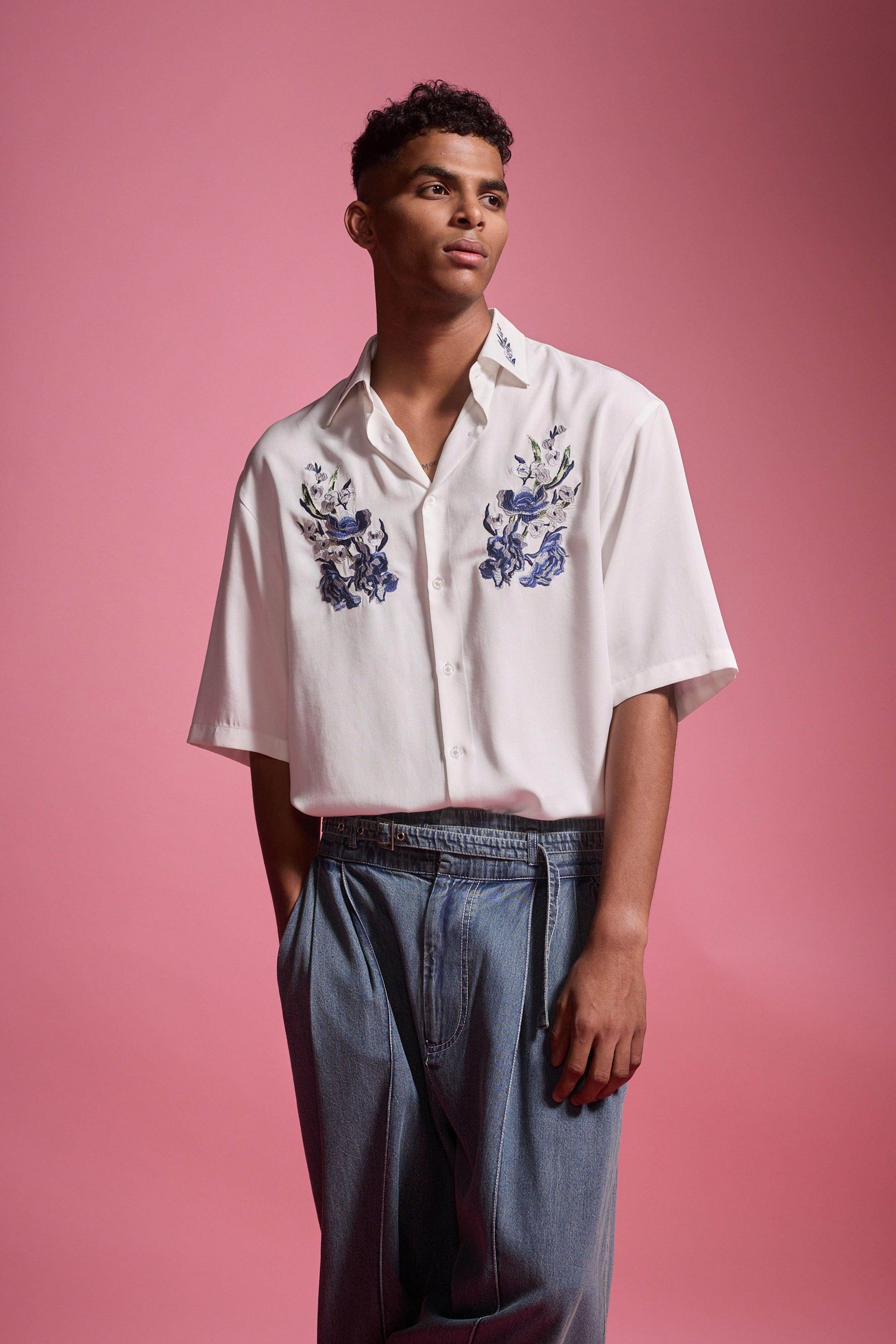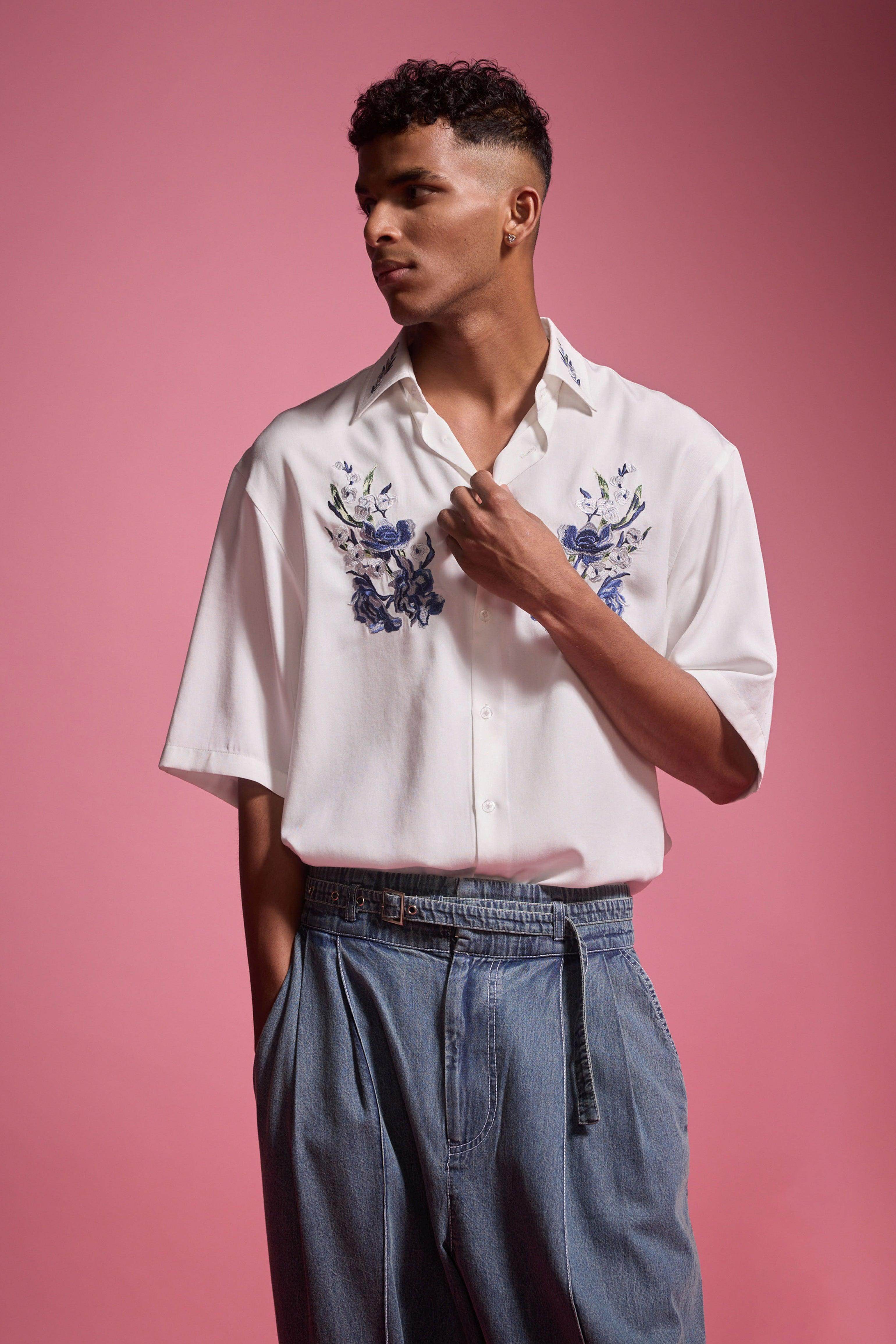 Short sleeve white boxy shirt with placed embroidery on the chest and collar. Features a shirt collar, button-down placket, and box pleat in the back. Made from sustainable, breathable Tencel.