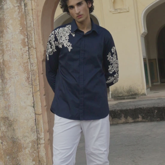 Blue organic cotton poplin full sleeve shirt with placed ivory motif embroidery on the shoulder and sleeves. Contrast ivory piping detailing on the sleeve cuff opening and back yoke. Shirt collar, concealed placket. Regular fit.