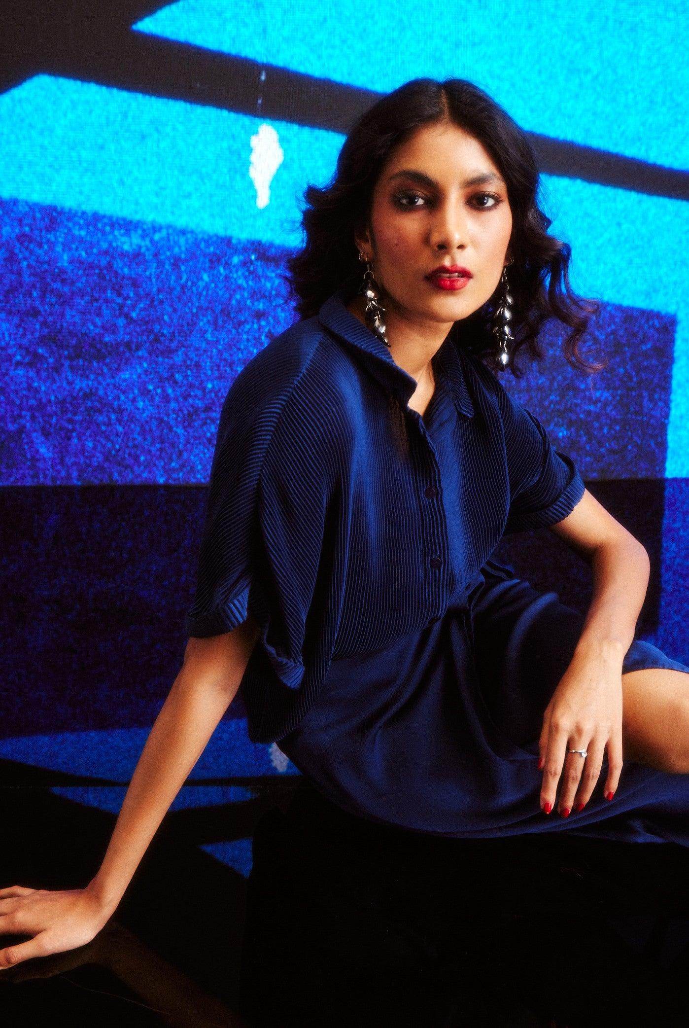 Navy pleated button-down shirt. Dolman half sleeves with turn-up cuff detail. Paired with complementary overlap skirt with tie-up at the front waist. Semi-lined. Flowy silhouette.