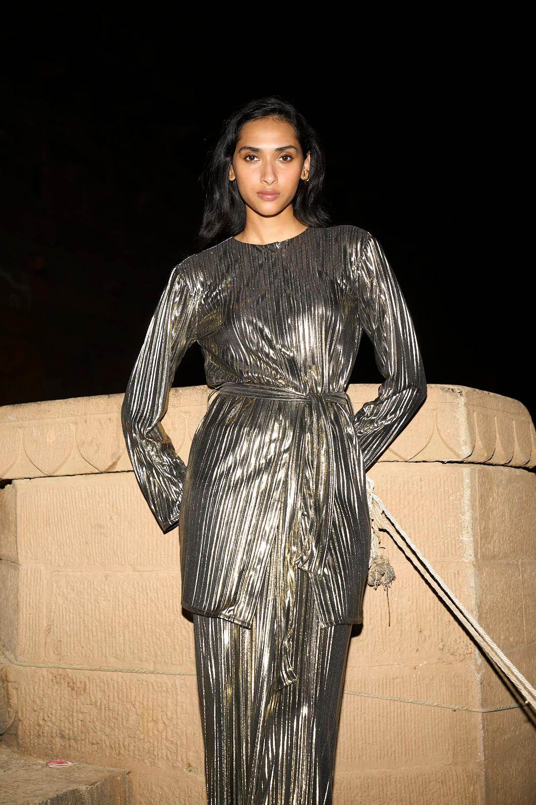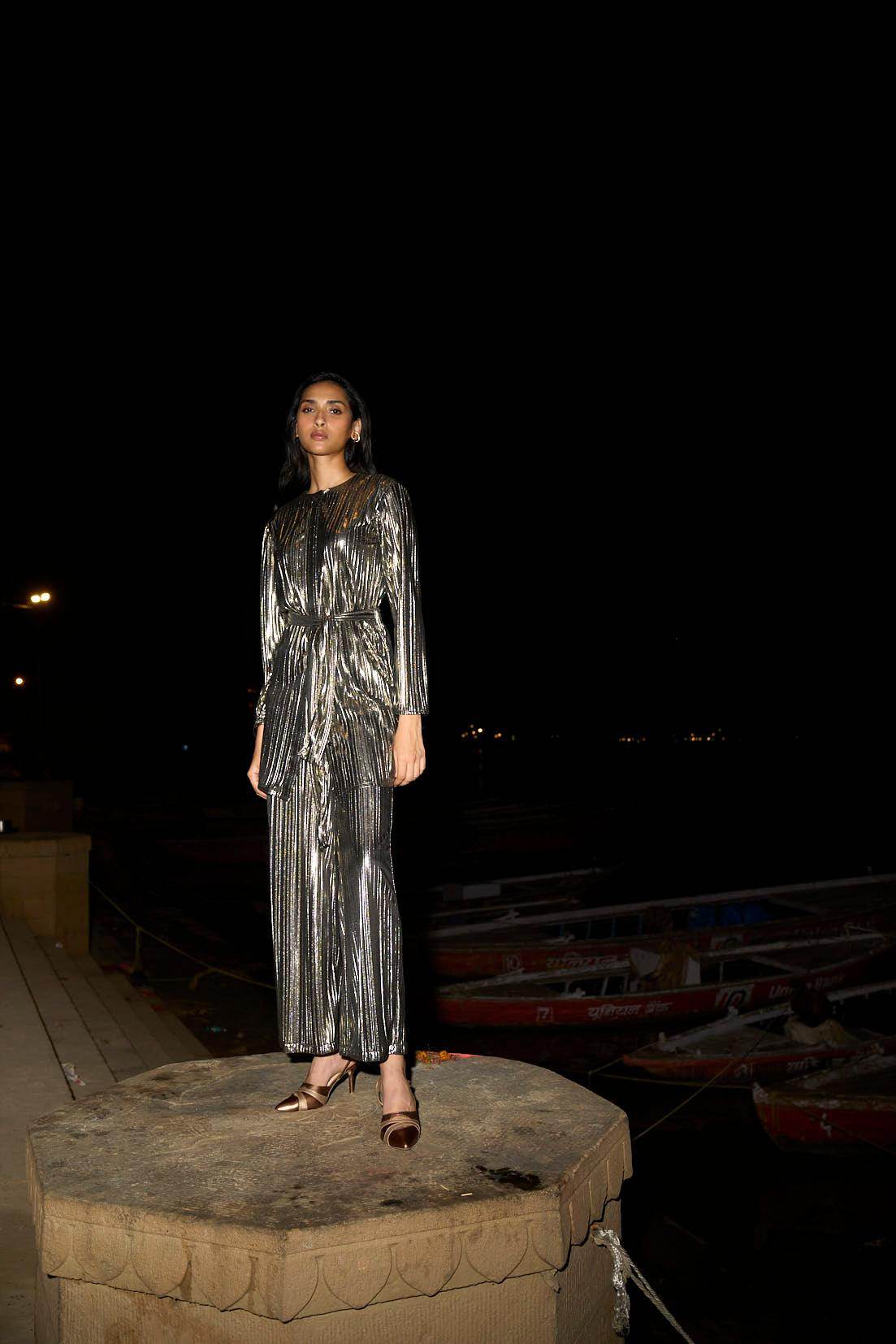 Long sleeved foil printed pleated longline shirt with self tie up belt around the waist. Round neck, concealed button placket. Straight fit. Paired with matching straight pants. Hook and zip closure at the front. Elasticated at the back. Pocket on the sides. .