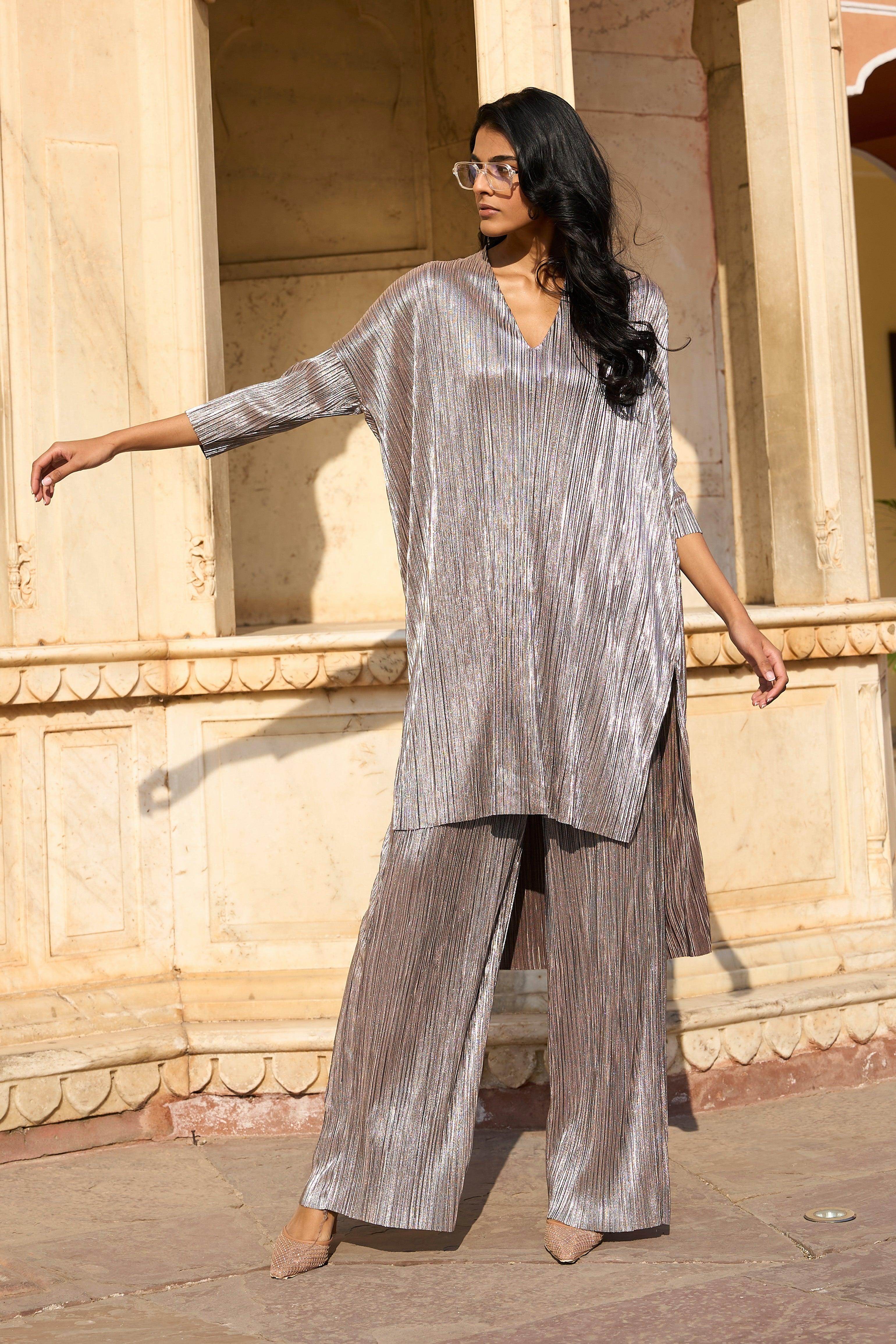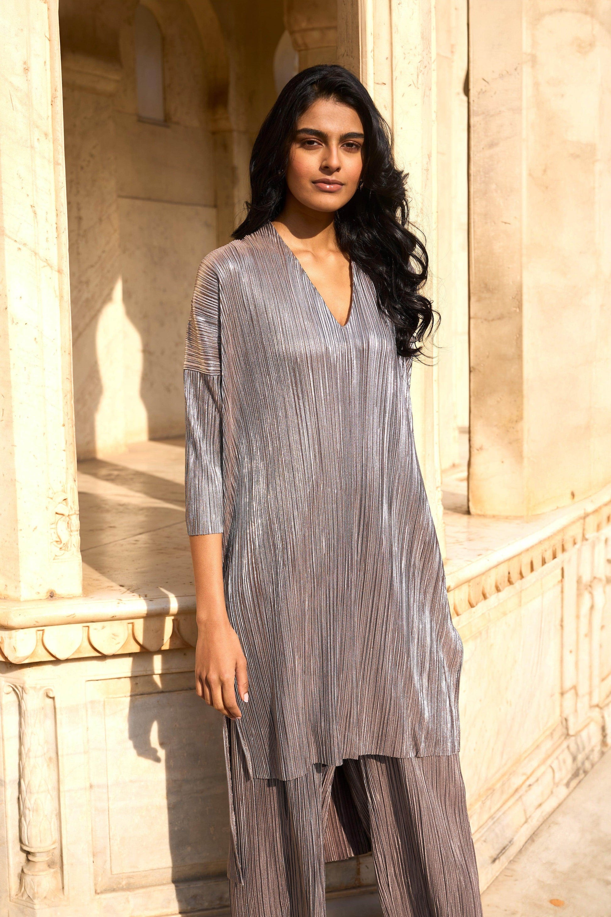 Pleated lamé longline top with a high/low hem. V-neckline and drop shoulders. Slits in the sides.