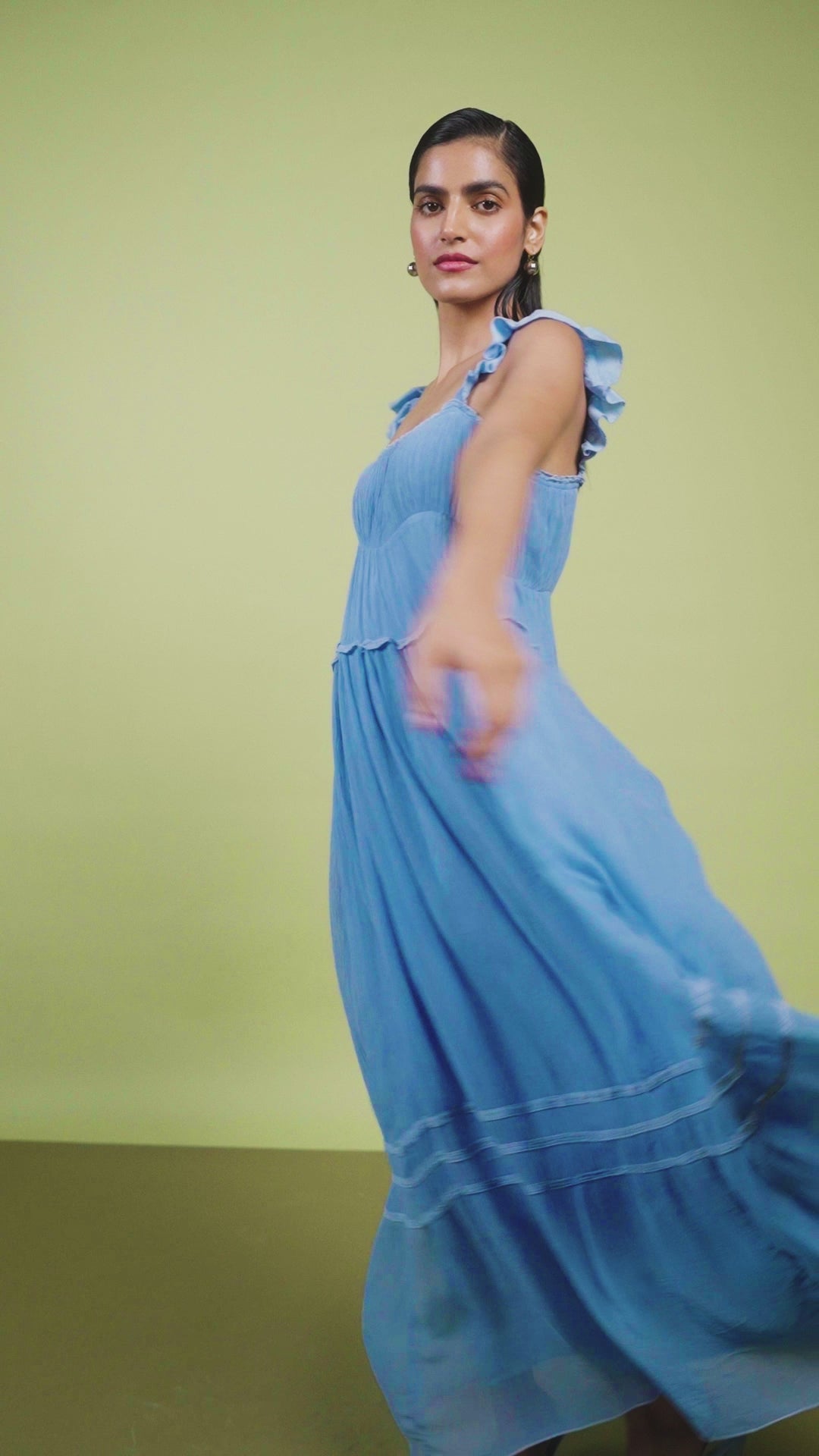Azure blue tiered maxi dress in soft, breathable crinkled georgette. Features tonal lace appliqué and delicate ruching for added movement. Ruffled shoulder straps. Fully lined.