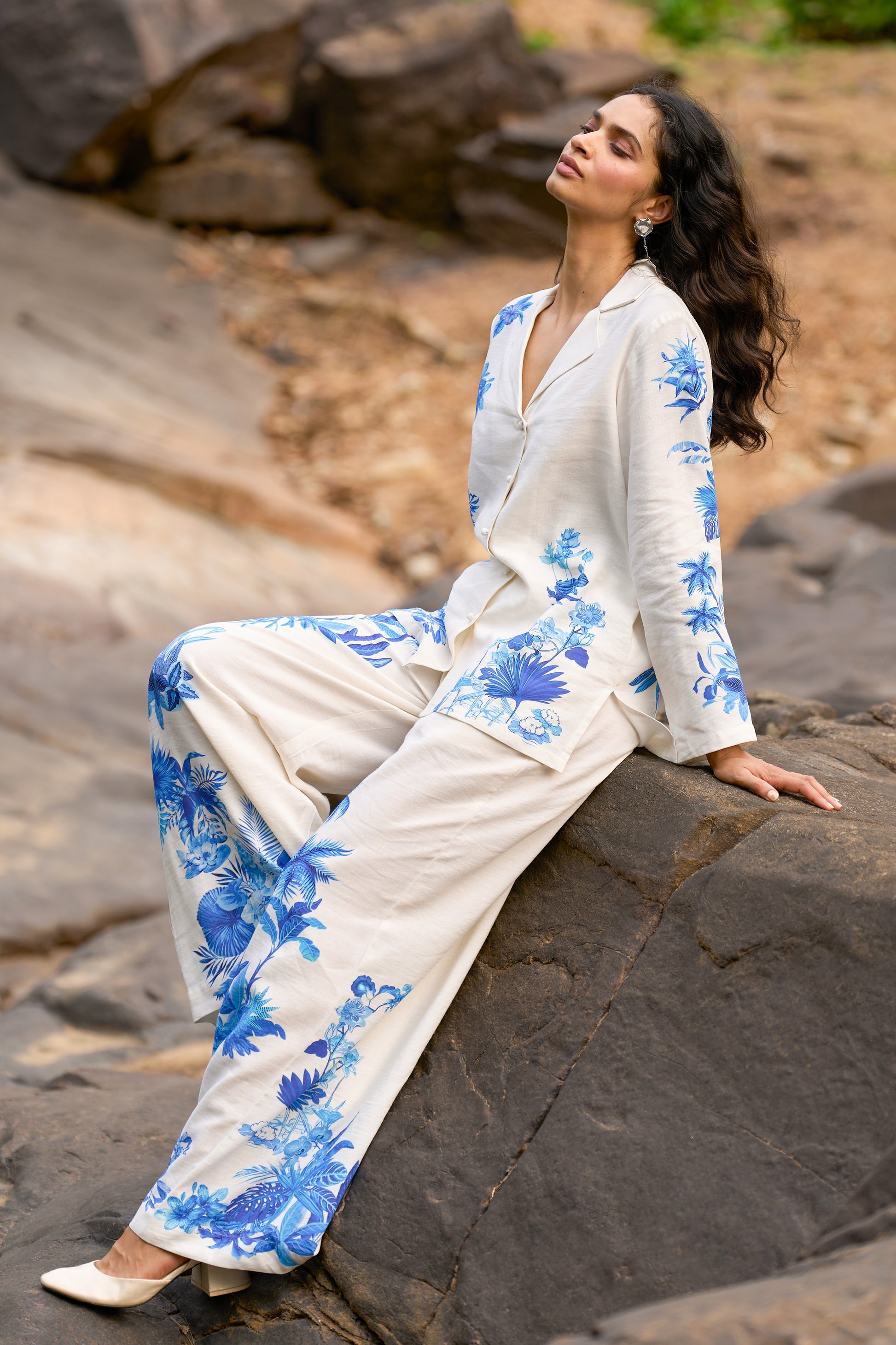 Boxy white linen shirt with placed prints in tones of ink and blue. Soft floral motifs in the front complement the large scale peacock and floral motifs in the back. V-neck with notch collar. Front button down placket. Full sleeves.