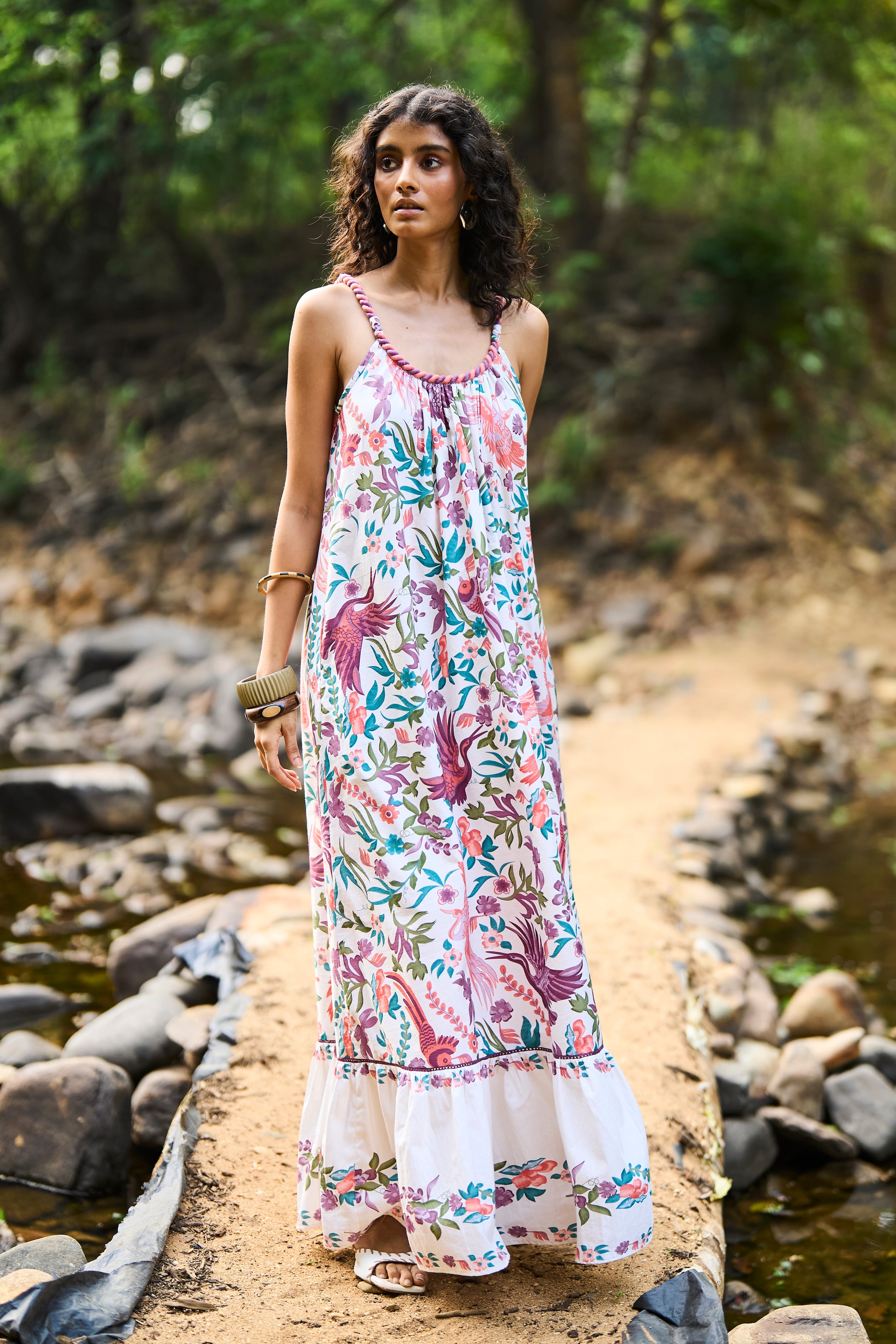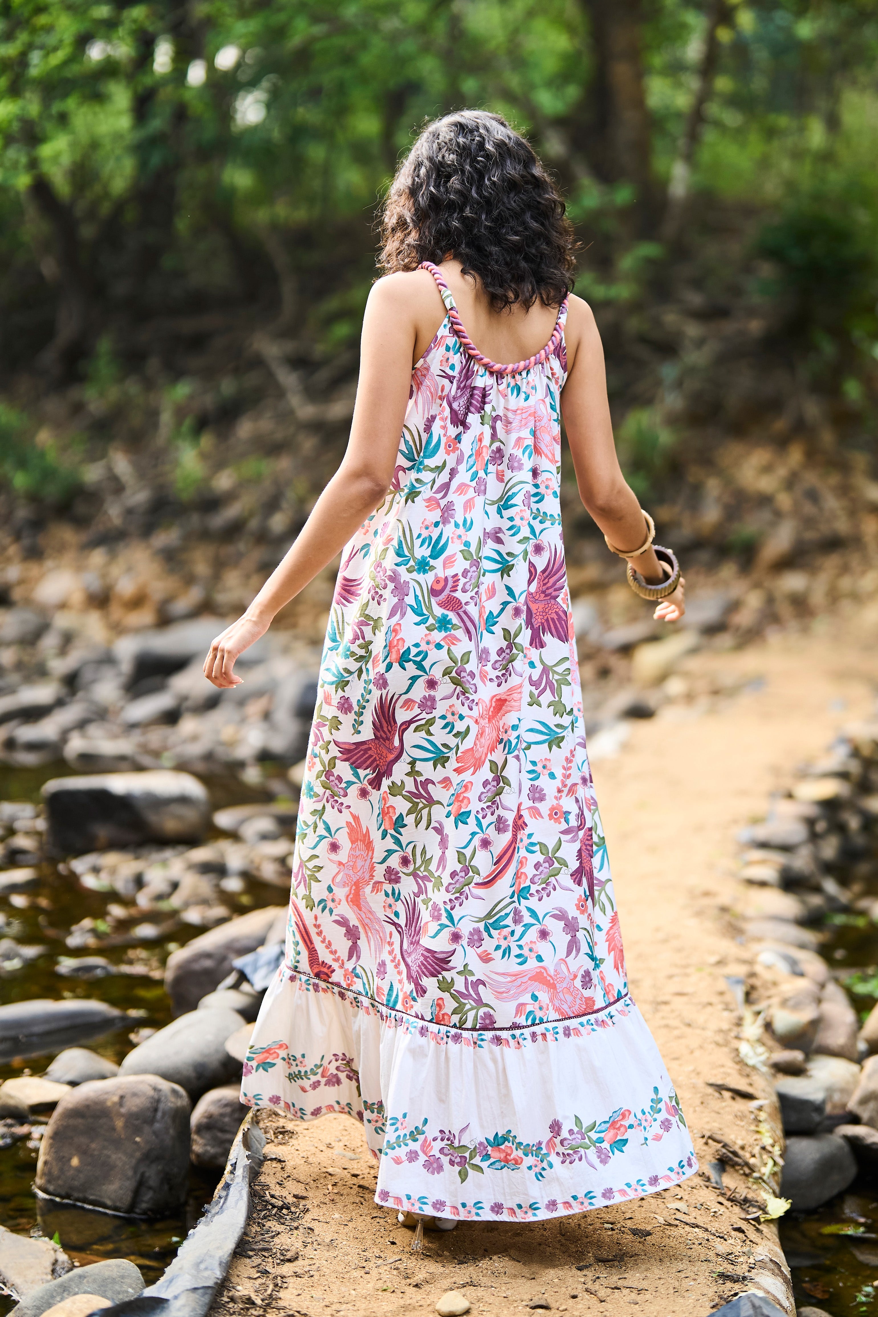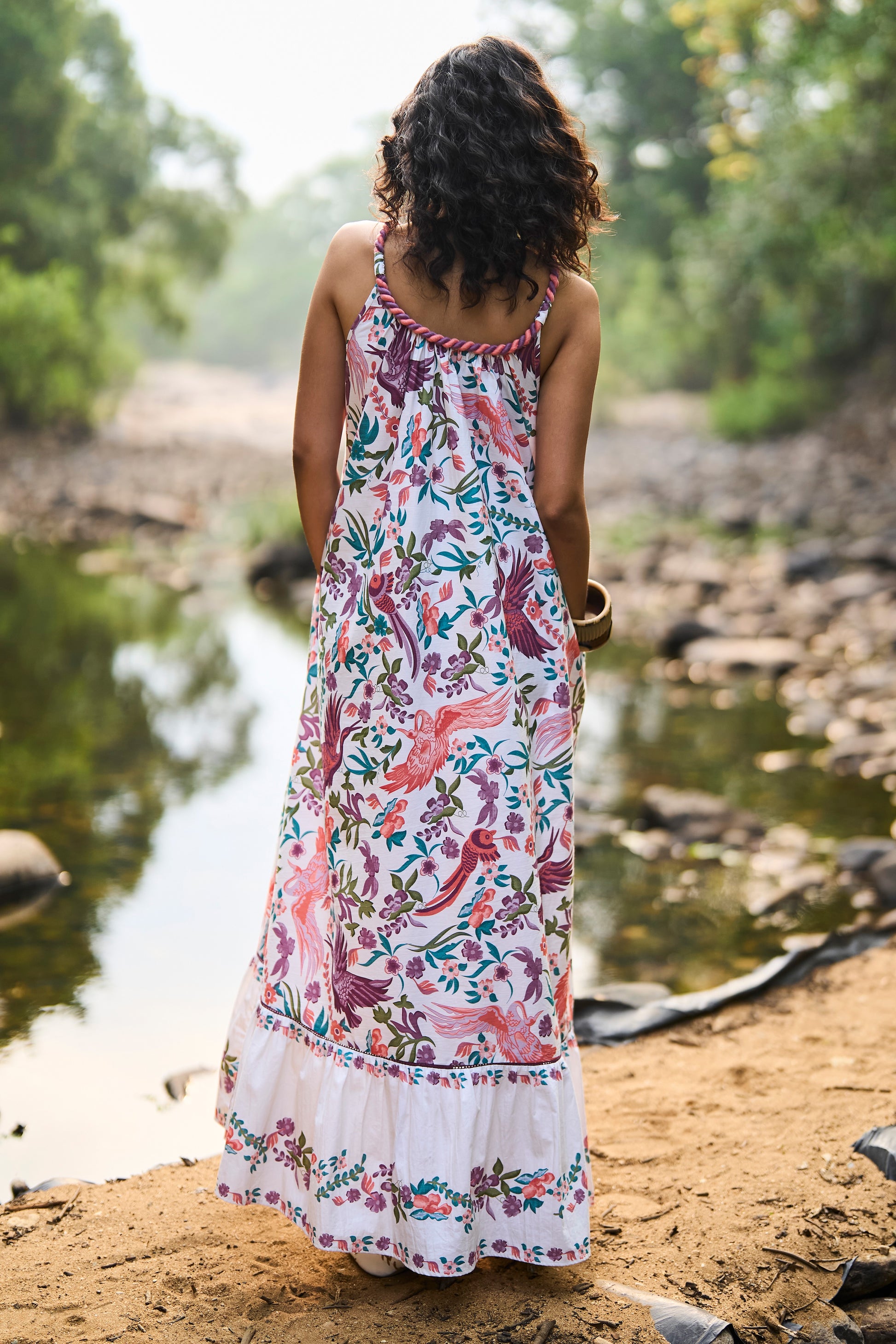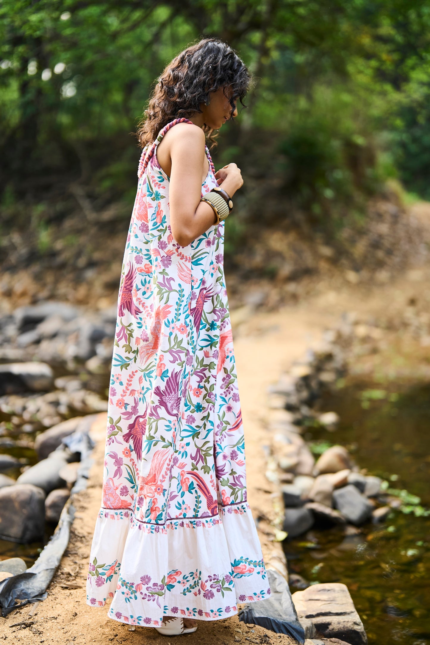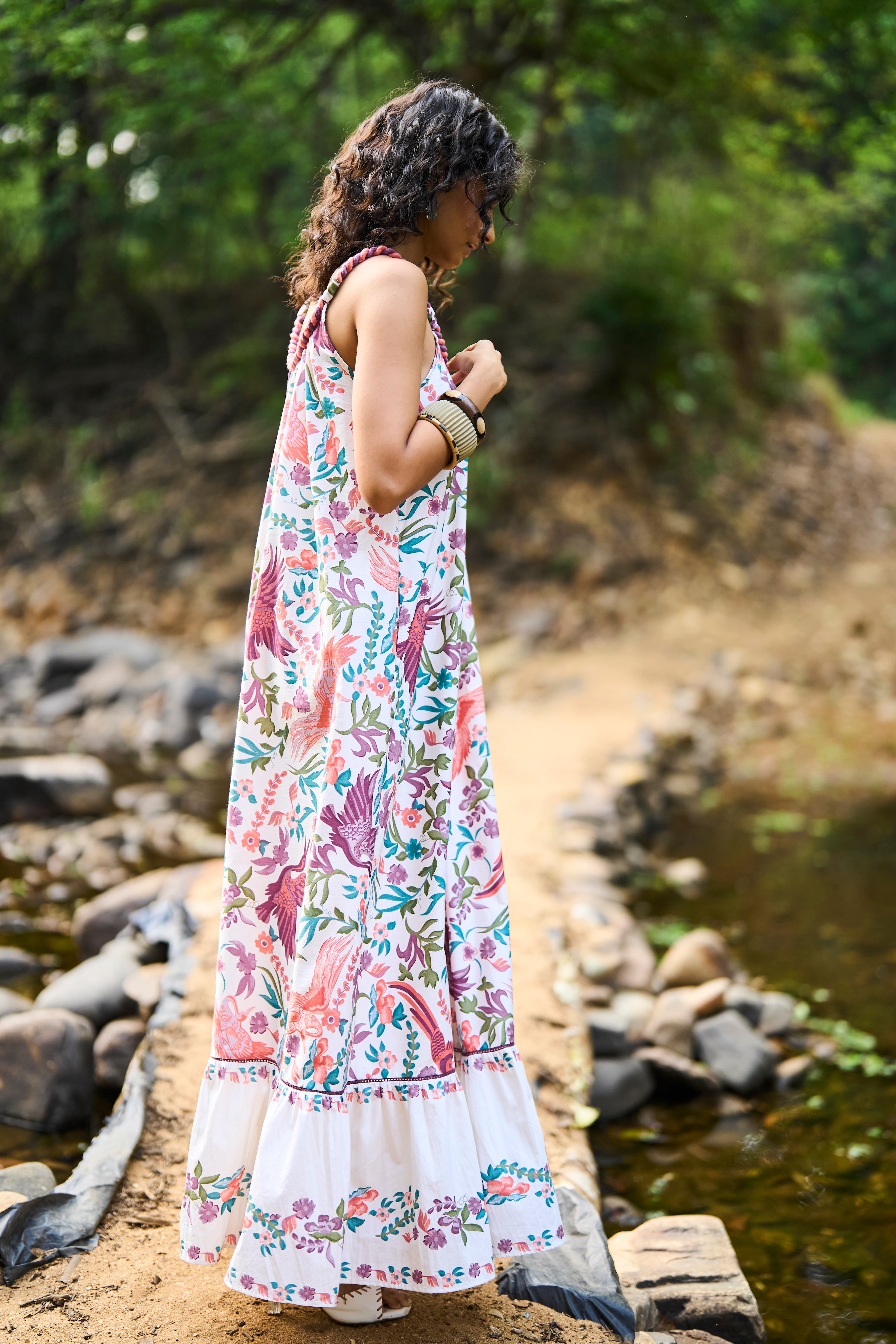 Flowing boho sleeveless maxi dress in soft pastel printed organic cotton poplin. A-line, flowing shape. Hand twisted thread and fabric rope neckline. Placed tiered panel attached with a ladder lace adds a flare at the bottom hem. Pockets in the sides.