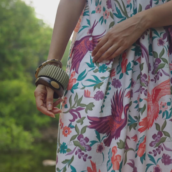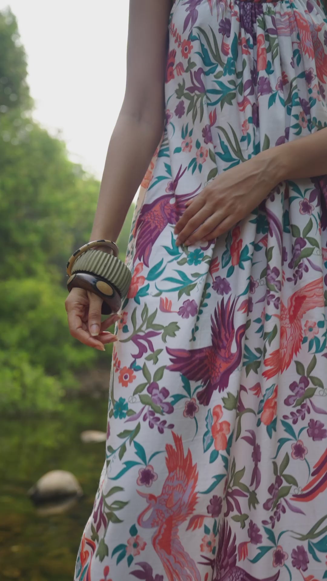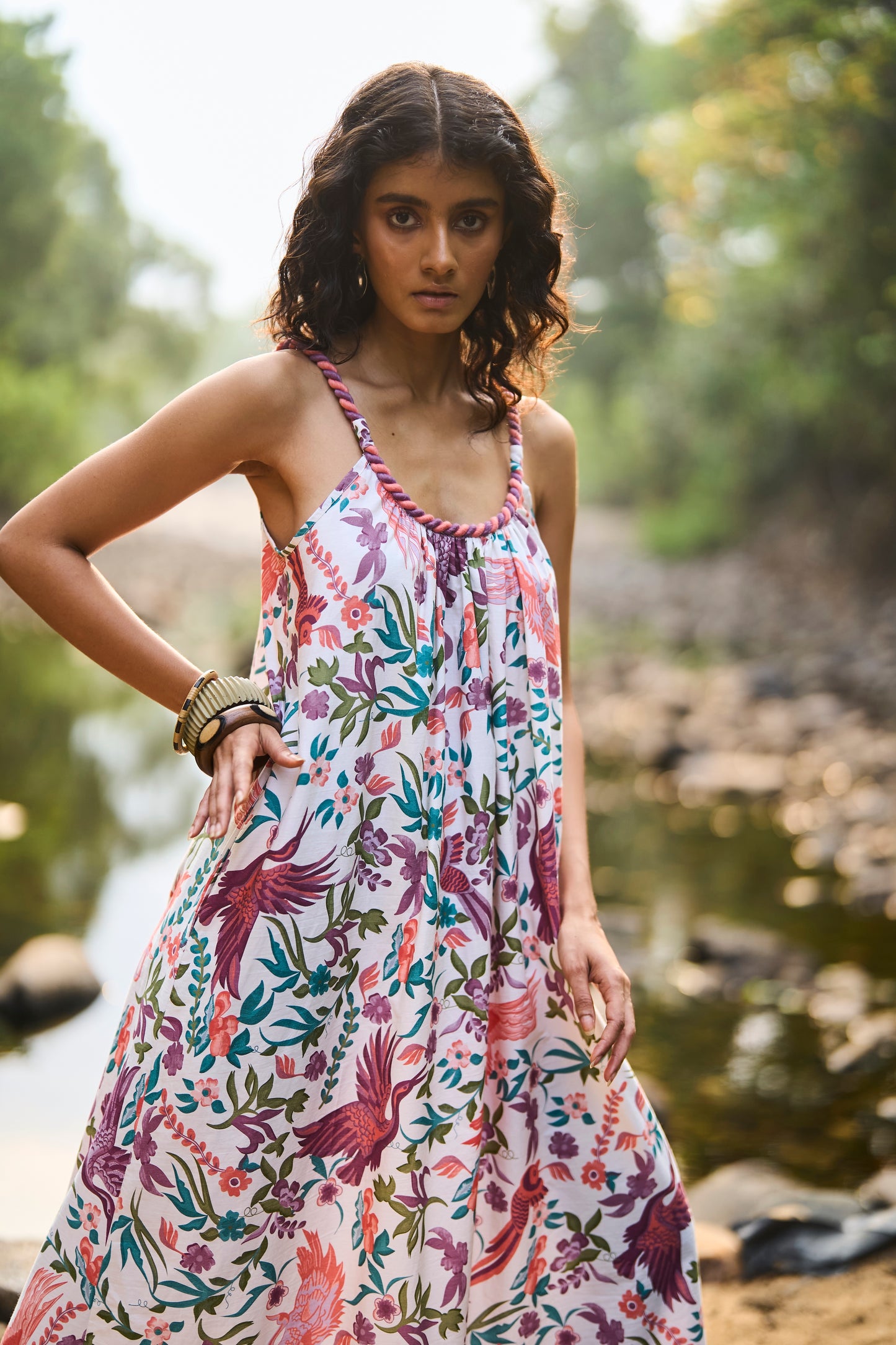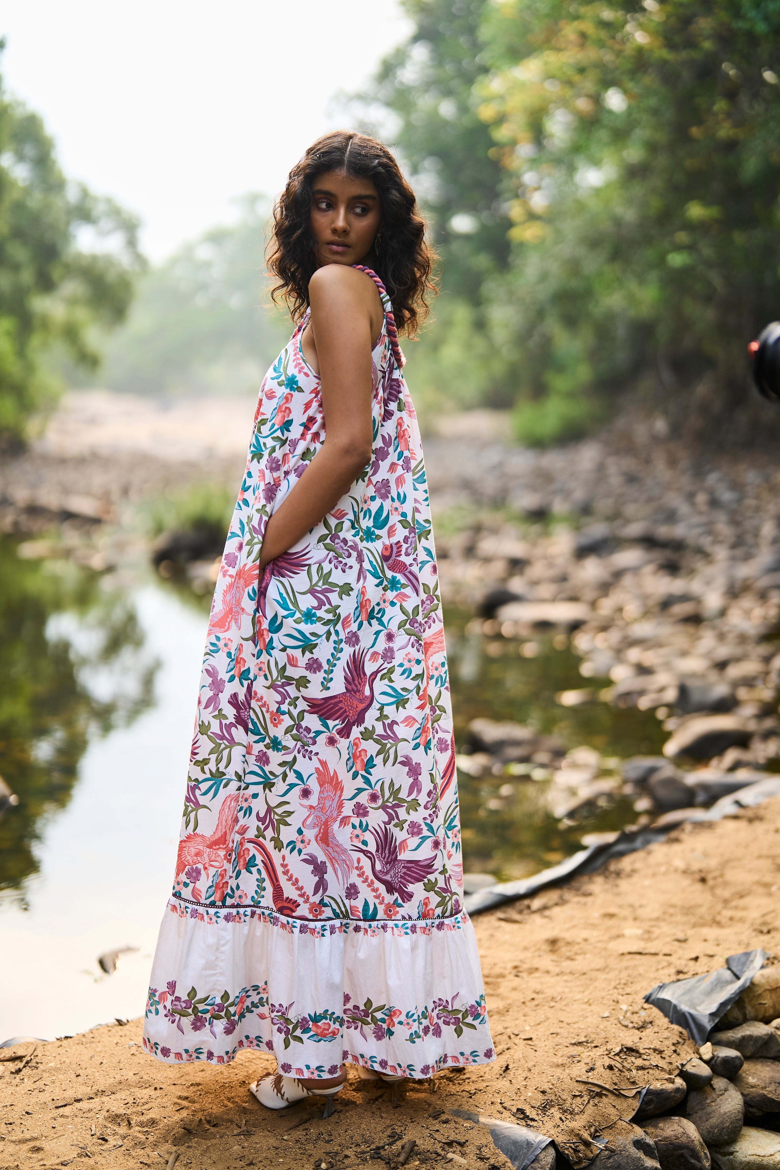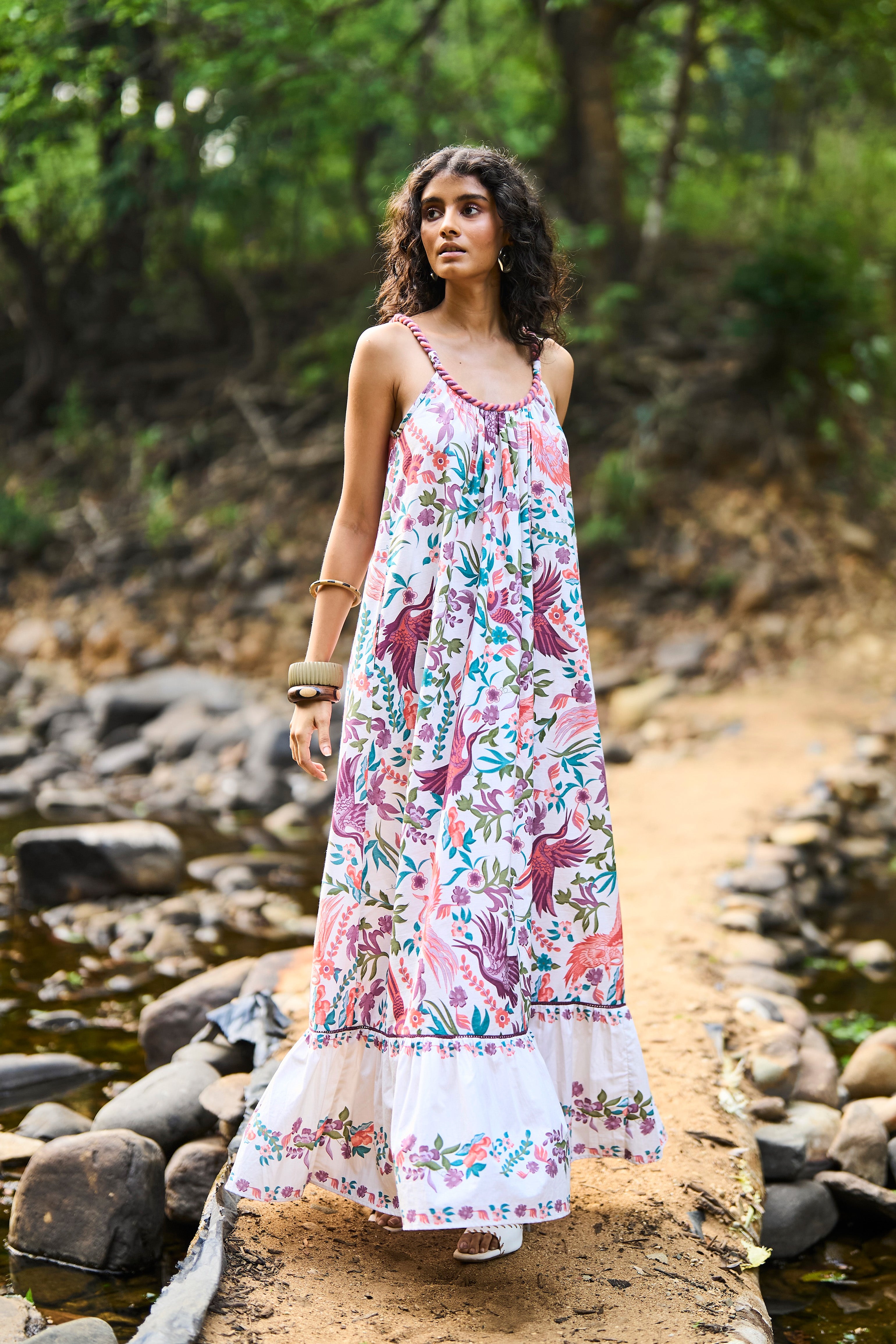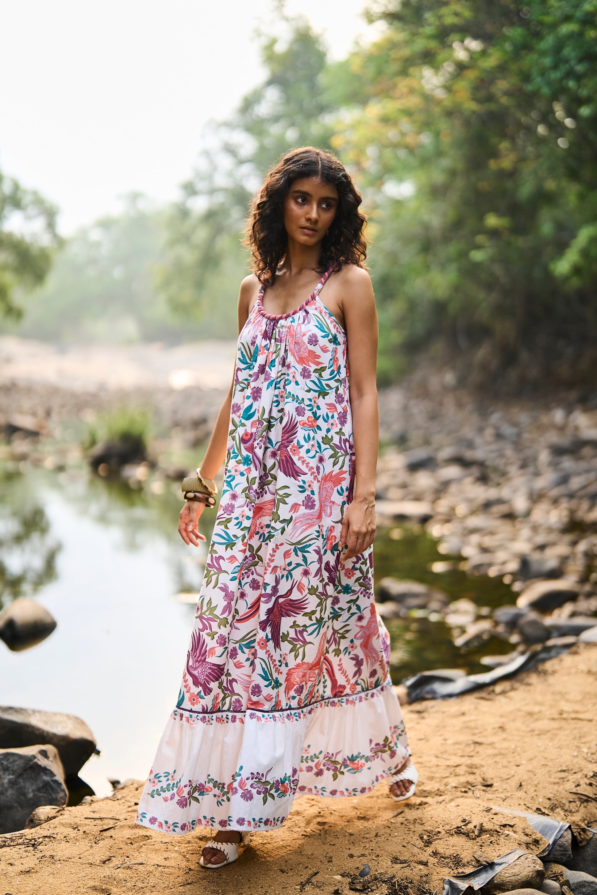 Flowing boho sleeveless maxi dress in soft pastel printed organic cotton poplin. A-line, flowing shape. Hand twisted thread and fabric rope neckline. Placed tiered panel attached with a ladder lace adds a flare at the bottom hem. Pockets in the sides.