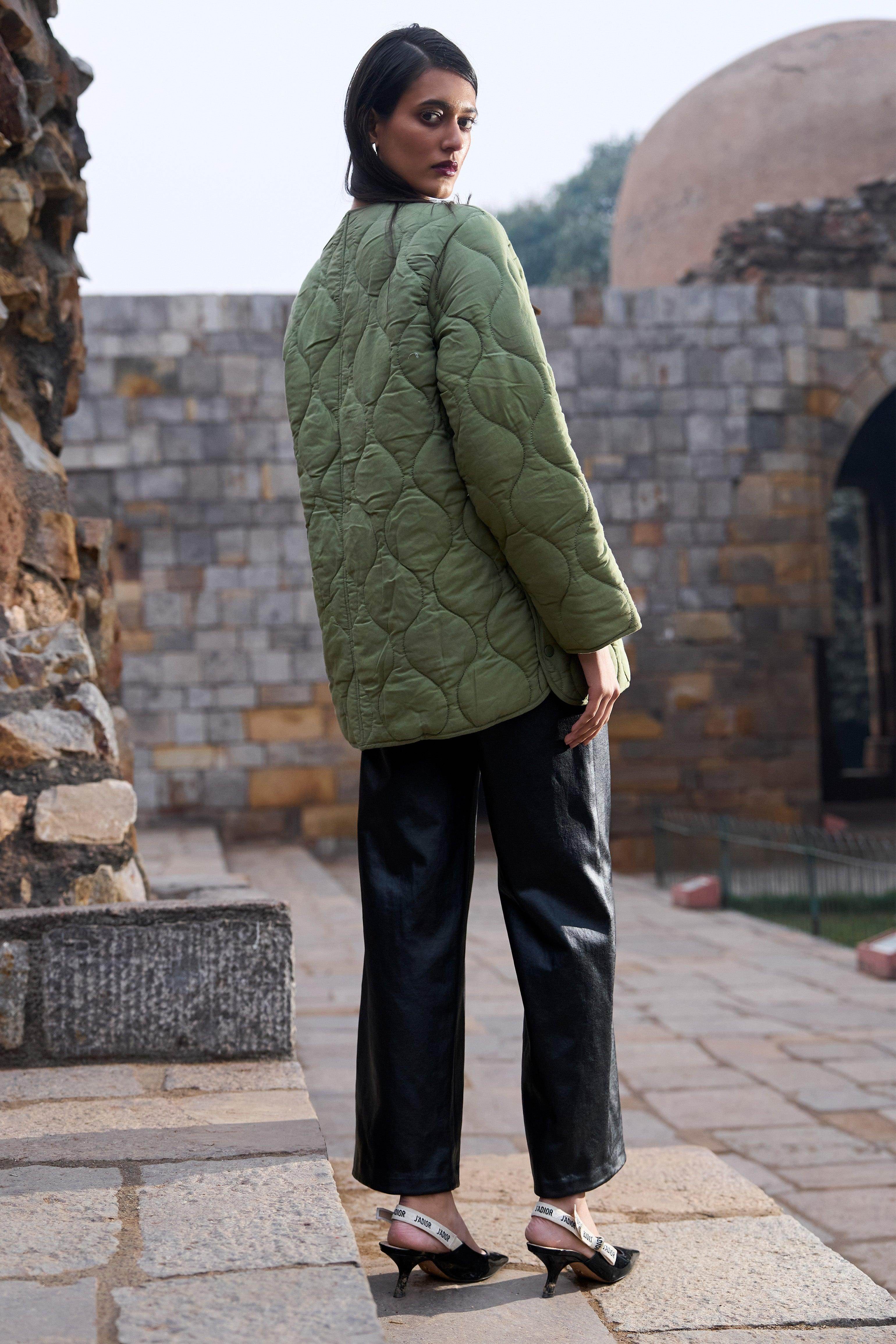 Cotton quilted jacket in a geometric pattern. Round neck, full sleeves. Snap buttons on the front and on the side vents.