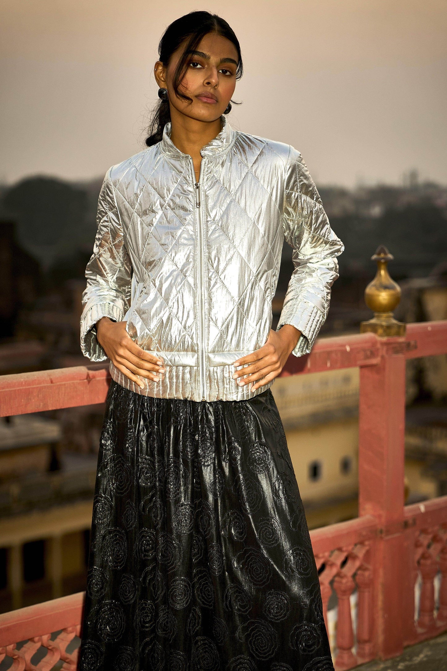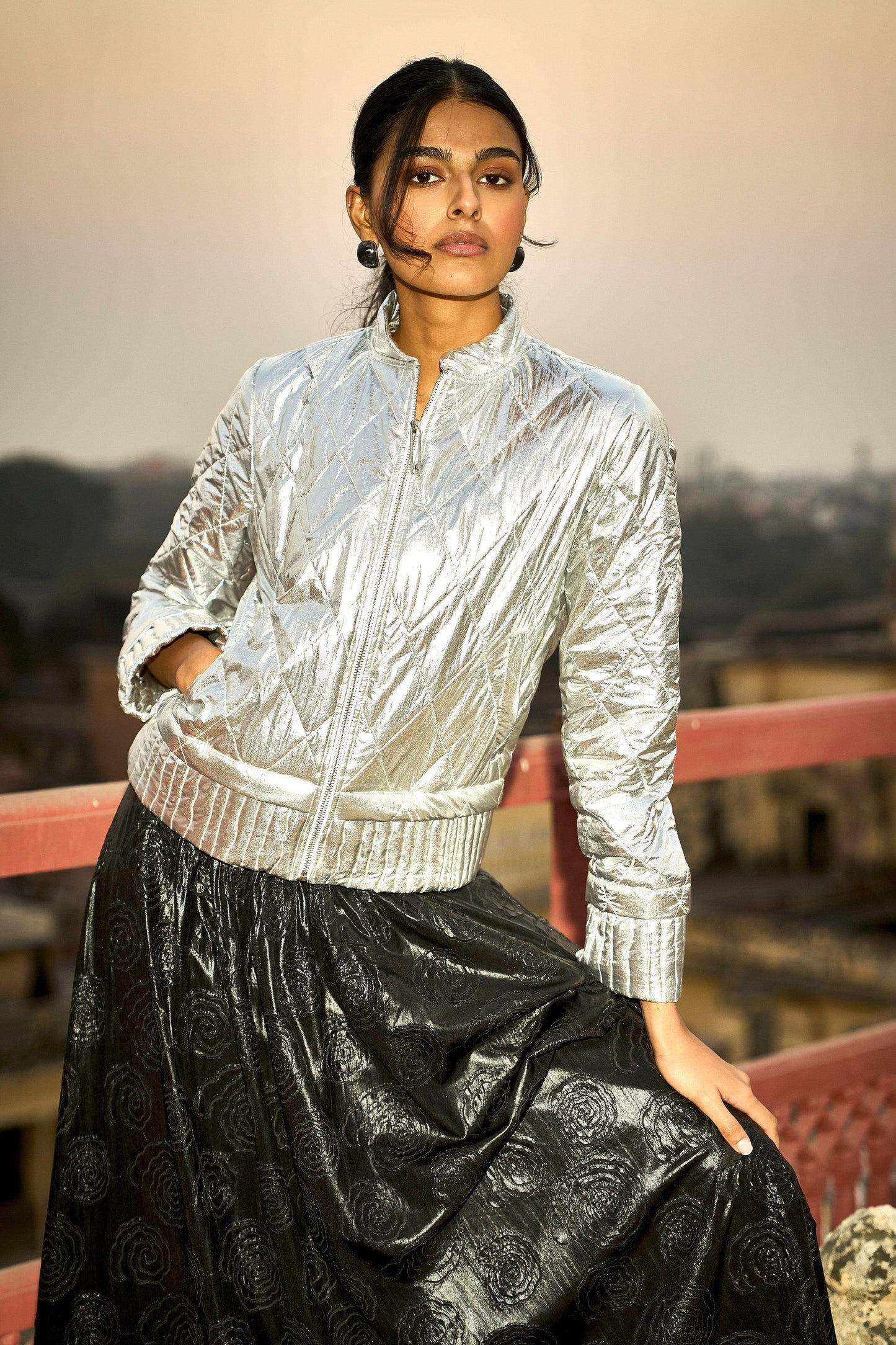 Quilted jacket in silver foil with a band collar. Allover check pattern with a stripe detail on the cuff and hem to mimic rib. Front zip closure with a safety pin design puller, and front kangaroo pockets.