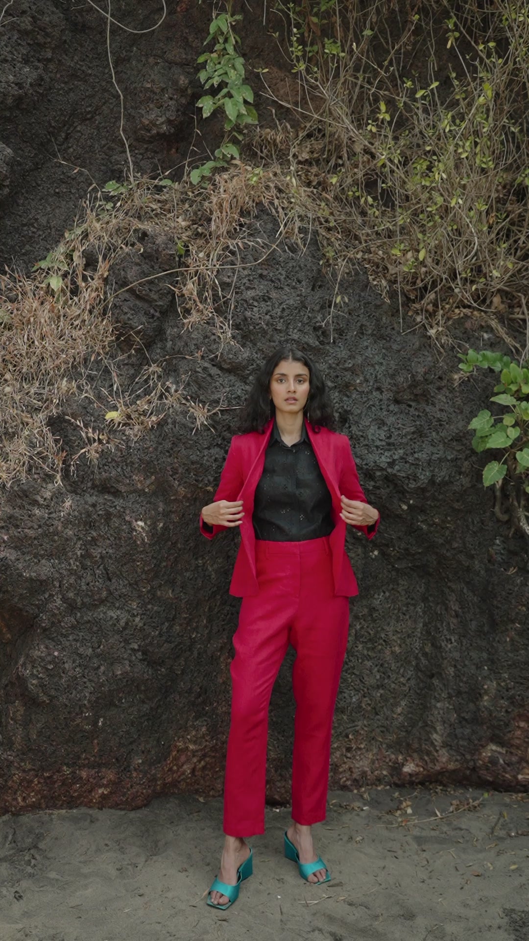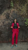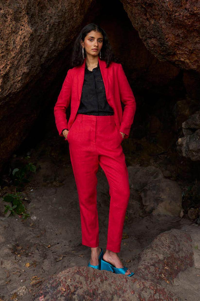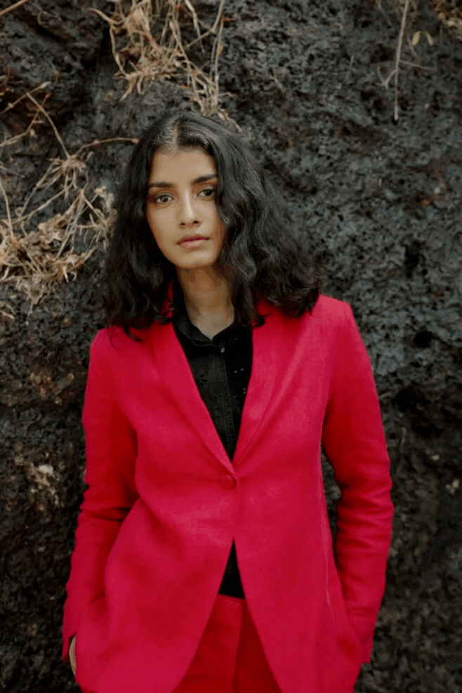 Red linen blazer with shawl collar lapel. Single button closure in the front and double vented in the back. Snap button closure on the sleeve.