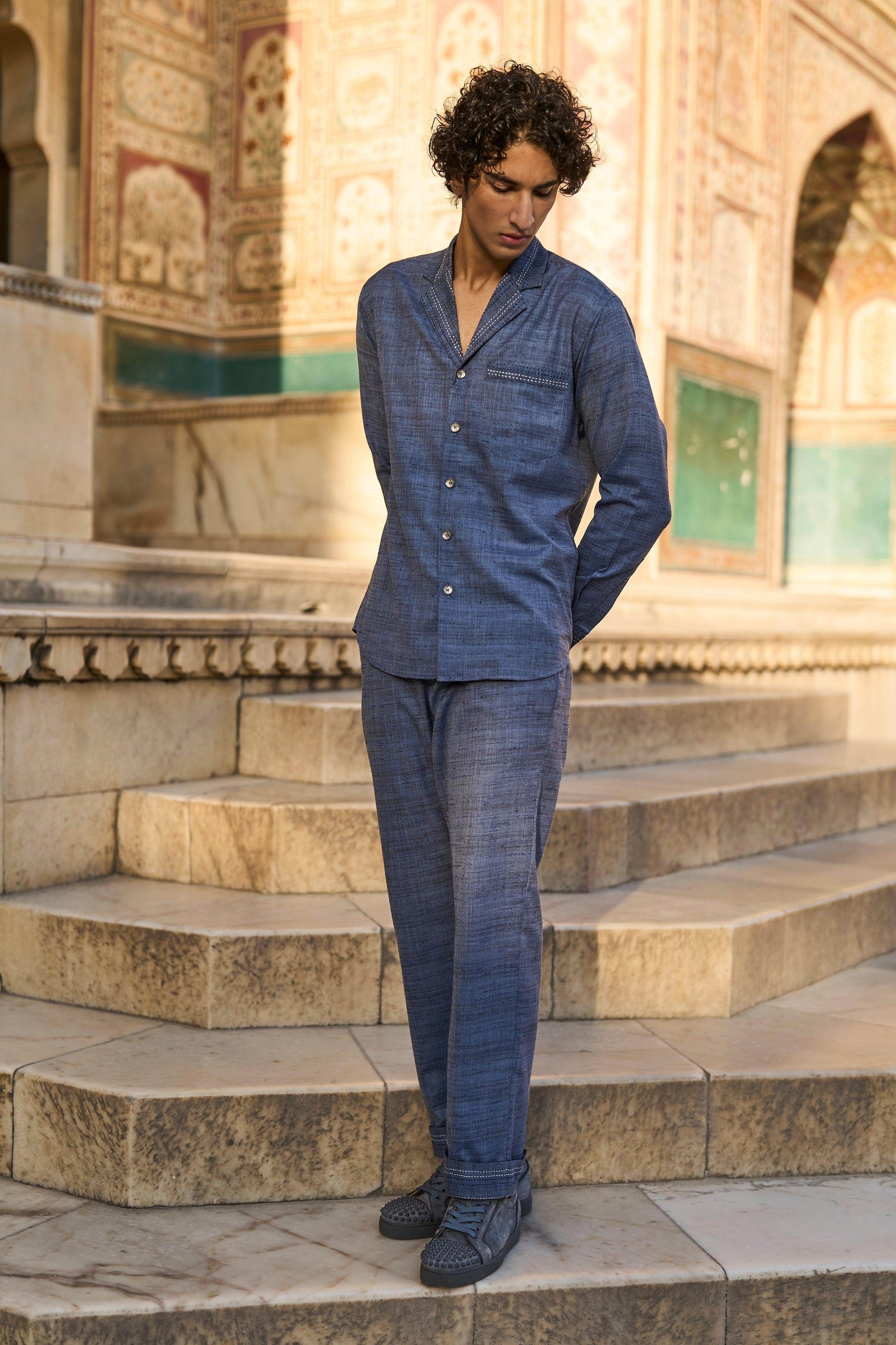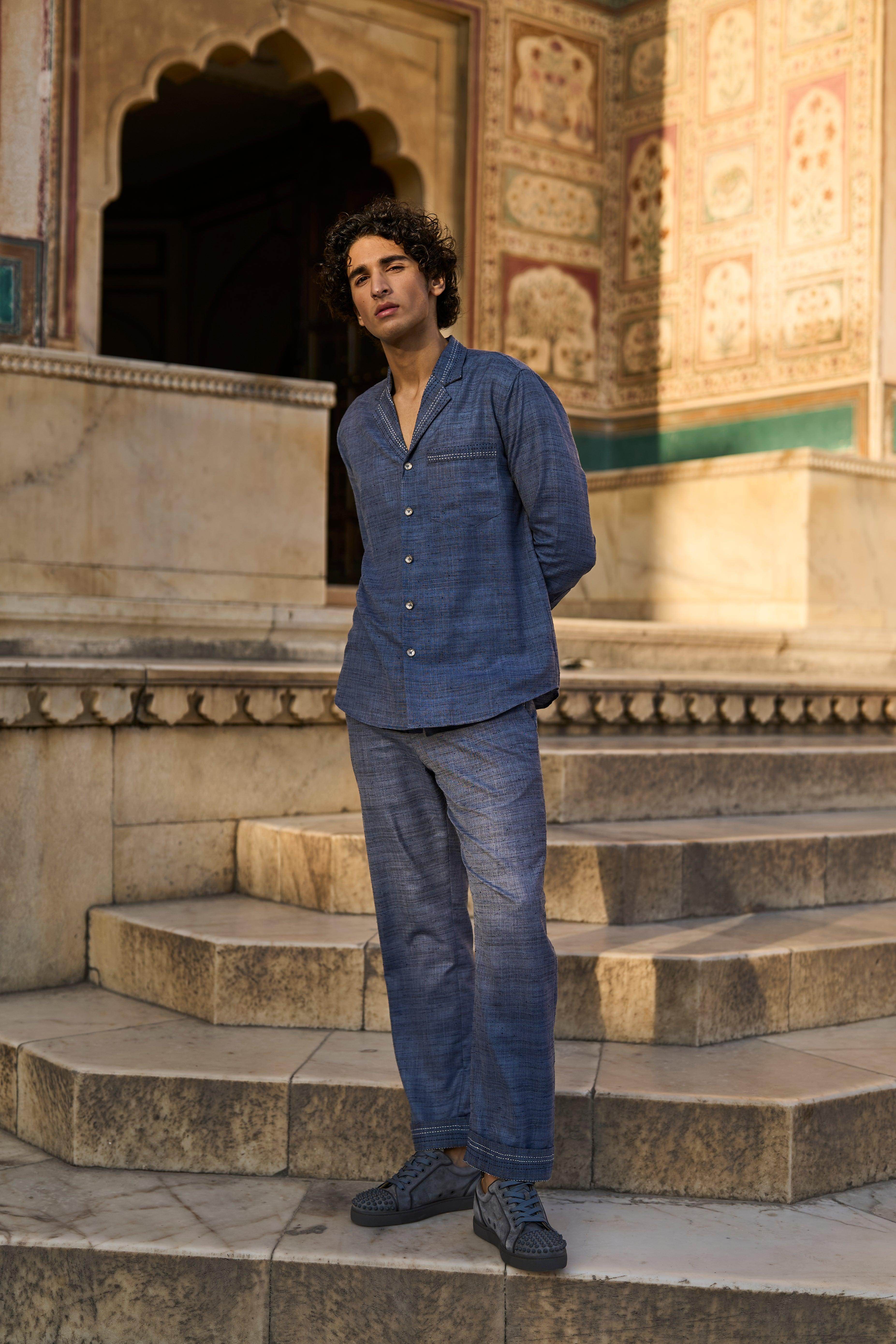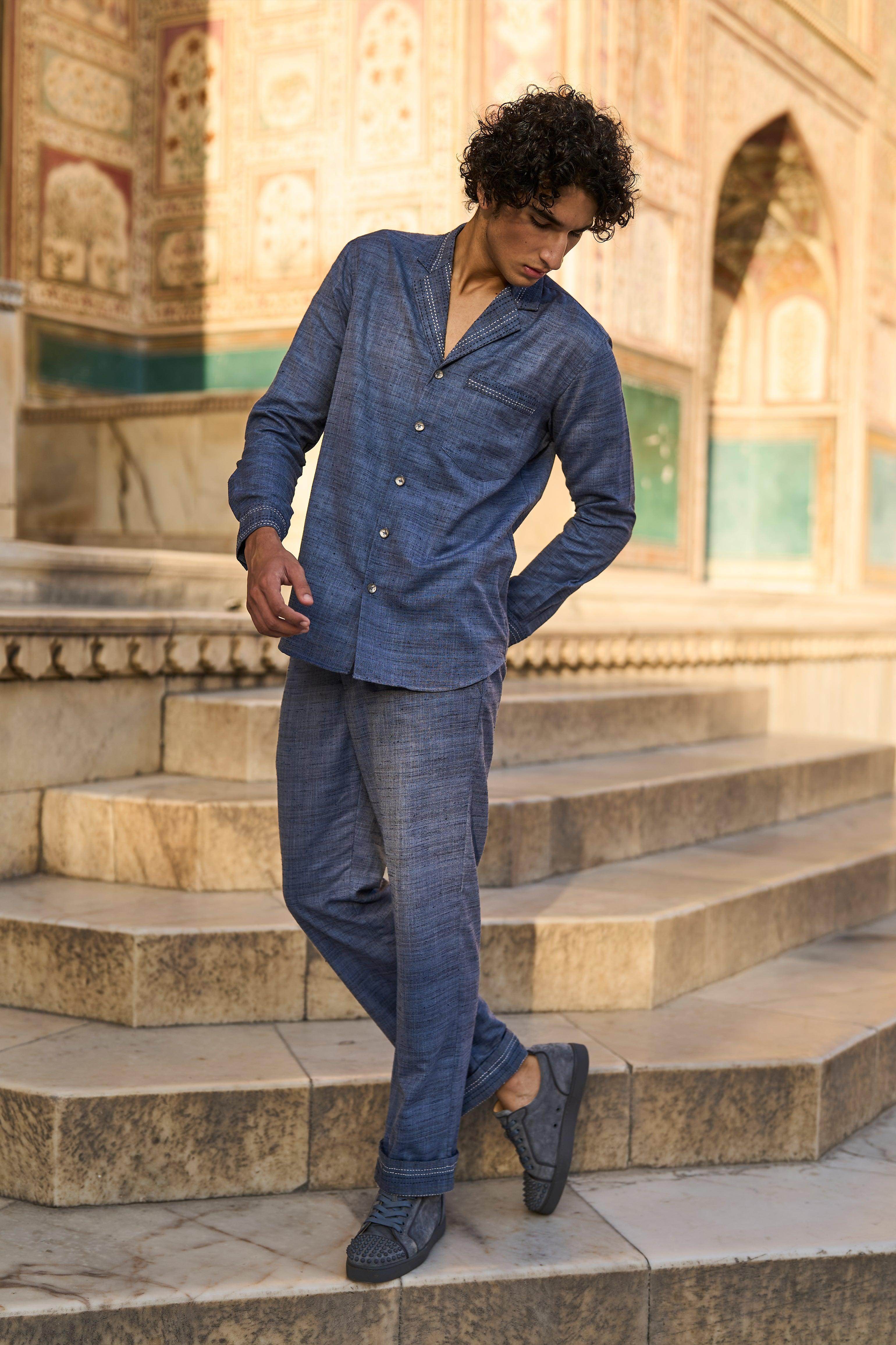 Textured slub straight pant in petrol blue with contrast kantha stitch detailing on the pocket and turn up cuff. Belt loops, hook/eye, and zip closure in the front. Pockets in the sides and back.