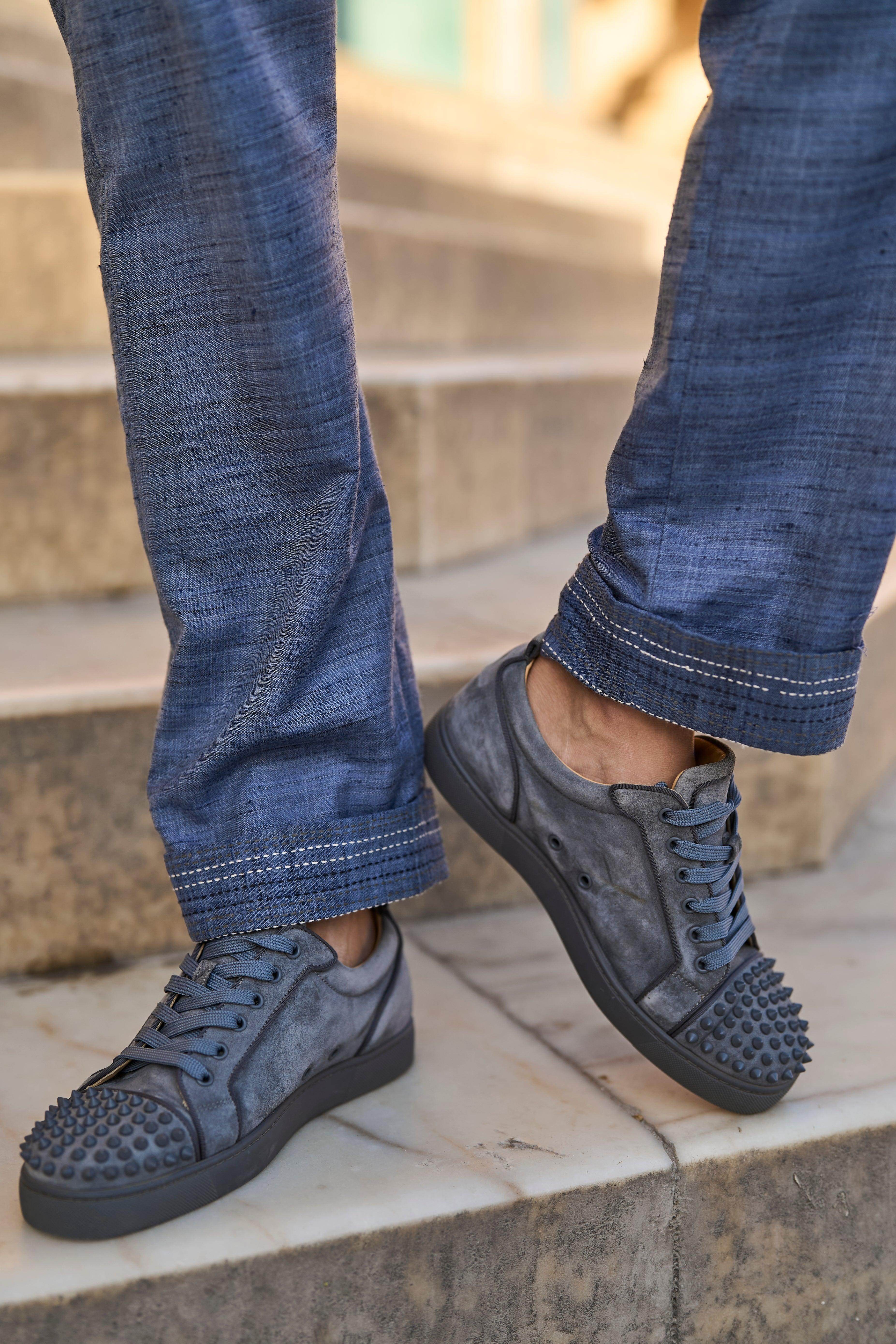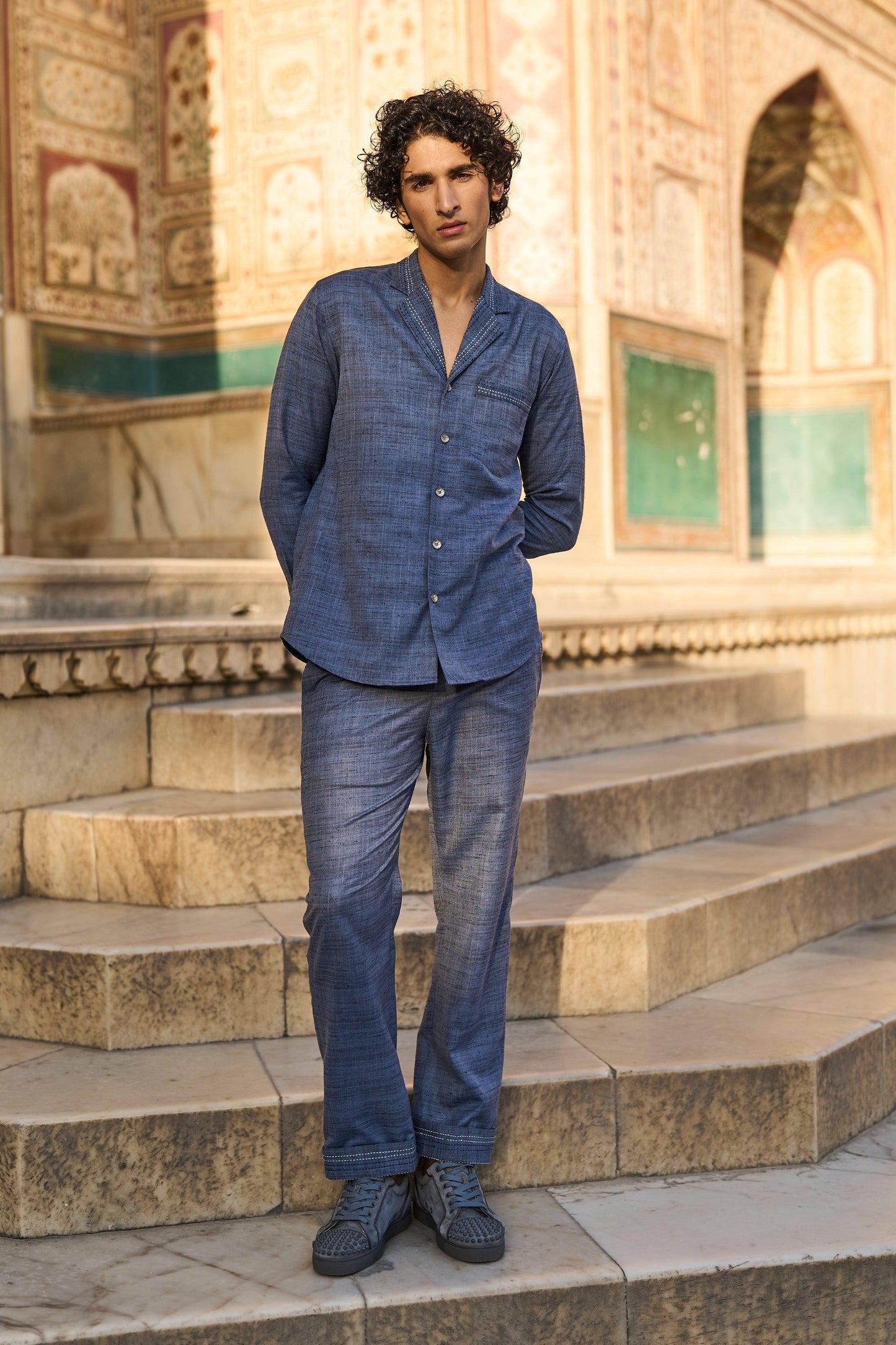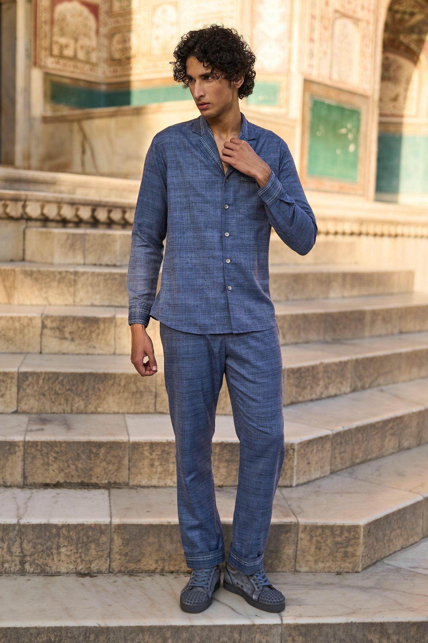 Textured slub straight pant in petrol blue with contrast kantha stitch detailing on the pocket and turn up cuff. Belt loops, hook/eye, and zip closure in the front. Pockets in the sides and back.