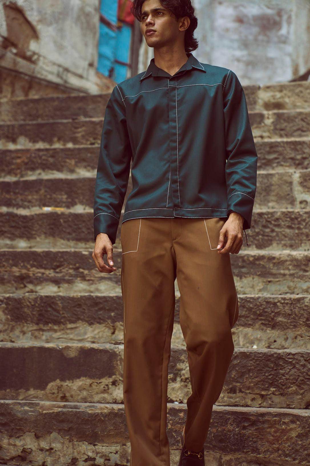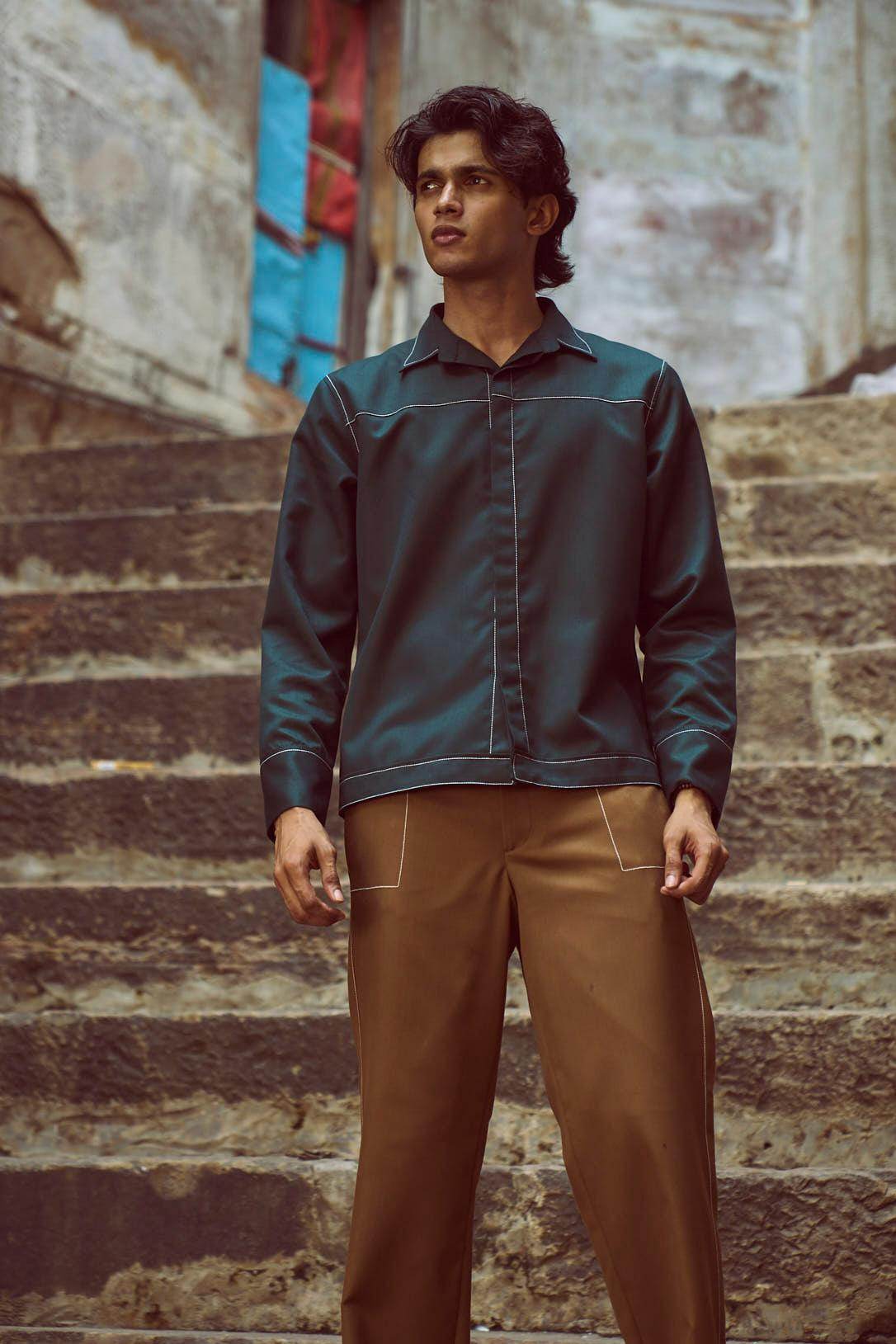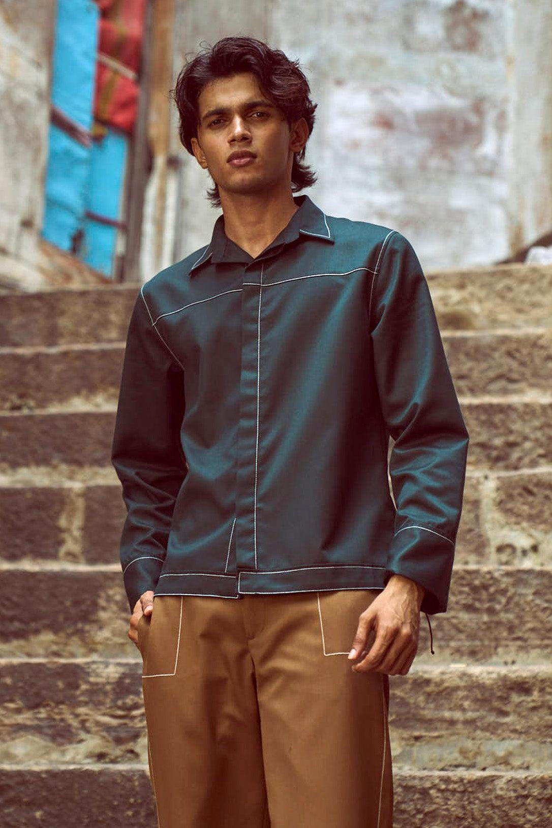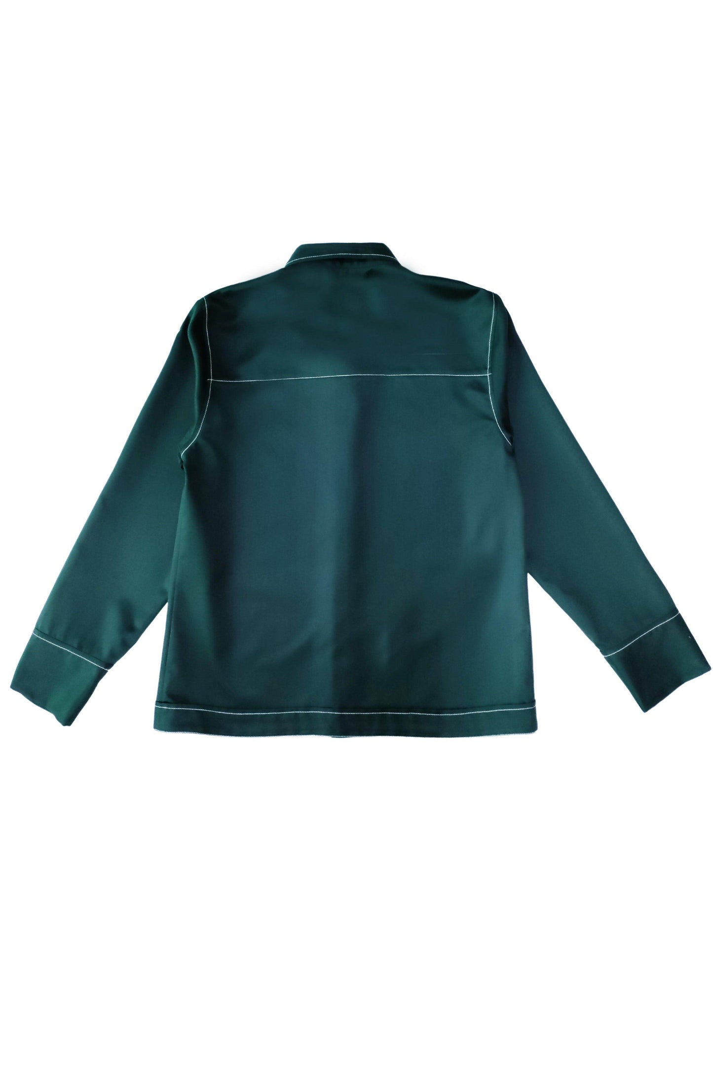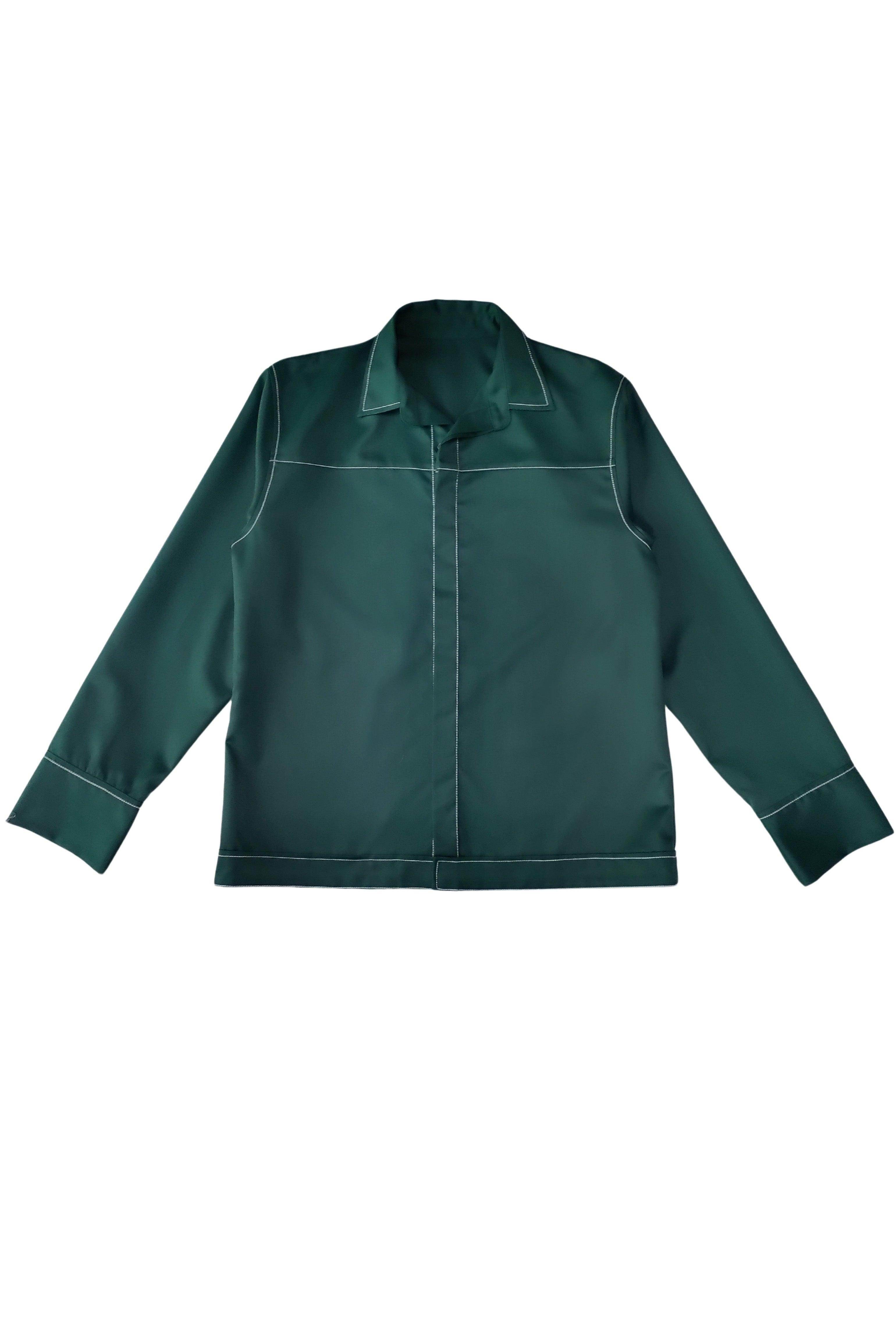 Forest green long-sleeved shirt in all weather suiting material. Contrast running rice stitch lines strategically placed on front, back, and sleeve cuffs. Concealed placket. Regular fit.