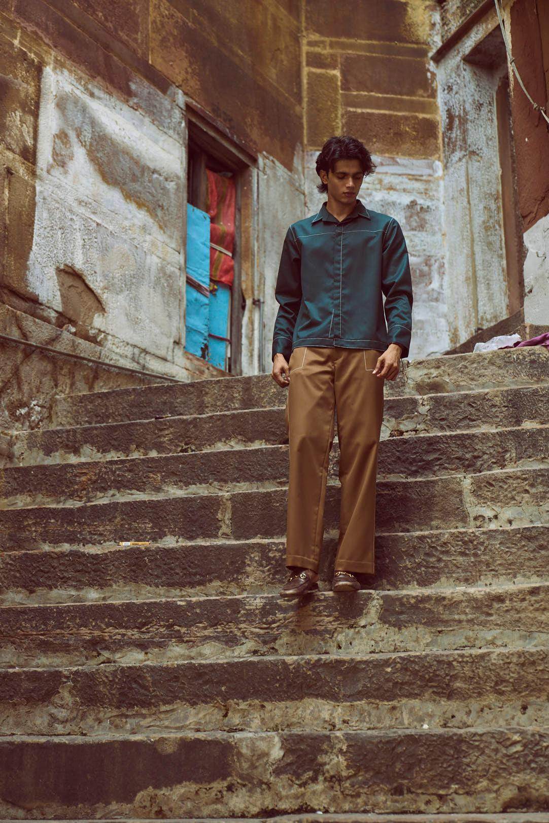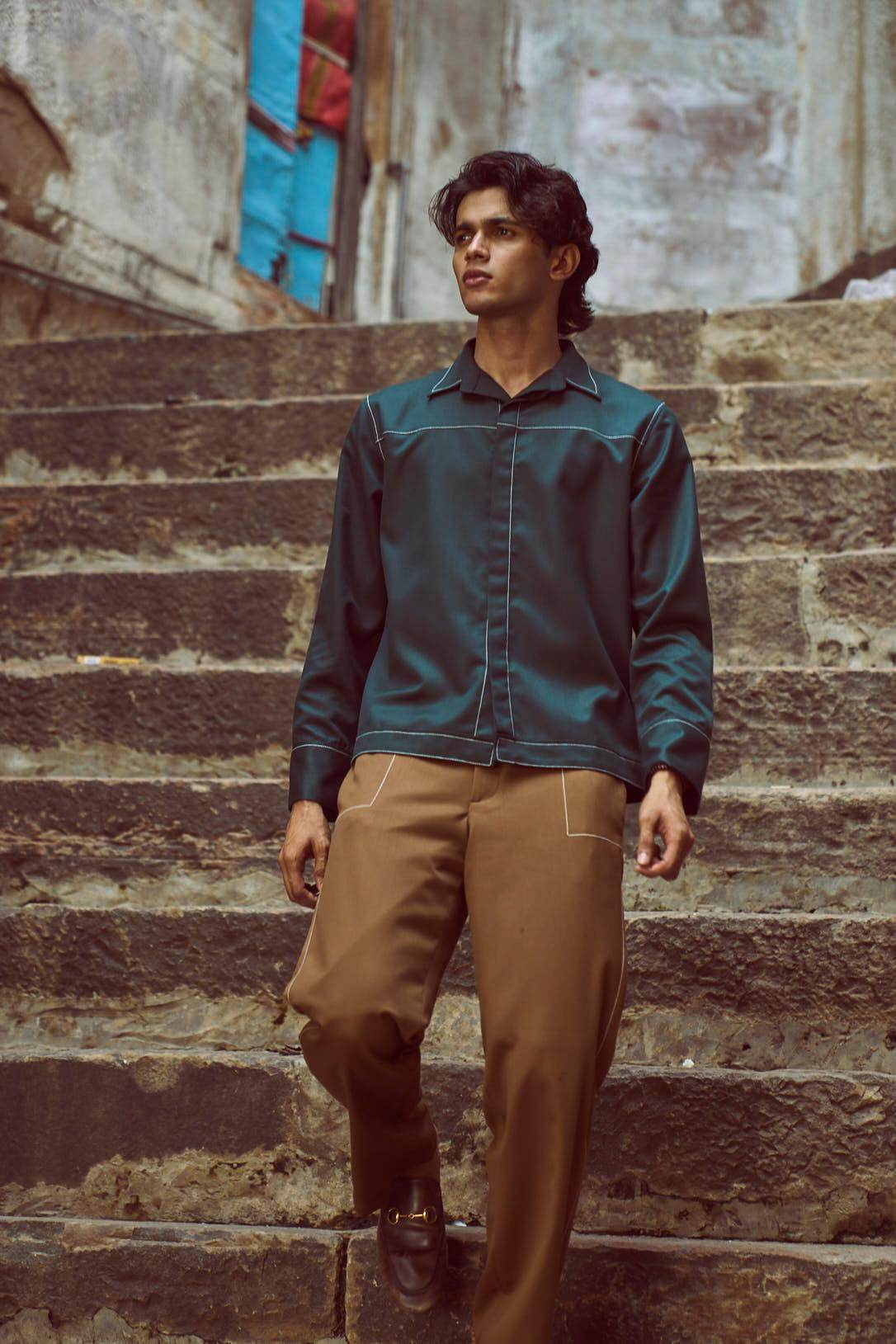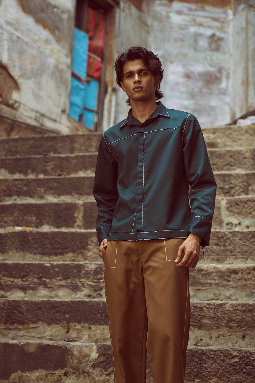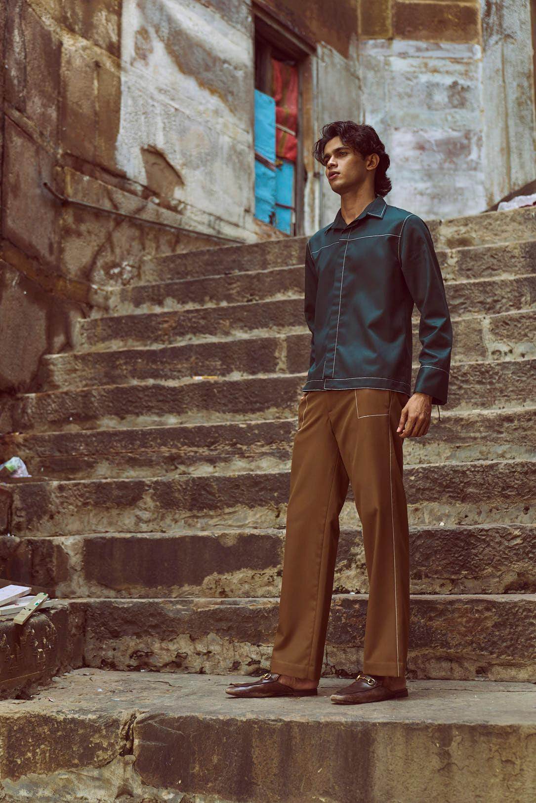 Forest green long-sleeved shirt in all weather suiting material. Contrast running rice stitch lines strategically placed on front, back, and sleeve cuffs. Concealed placket. Regular fit.