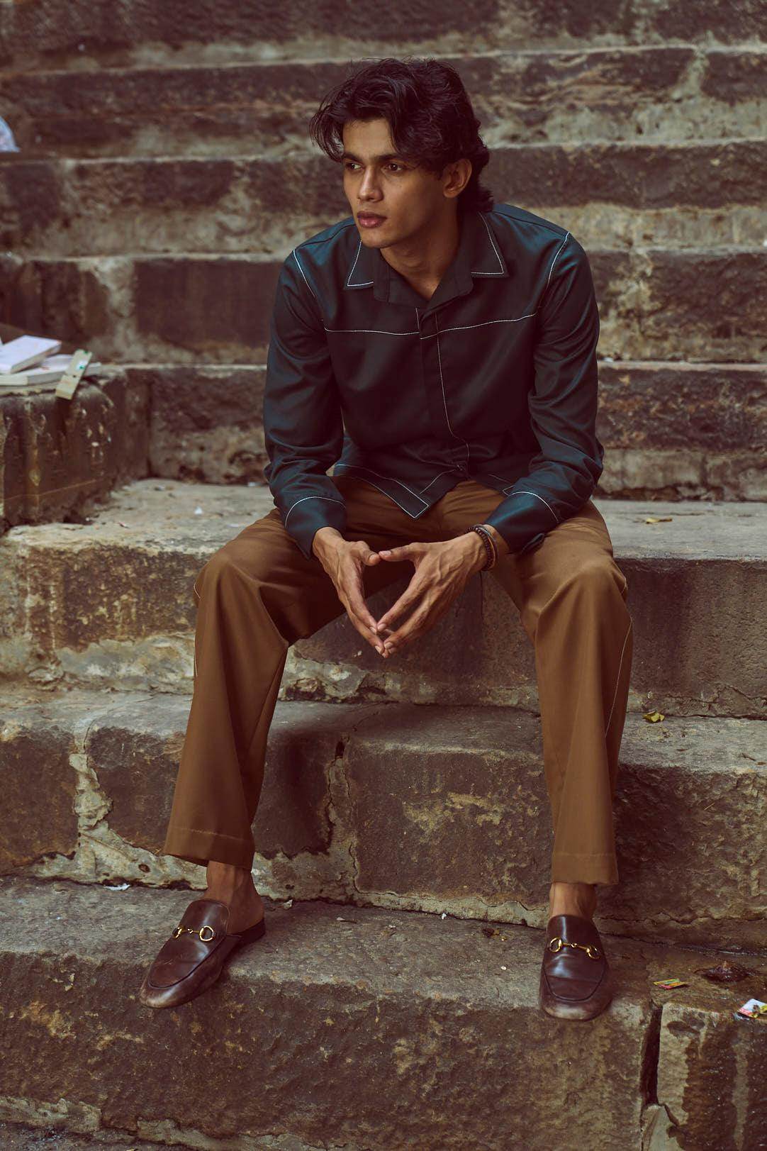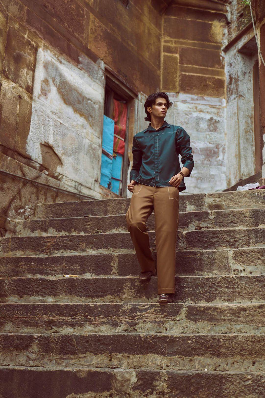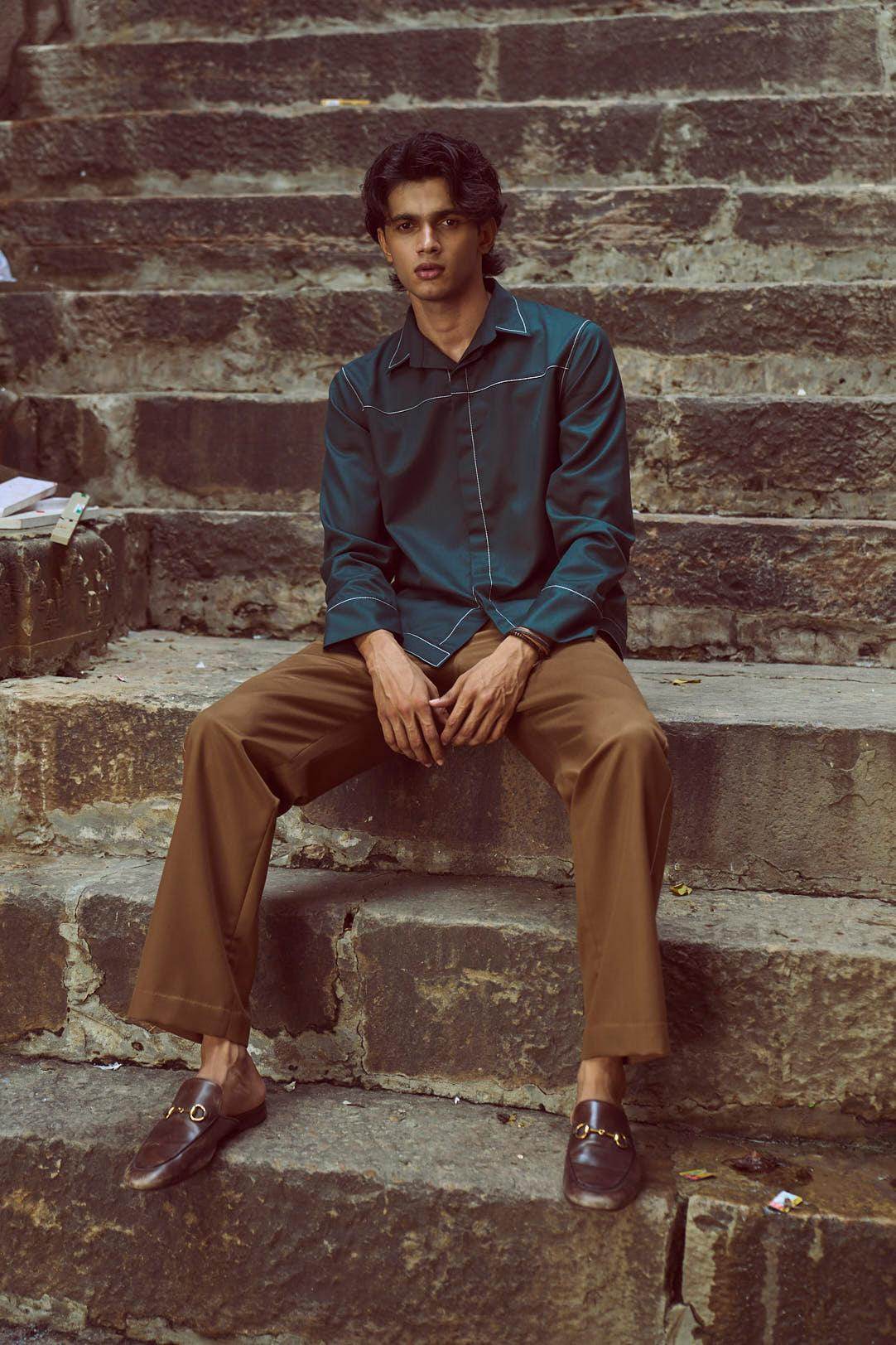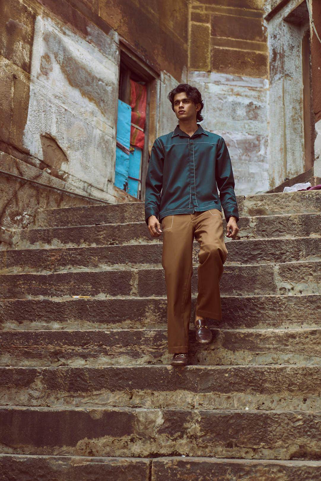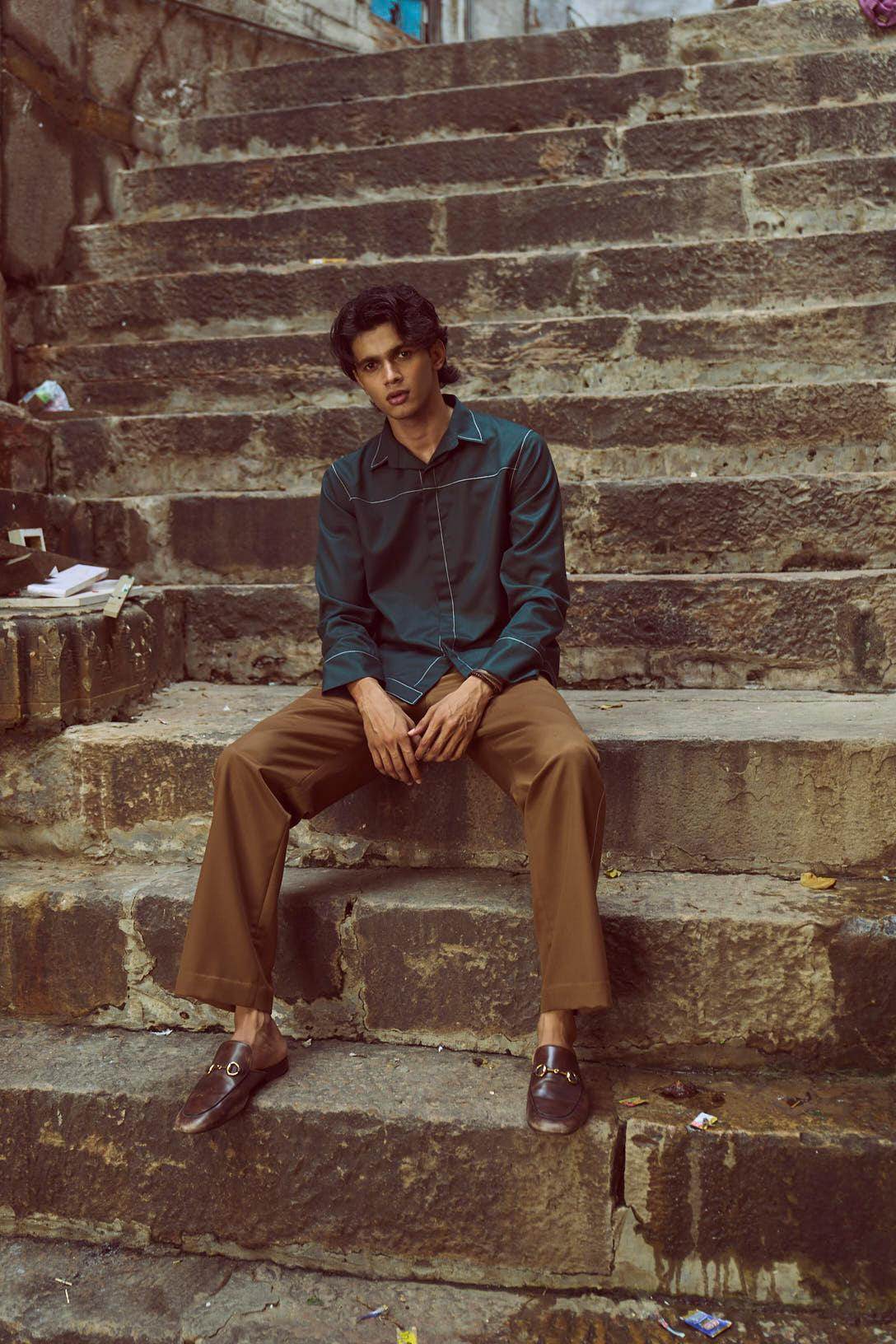 Forest green long-sleeved shirt in all weather suiting material. Contrast running rice stitch lines strategically placed on front, back, and sleeve cuffs. Concealed placket. Regular fit.