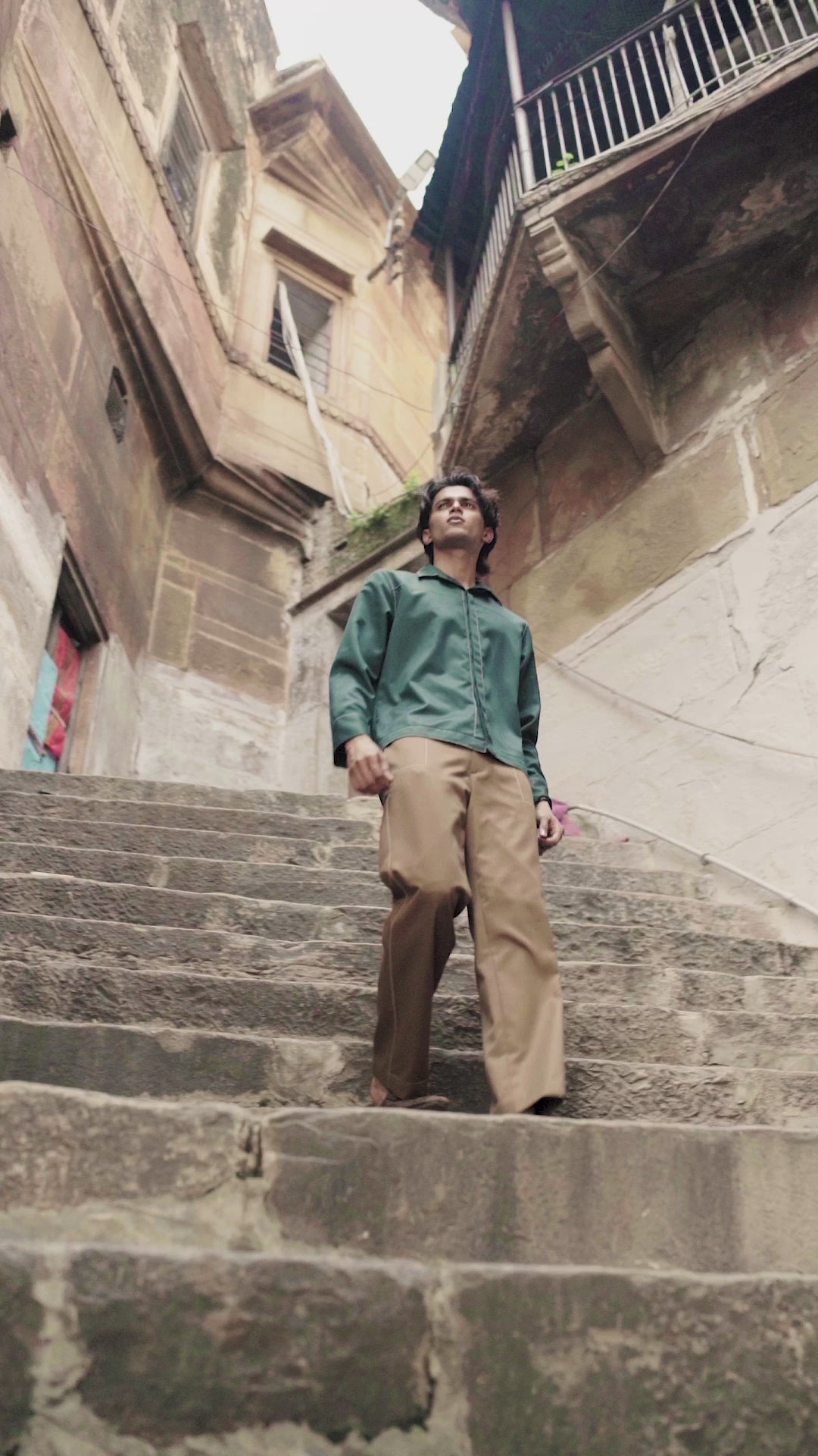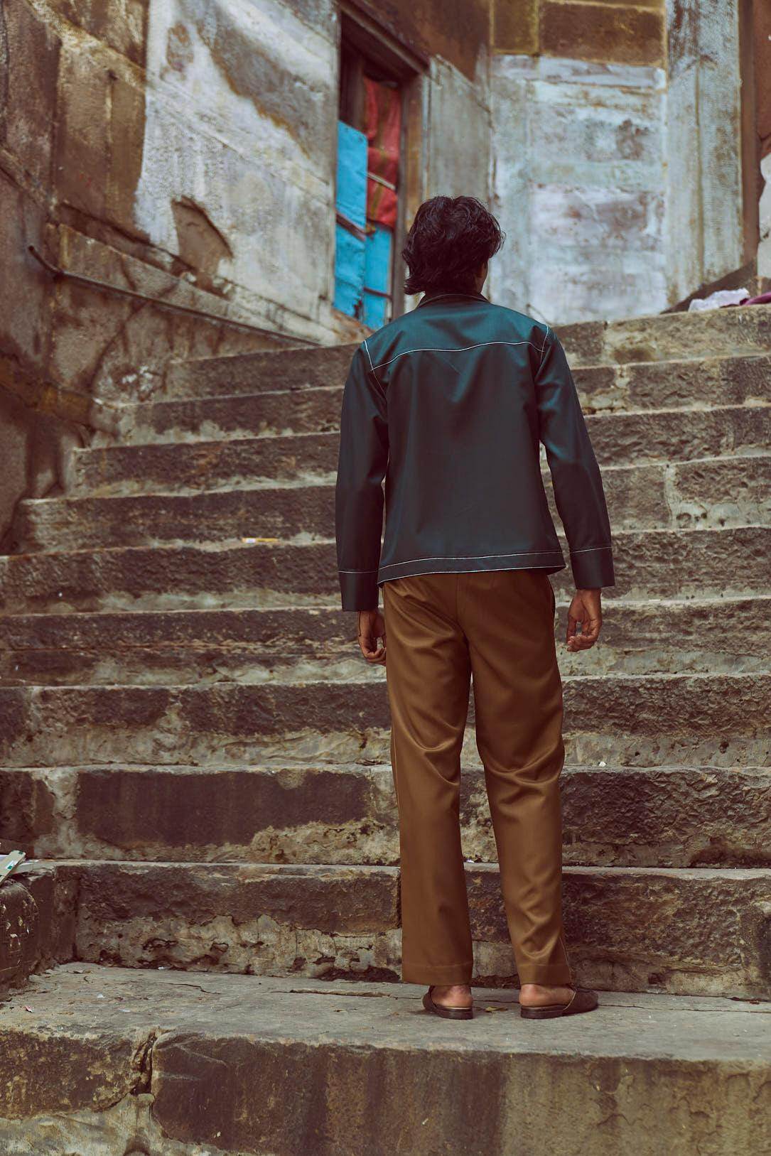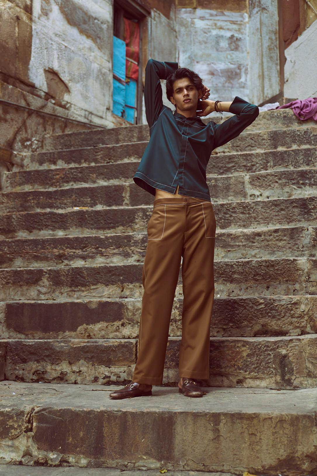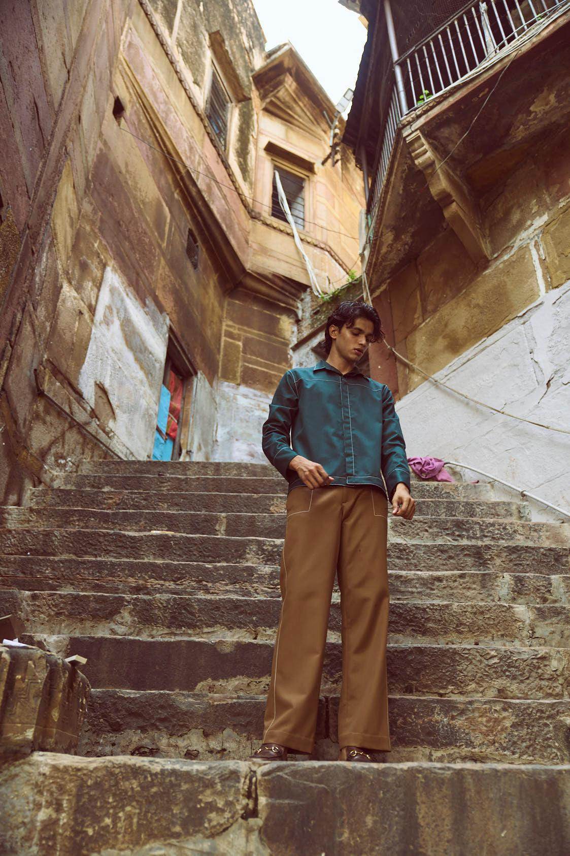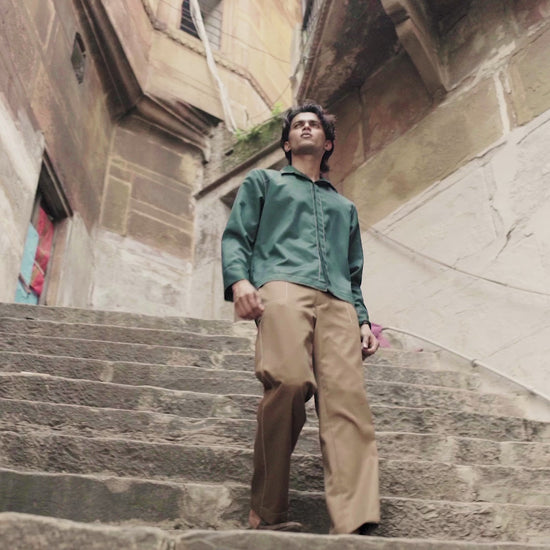 Forest green long-sleeved shirt in all weather suiting material. Contrast running rice stitch lines strategically placed on front, back, and sleeve cuffs. Concealed placket. Regular fit.