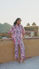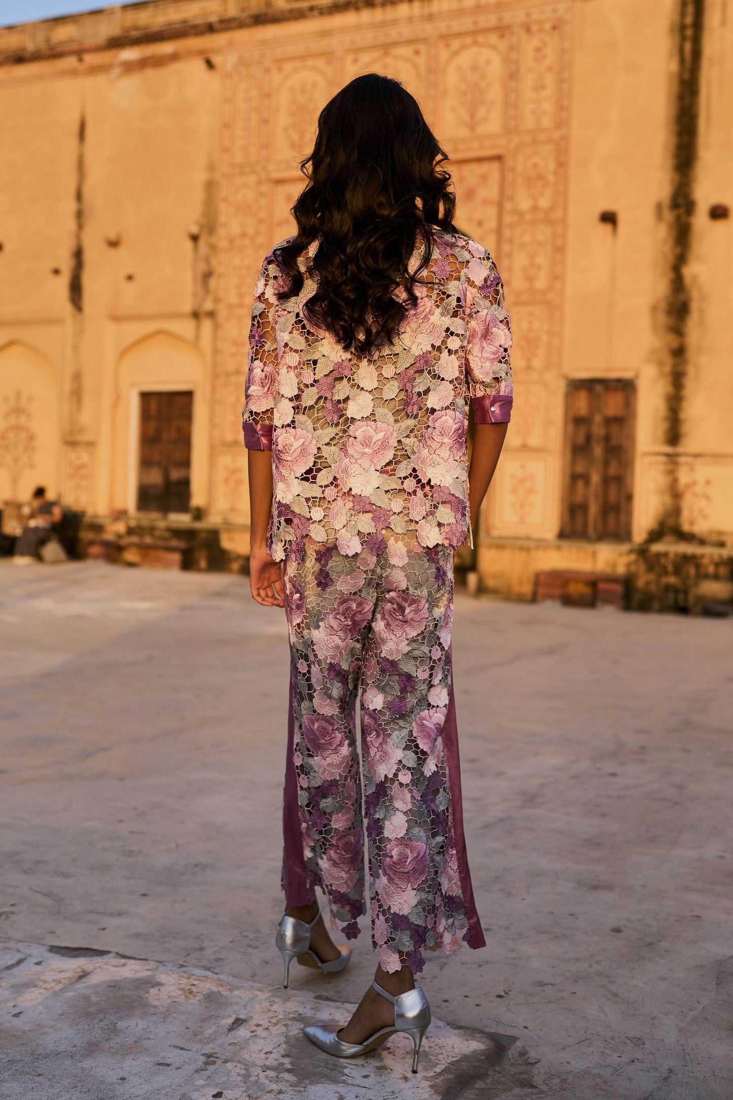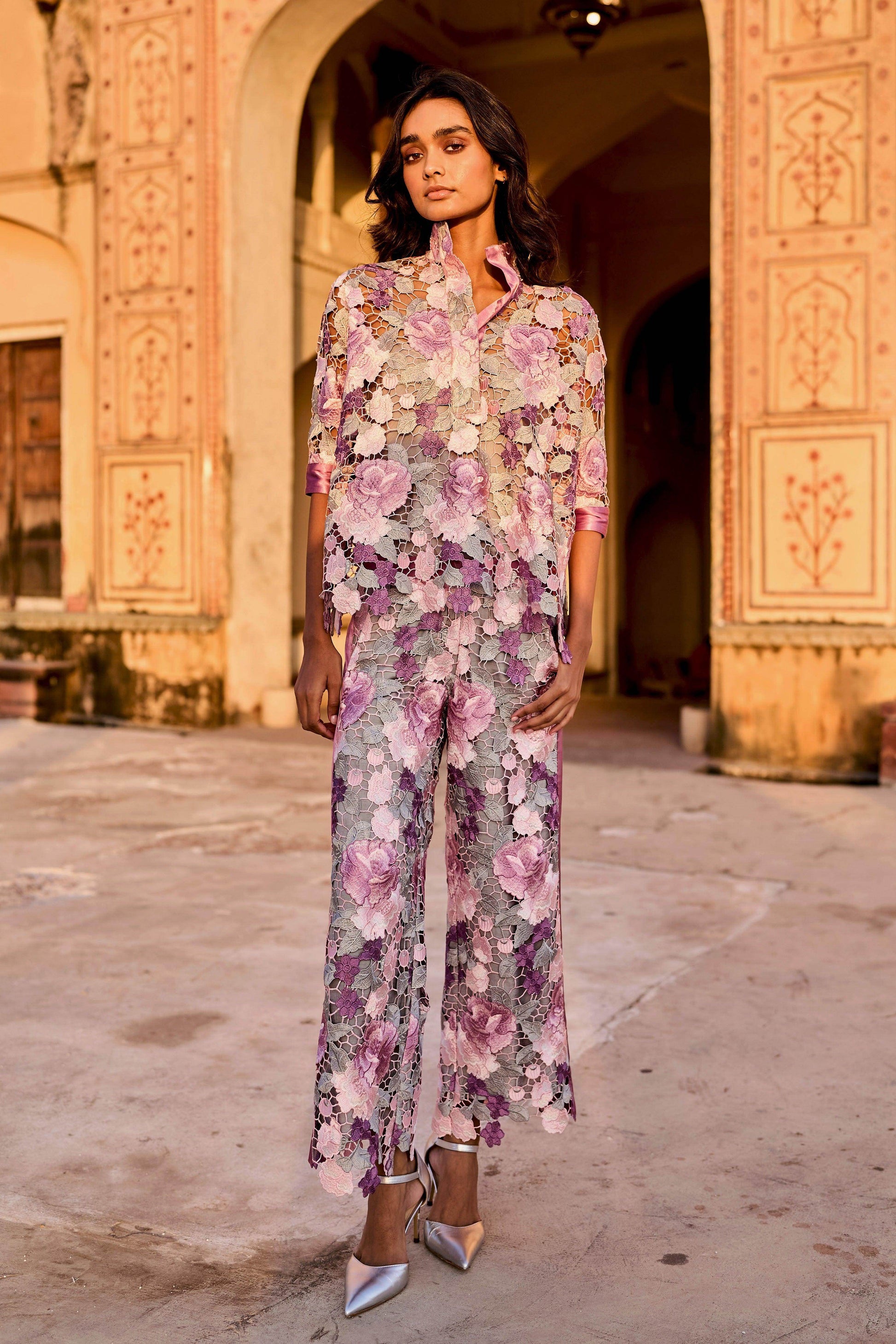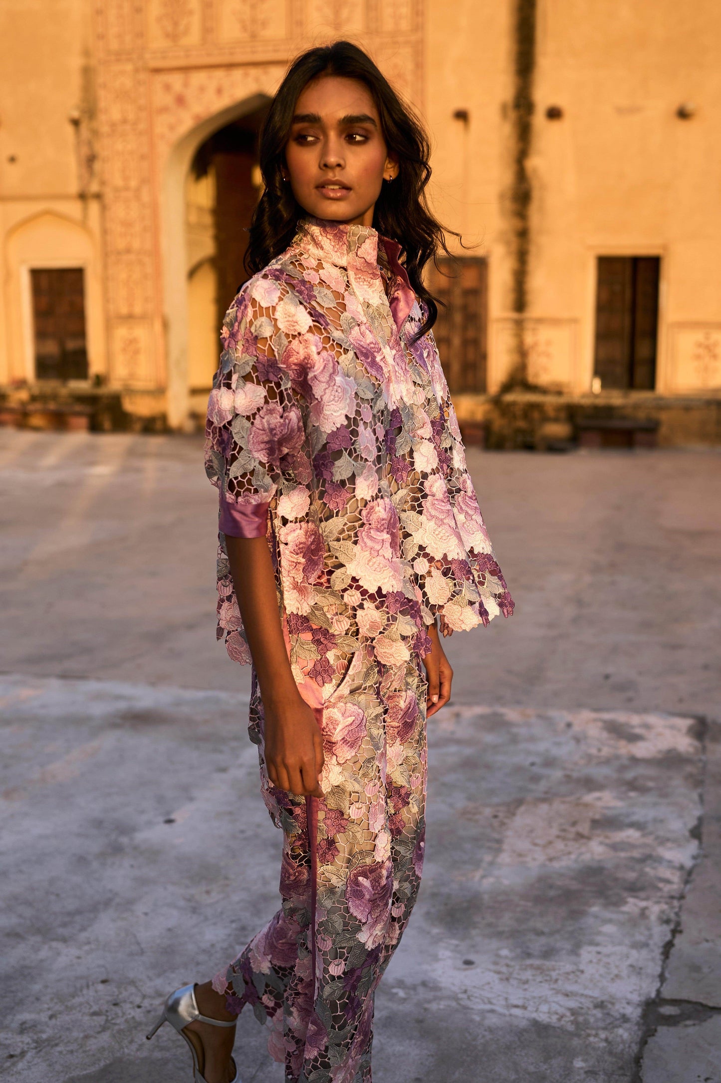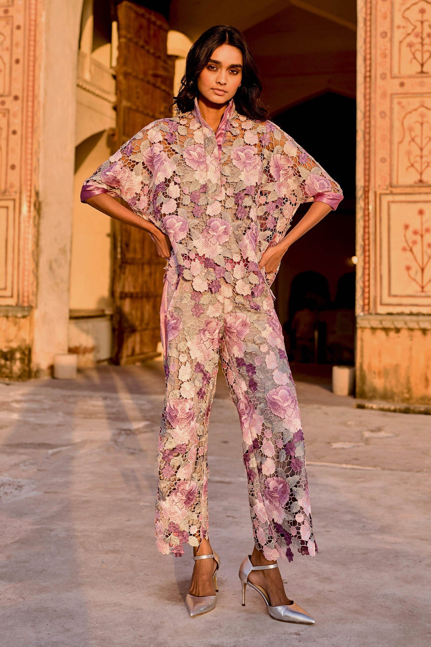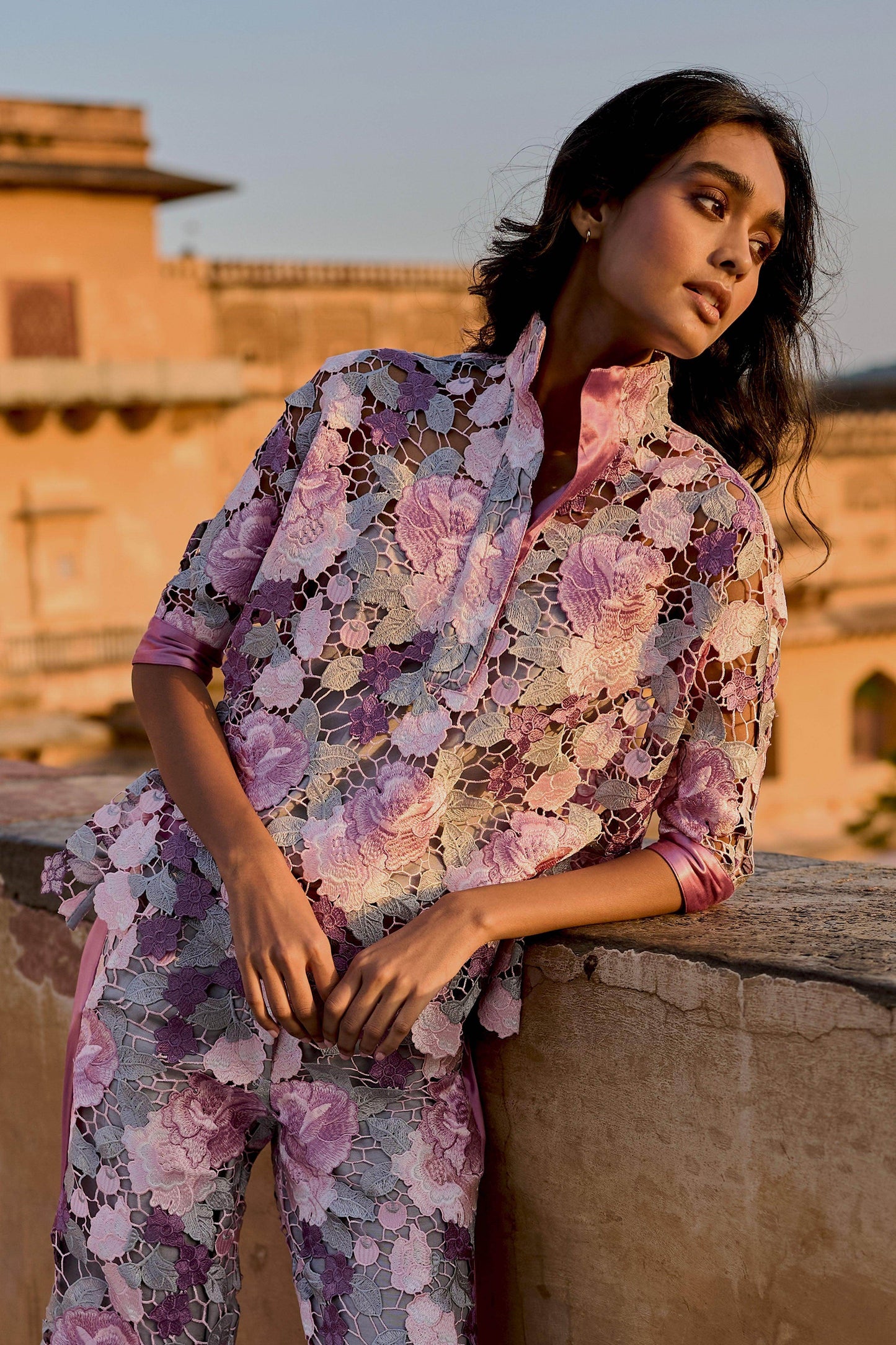 Delicate cutwork floral lace in tones of lavender and fuchsia with grey accents. Boxy lace top has scalloped hem, fuchsia fabric detailing on the collar and cuff. Band collar, cropped sleeves. Popover top with concealed hook and eye buttons. Comes with a slip. Paired with matching straight pant that has a scalloped hem, fuchsia fabric detailing on the waistband and side seams. Hook/eye and zip closure in the front, pockets in the sides. Garment is fully lined.
