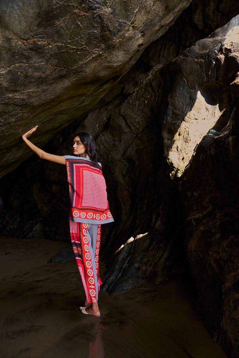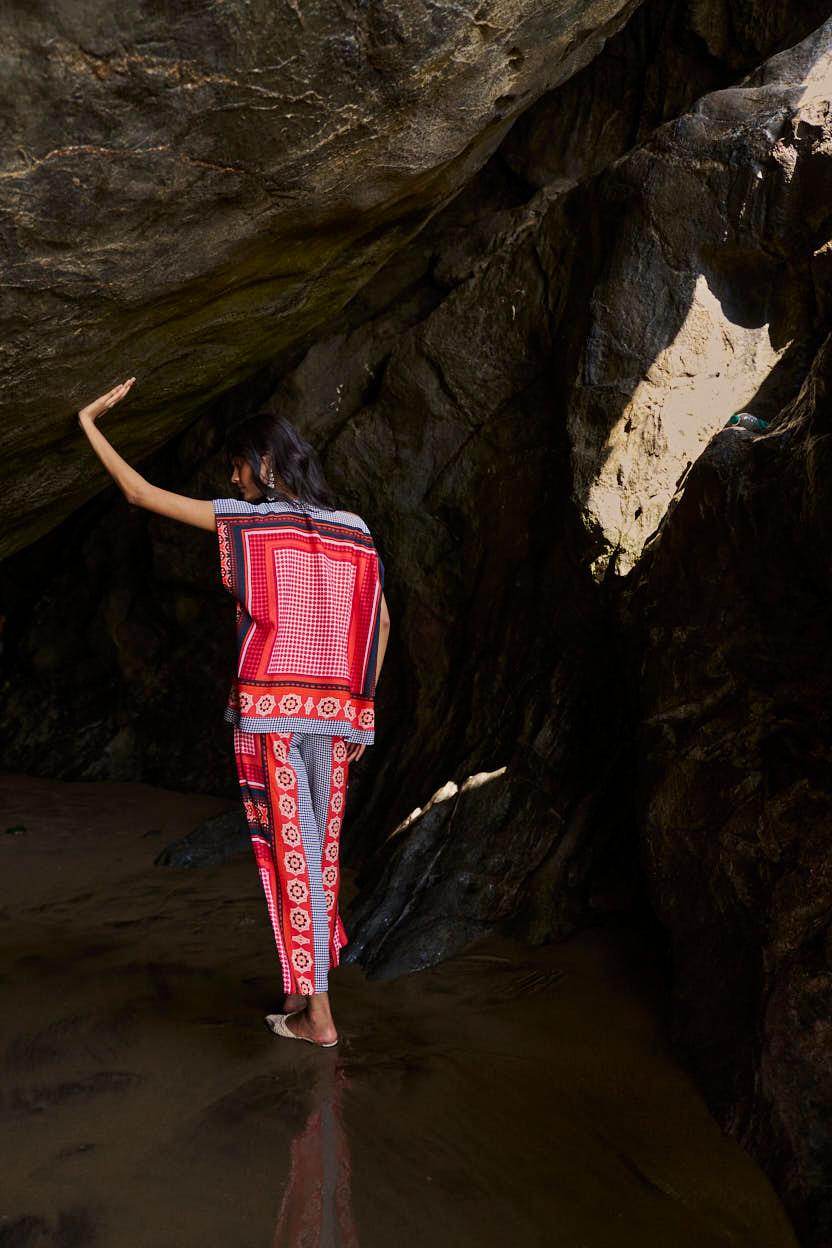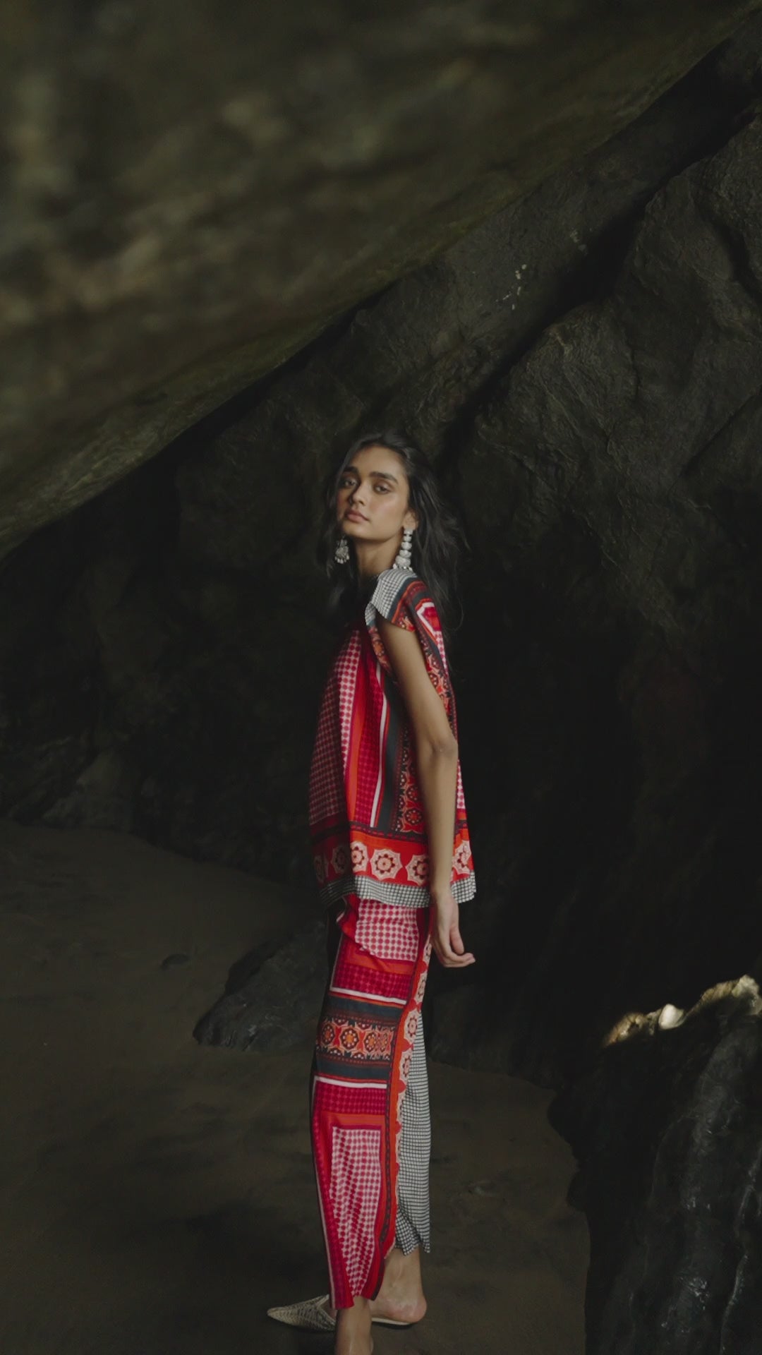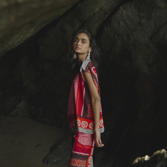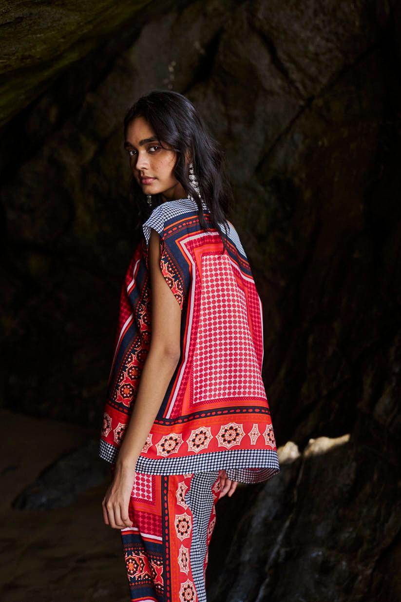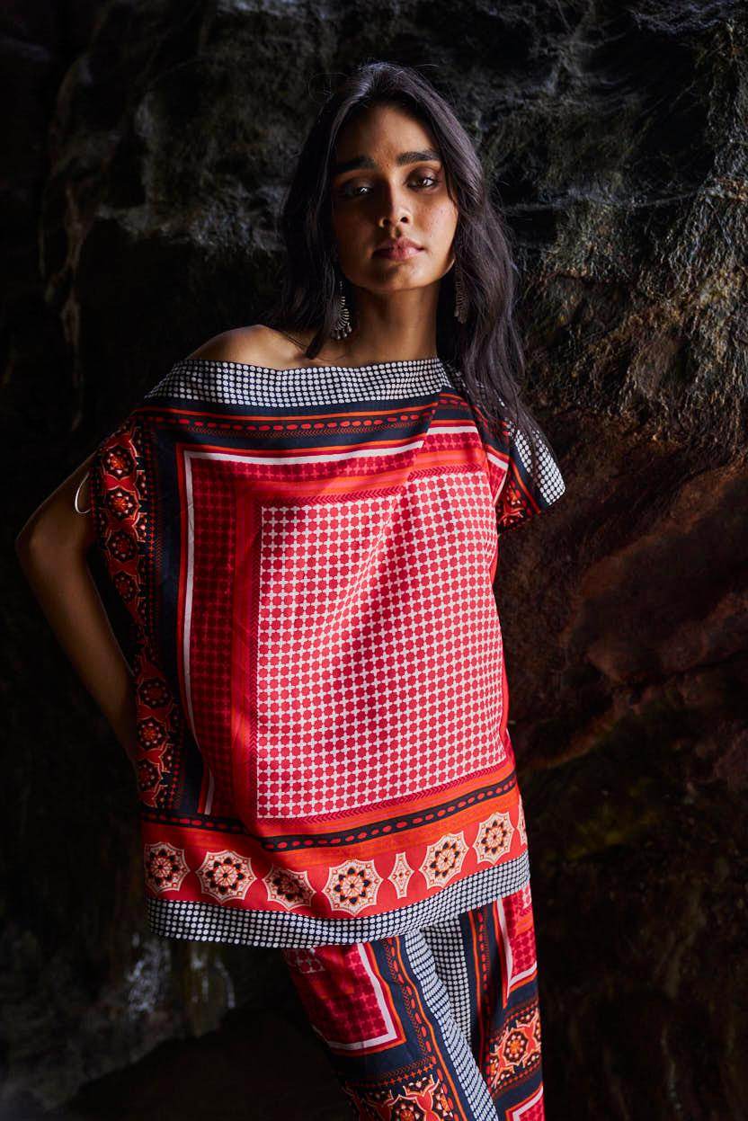 Geometric printed top in bright shades of orange and red with contrasting placed black and white borders outlining the top. Kaftan style details can be worn two ways - as one shoulder scarf top or off shoulder.