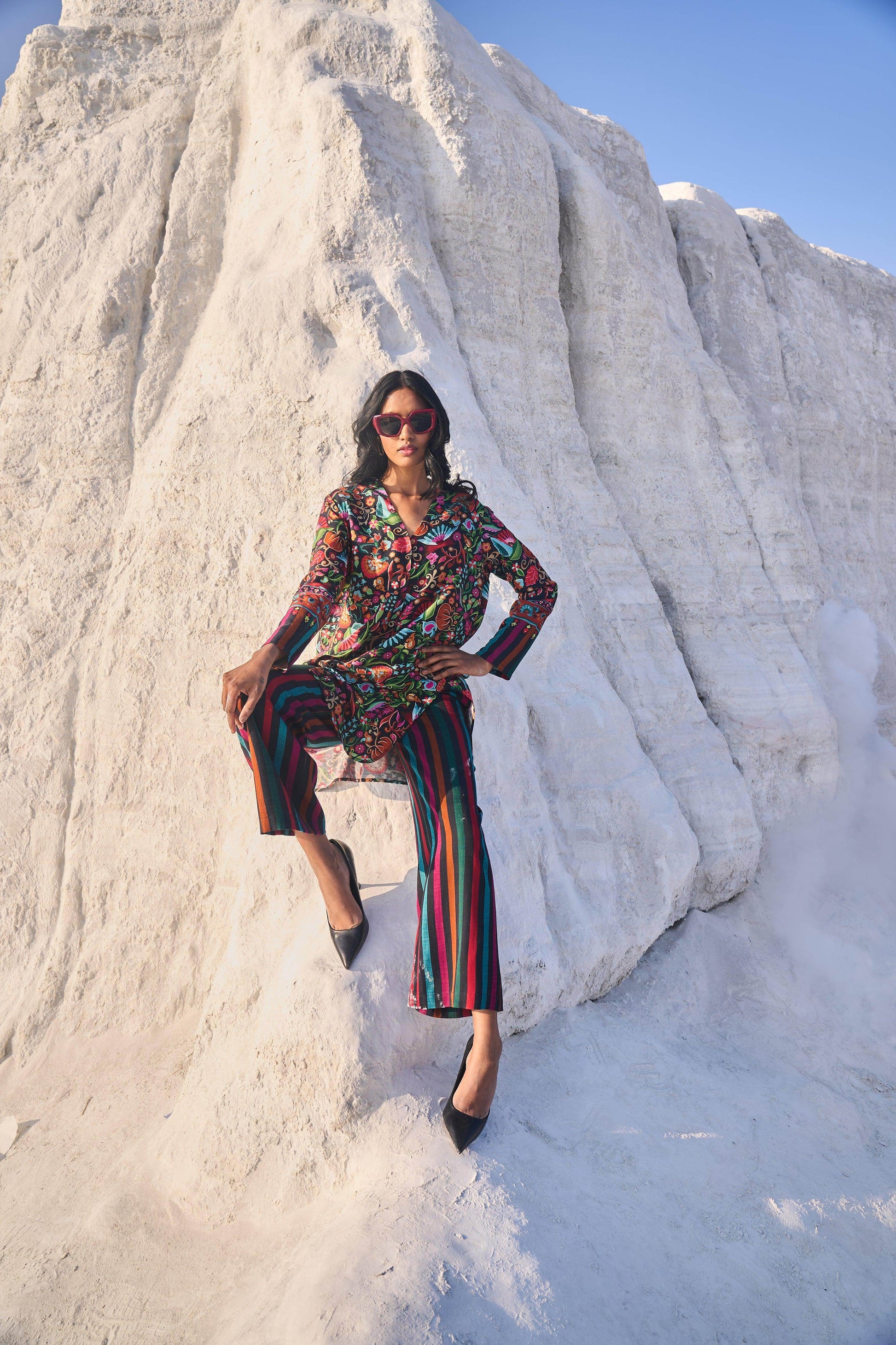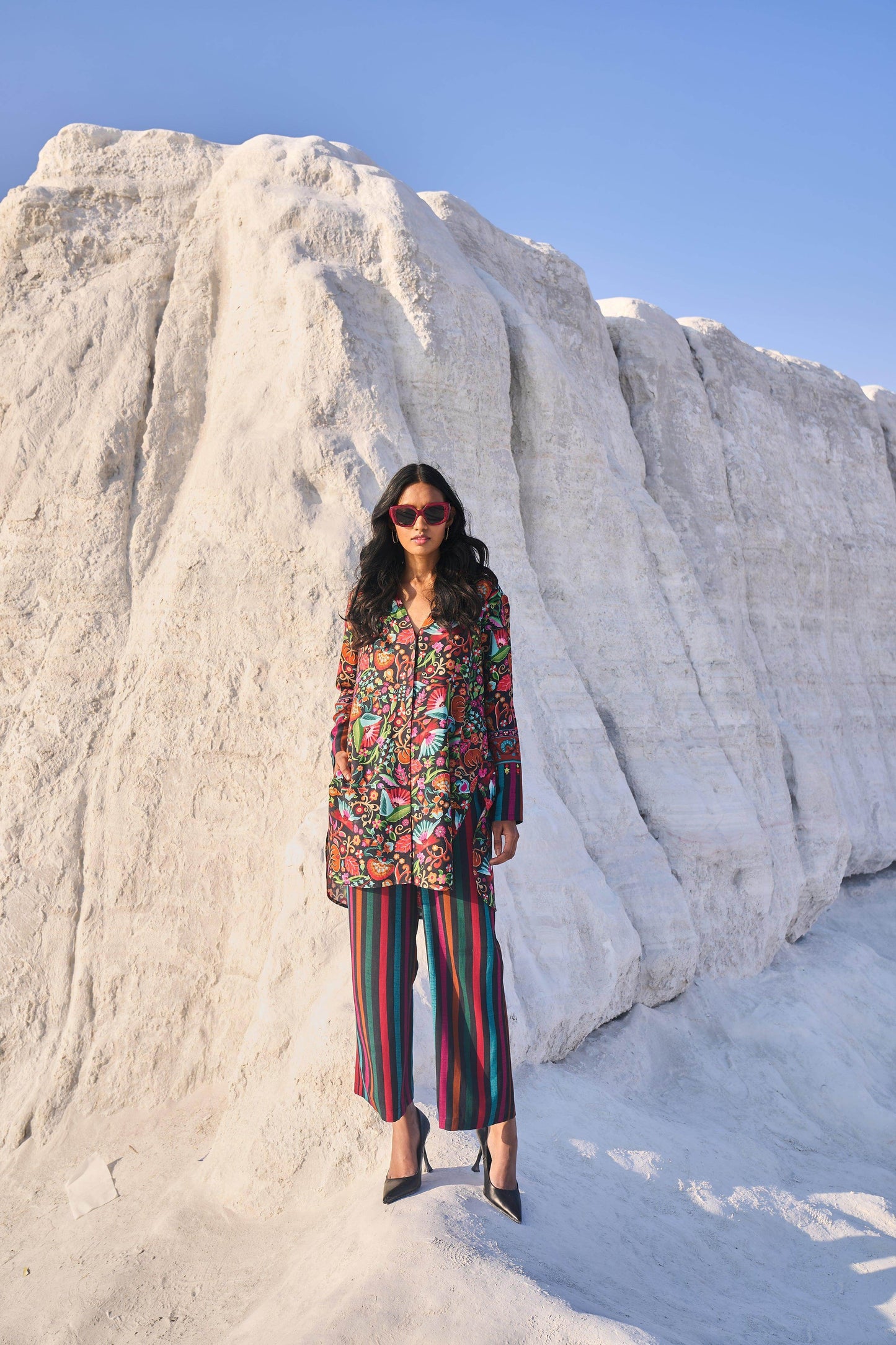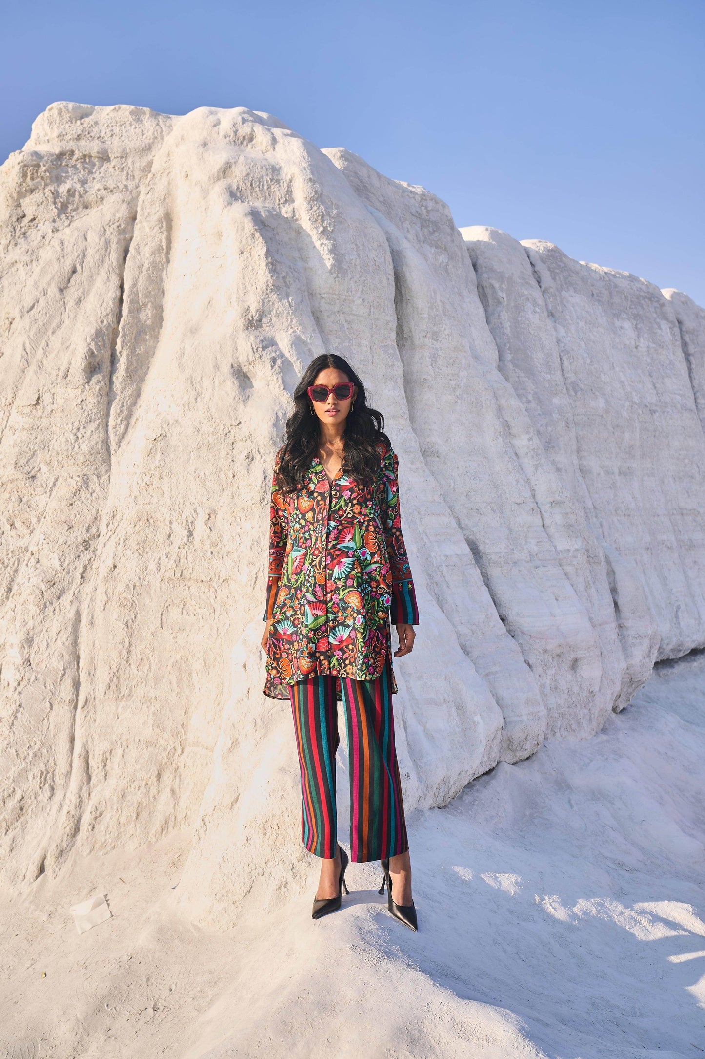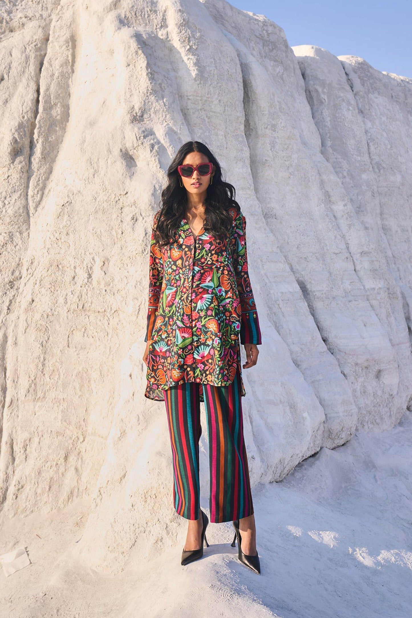 Multicolour on black print inspired by kani shawls. Longline button down full sleeve top with V neck and vents on the side. Border detail at sleeve hem. Pants in multicolour stripe on black inspired by shawl border.