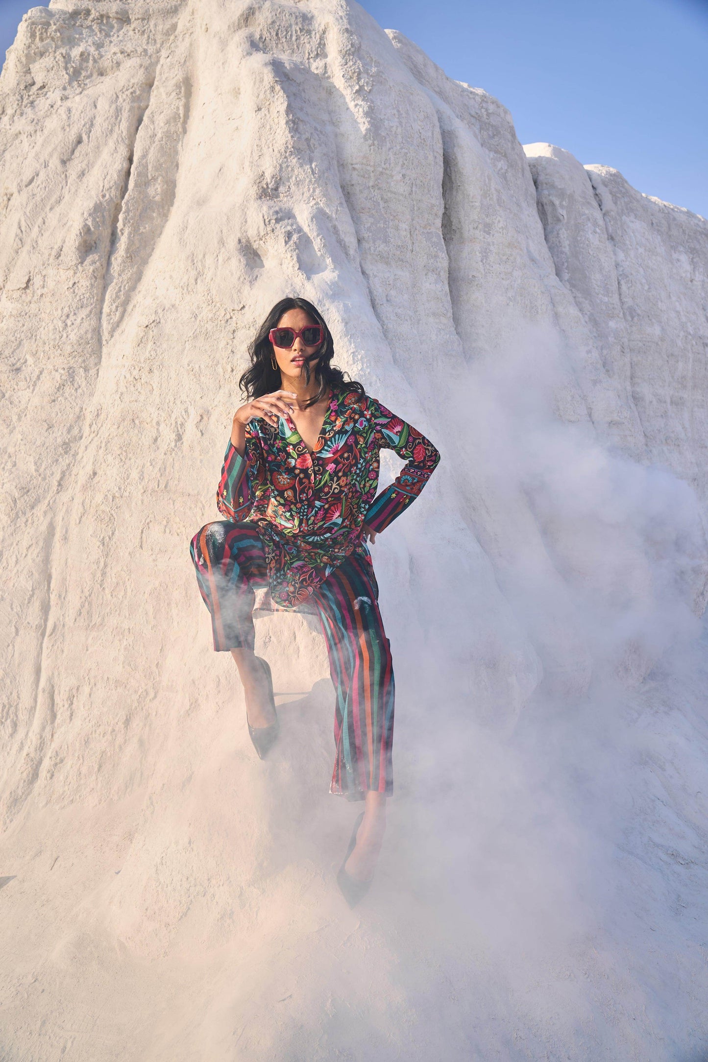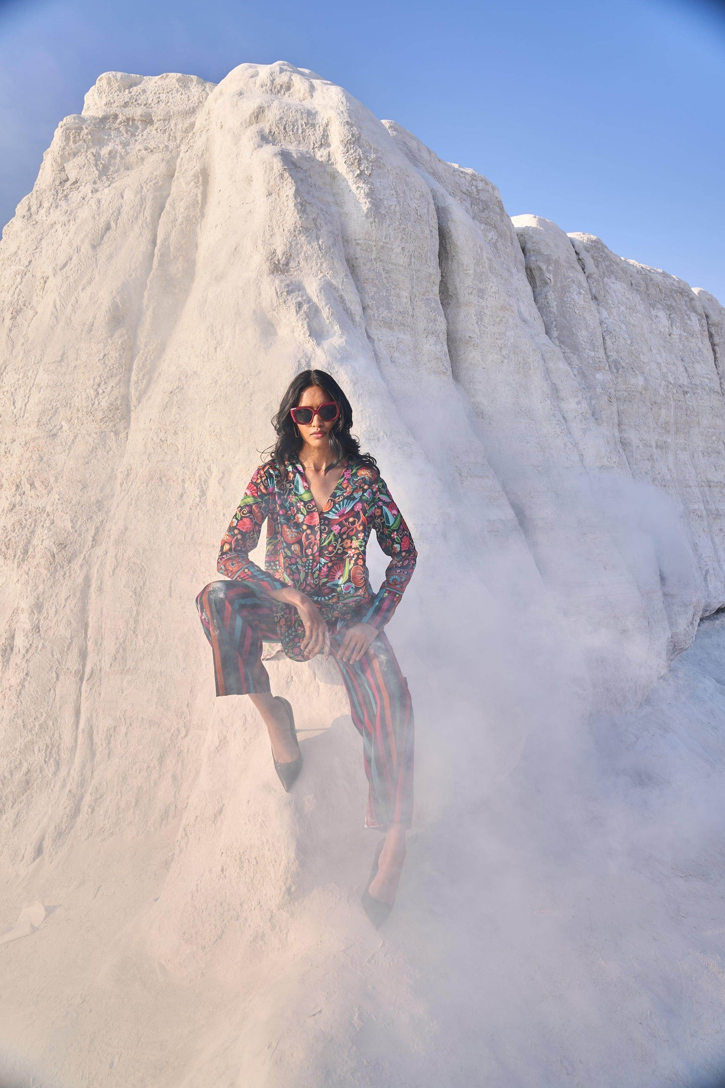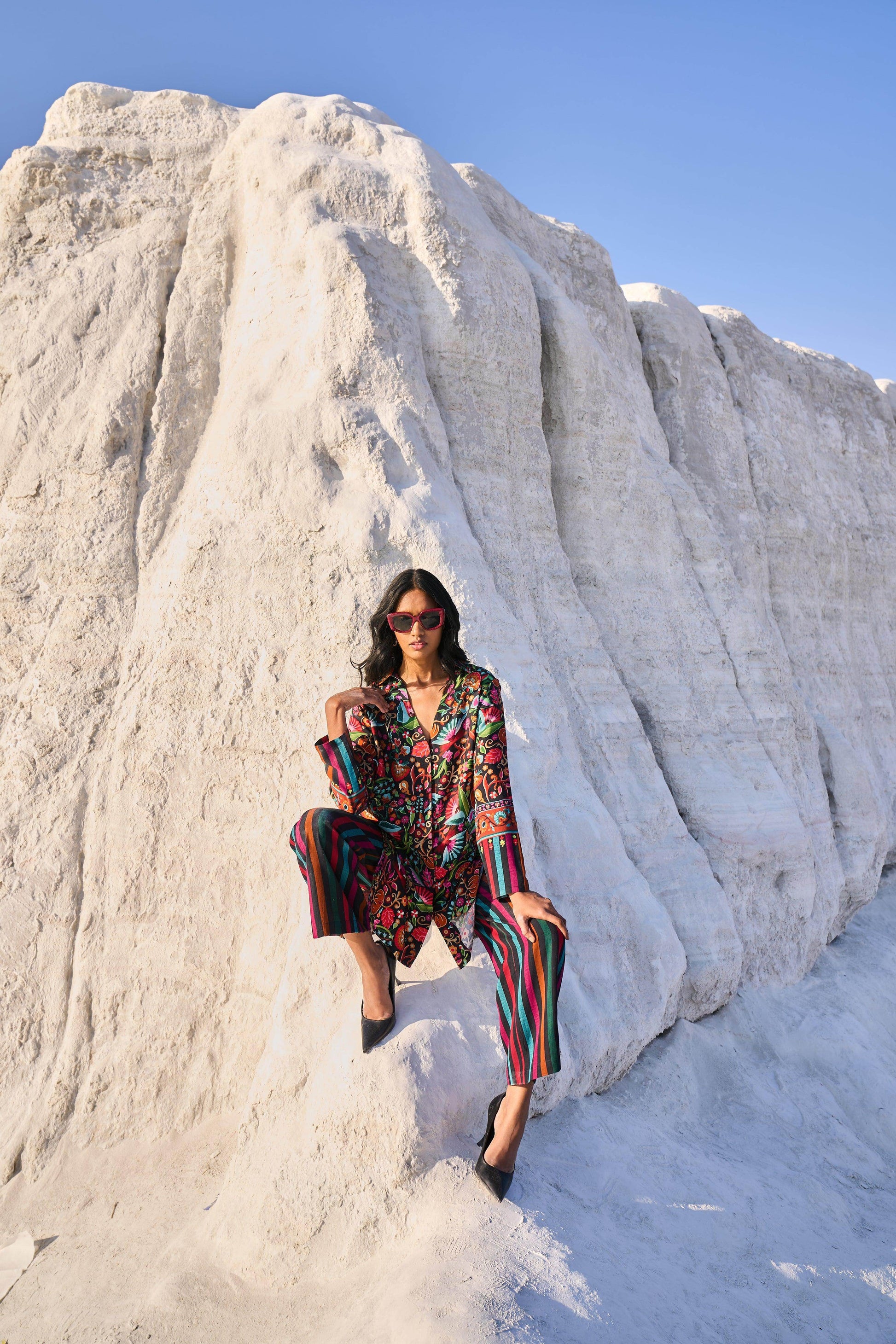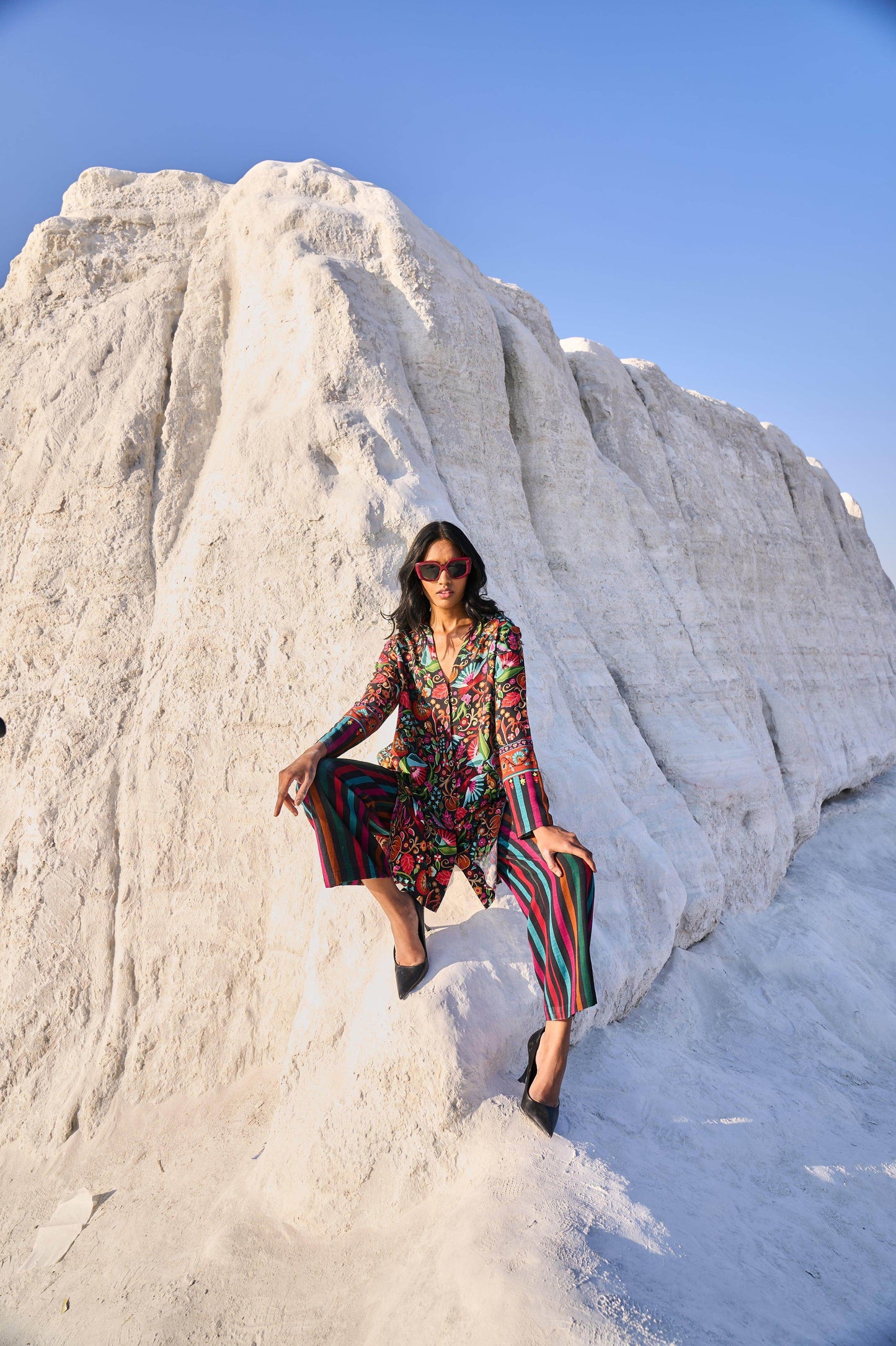 Multicolour on black print inspired by kani shawls. Longline button down full sleeve top with V neck and vents on the side. Border detail at sleeve hem. Pants in multicolour stripe on black inspired by shawl border.
