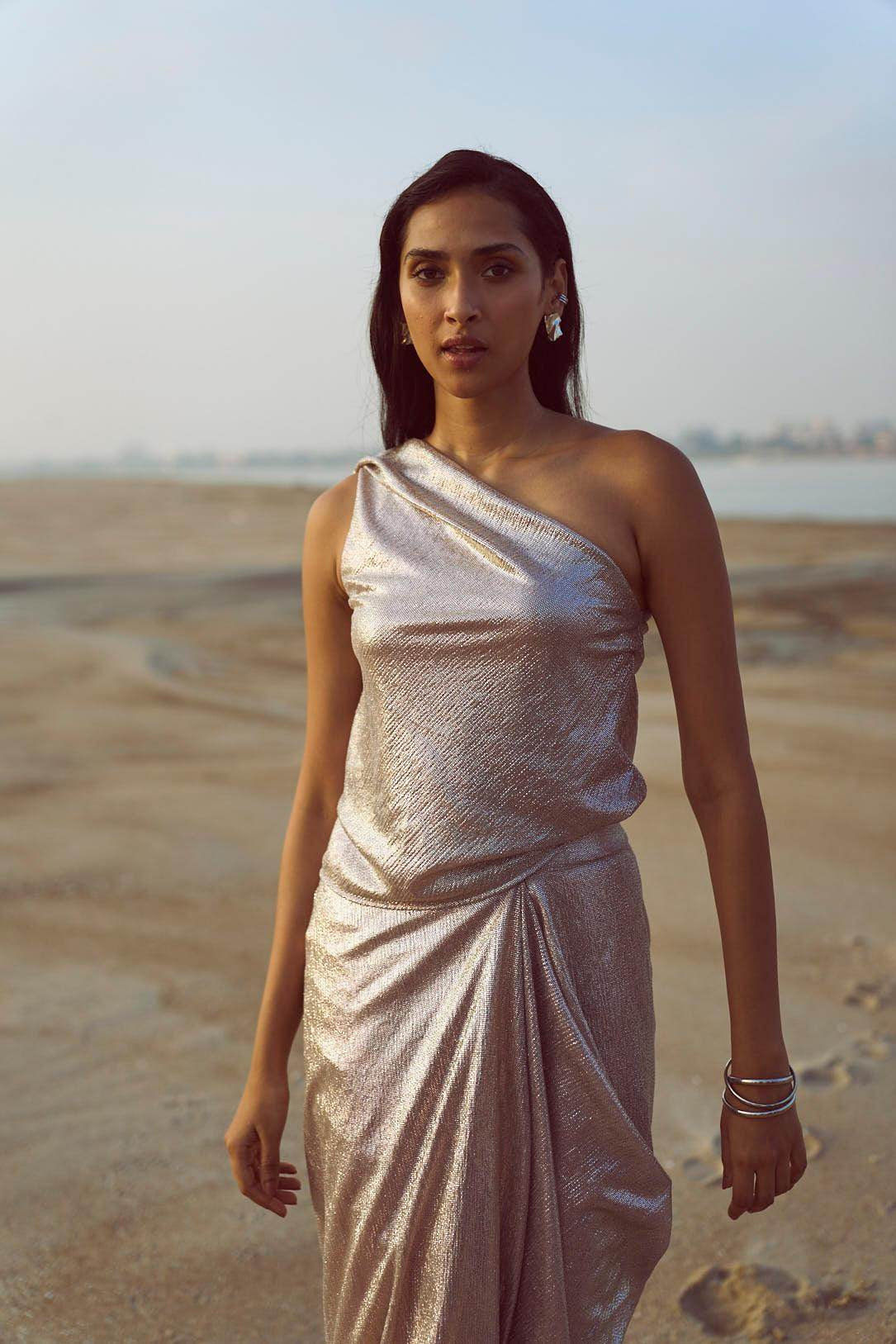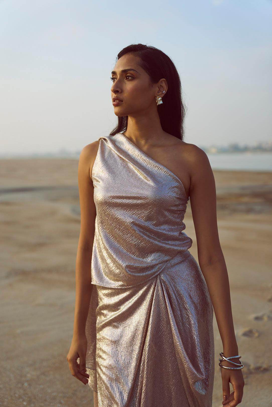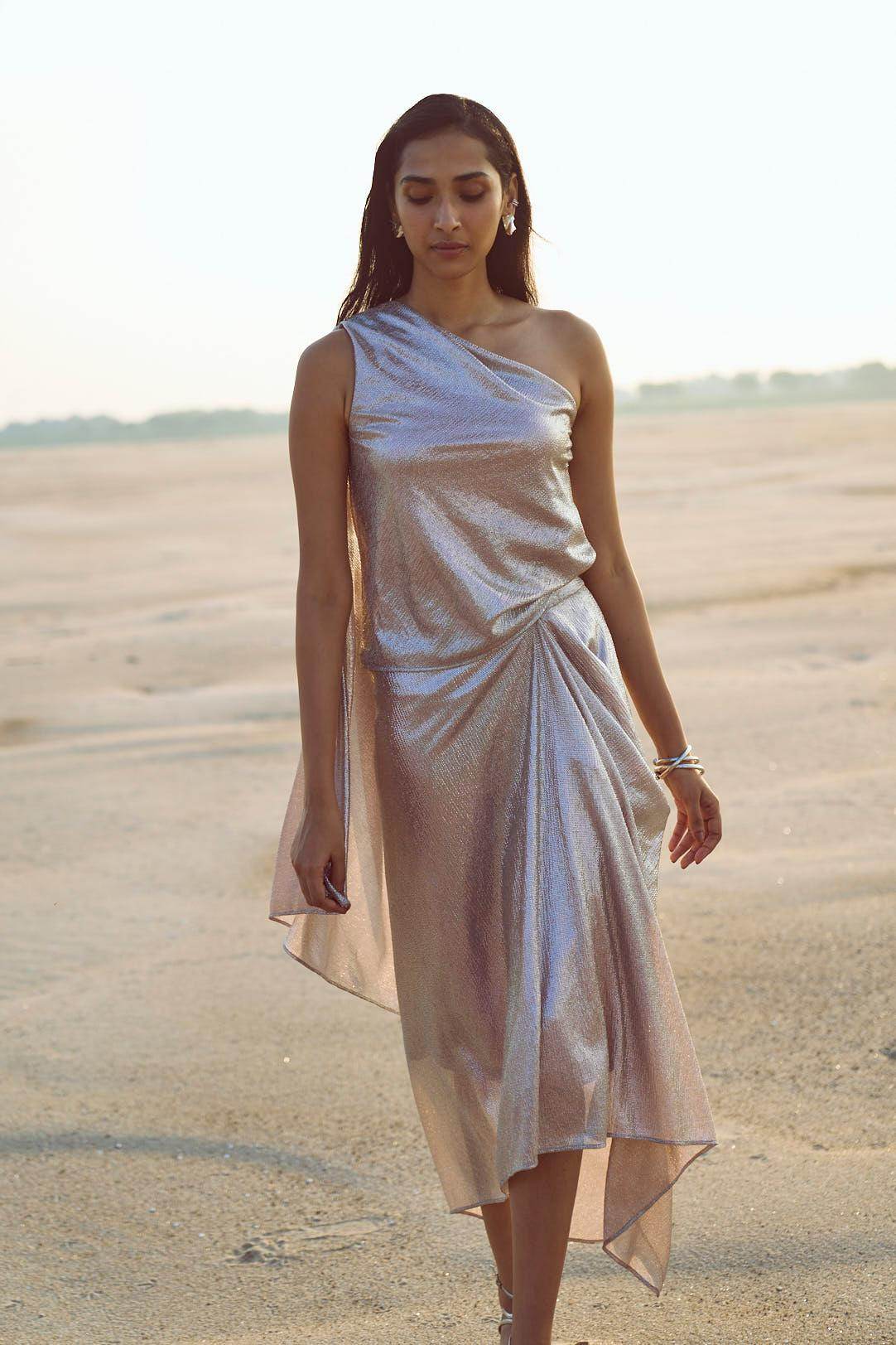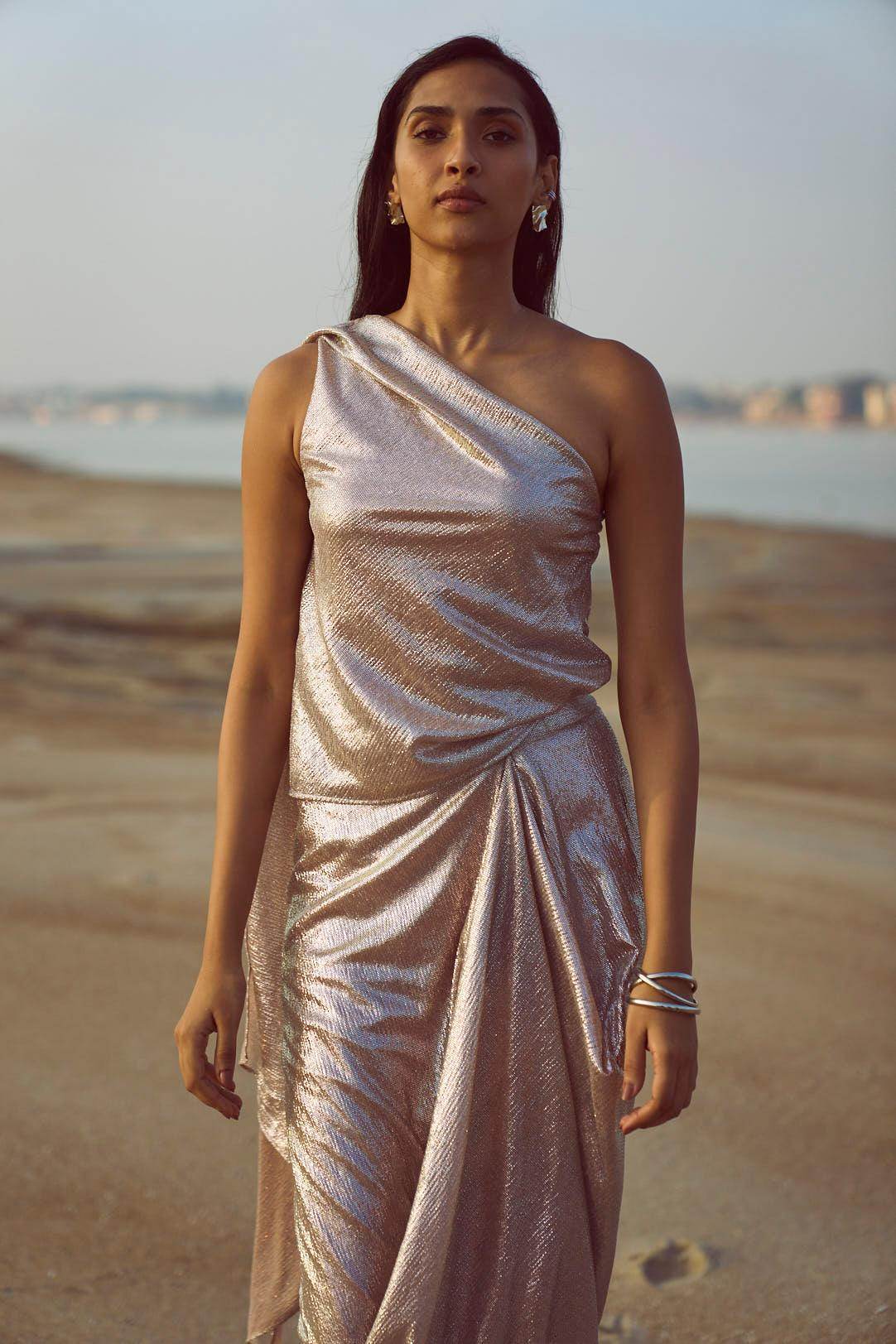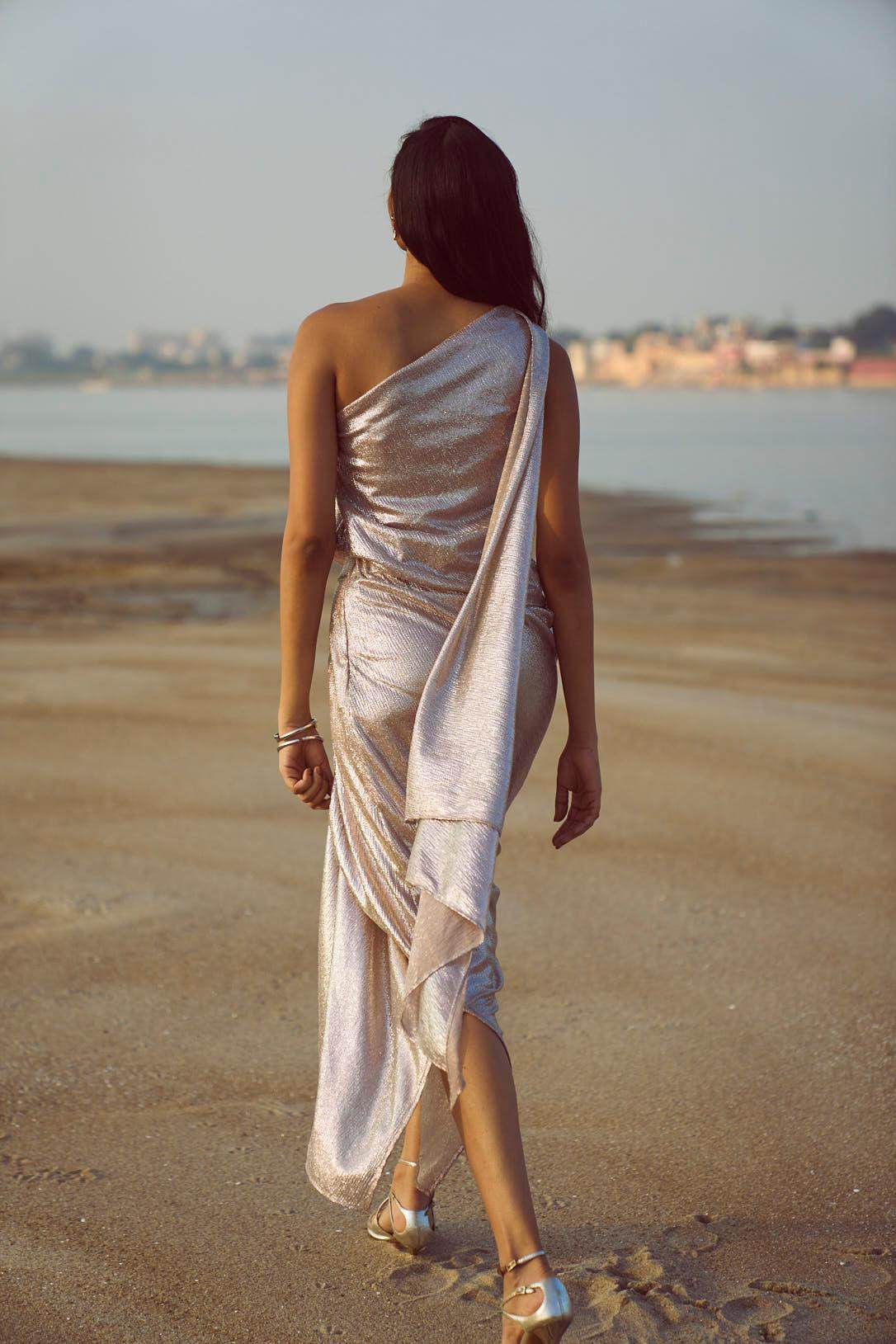 Rose gold lamé drape skirt set. One shouldered top with draped panel flowing down the back. Can be worn as a 'sari' inspired drape detail over the shoulder, or wrapped around the neck as a scarf. Paired with matching asymmetric drape skirt. Soft hand placed pleats placed on the center front. Hook and concealed zipper on the side. The top is lined at the front and back and skirt is lined till the knees.