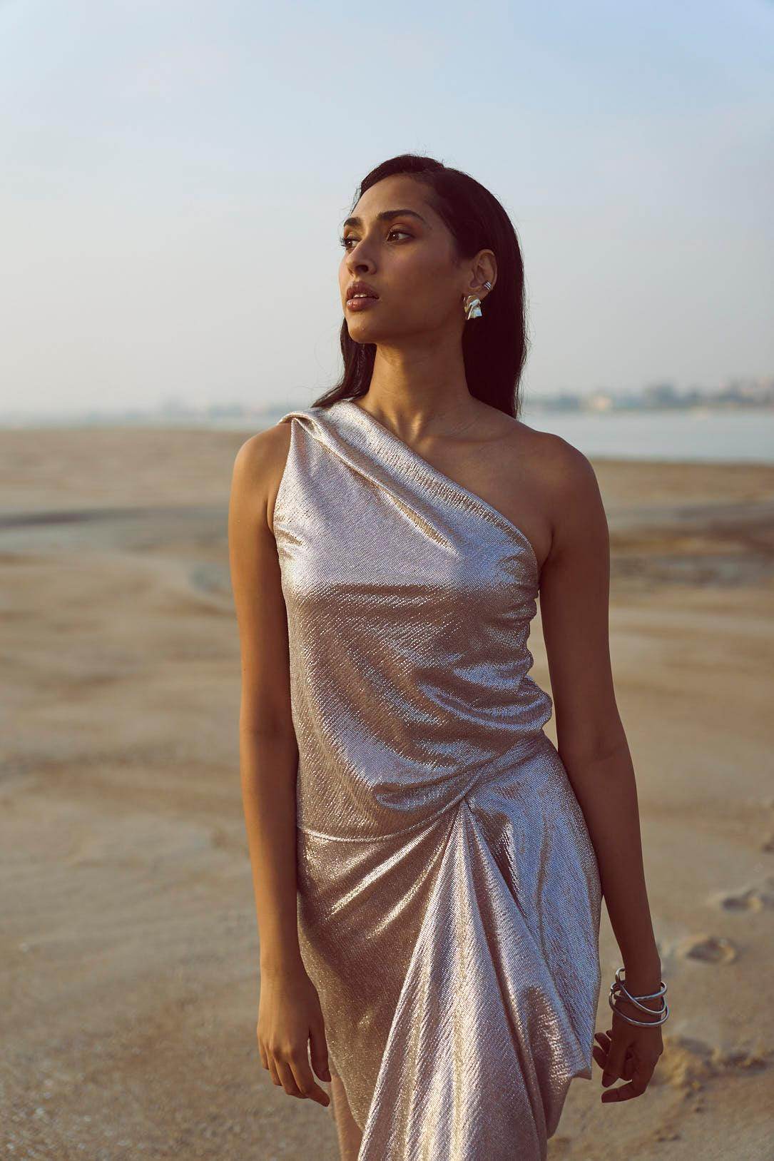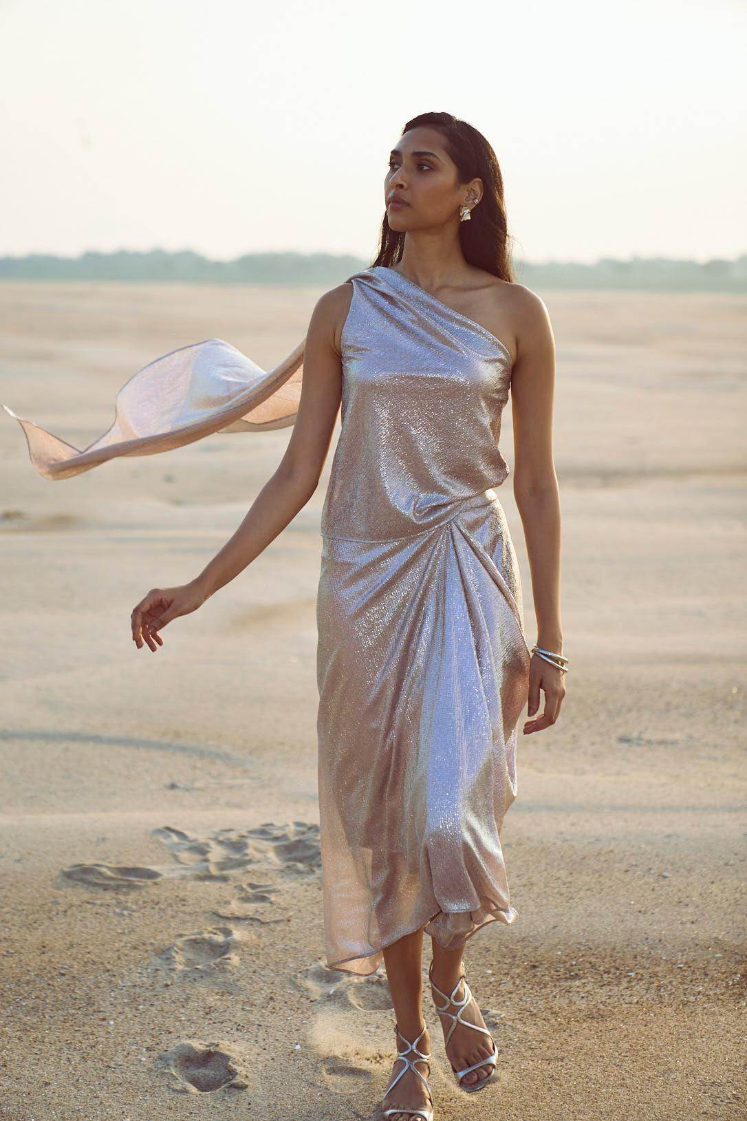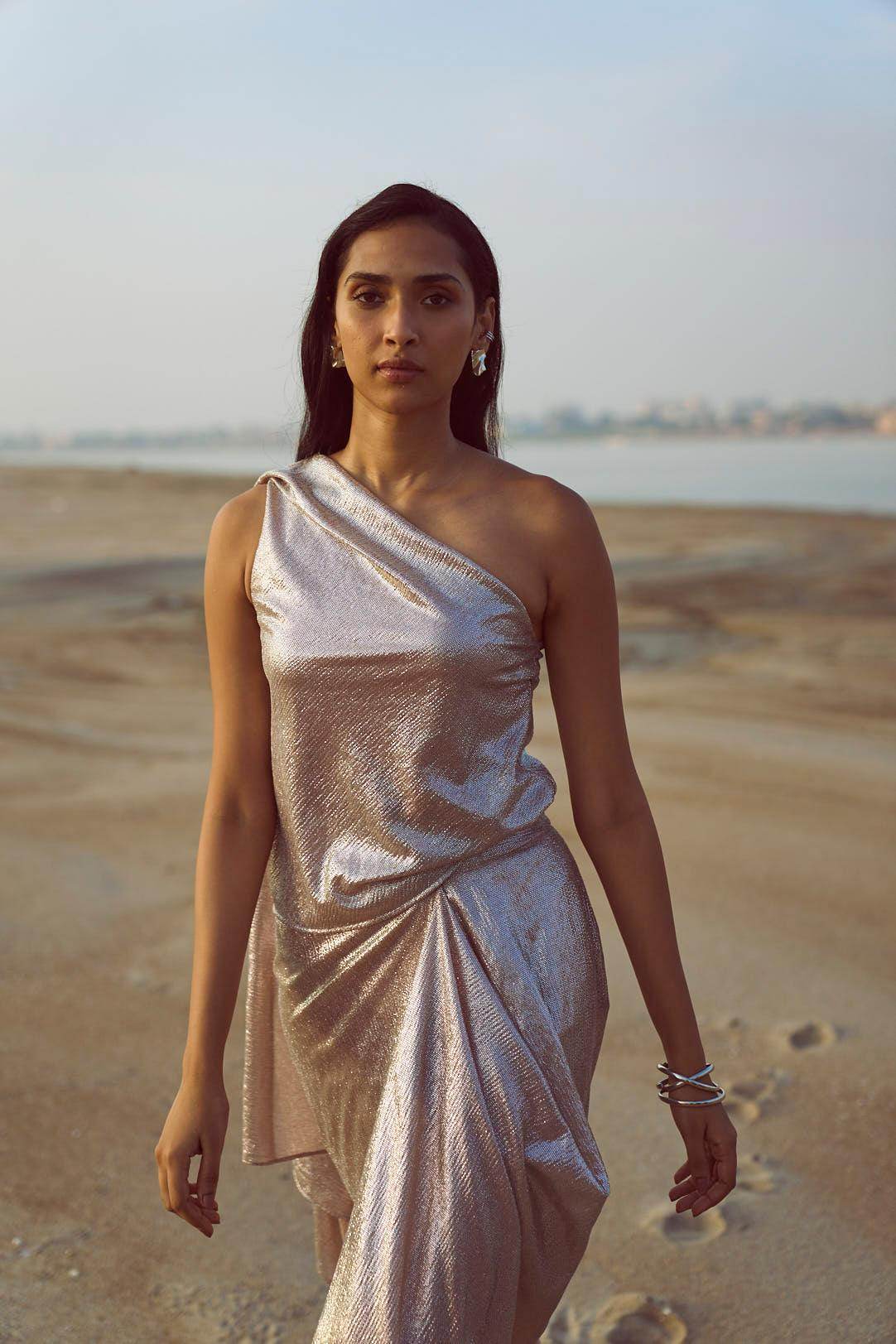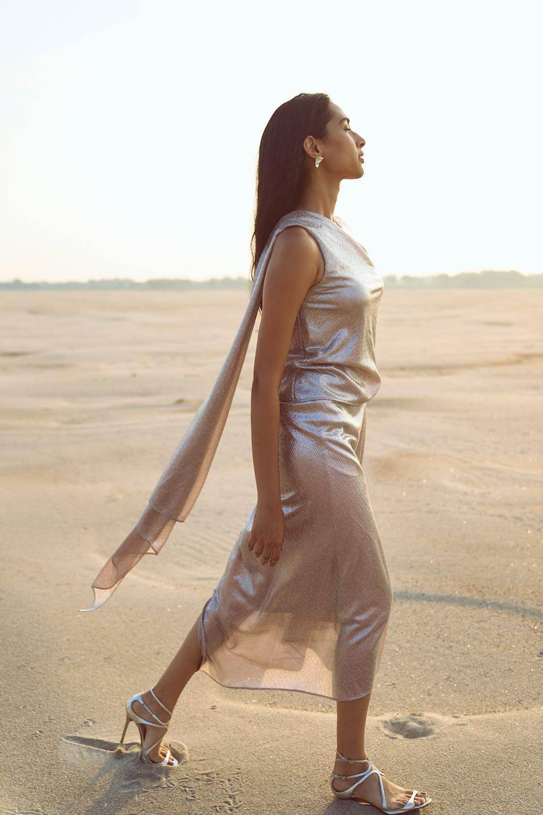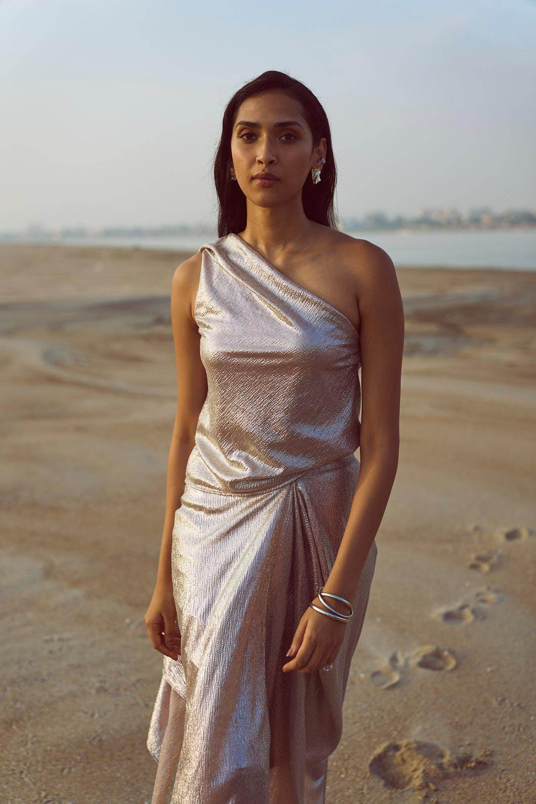 Rose gold lamé drape skirt set. One shouldered top with draped panel flowing down the back. Can be worn as a 'sari' inspired drape detail over the shoulder, or wrapped around the neck as a scarf. Paired with matching asymmetric drape skirt. Soft hand placed pleats placed on the center front. Hook and concealed zipper on the side. The top is lined at the front and back and skirt is lined till the knees.