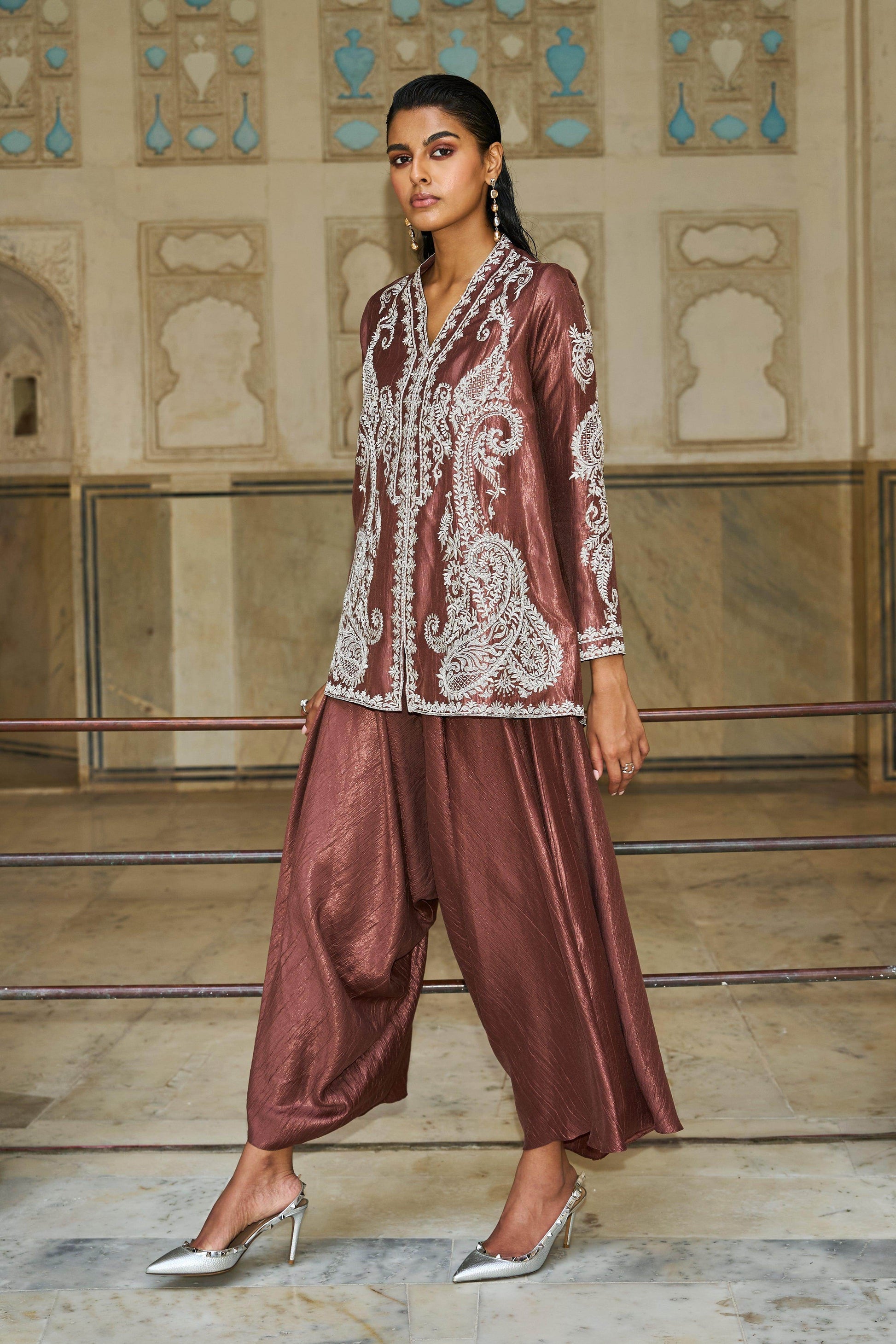 V-neck popover top in a sienna lamé fabric. Metallic silver paisley embroidery frames the front, neck, sleeves and back. Relaxed fit. Single hook/eye button in the front. Paired with matching draped culotte pant. Harem pant inspired shape. Semi elasticated at the waist with zip and hook/eye closure on the side. Flared at the hem.