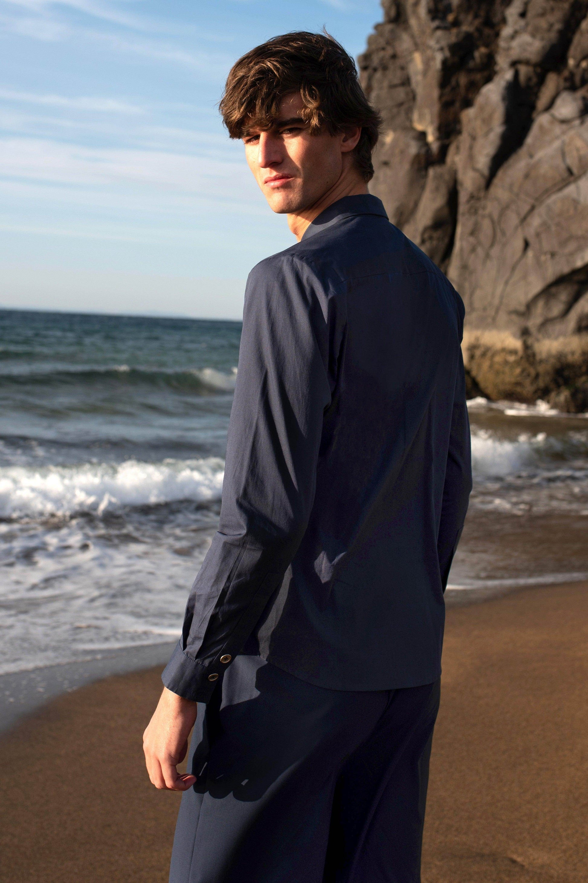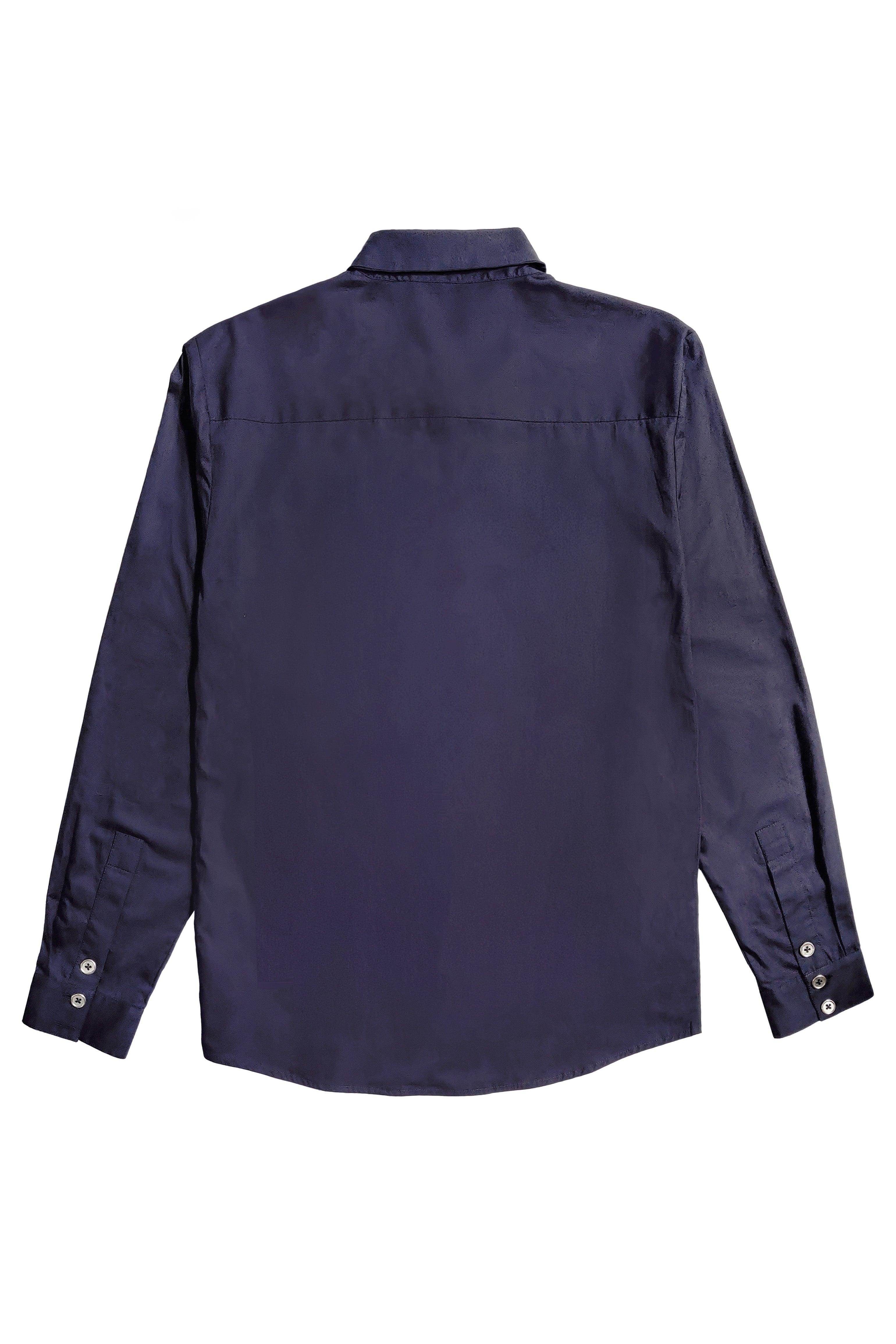 Navy full-sleeve cotton poplin shirt. Three rows of metallic show buttons down the center front to create an exaggerated button placket. Concealed snap button closure at front placket with metallic button closures on the sleeve cuffs. Regular fit.