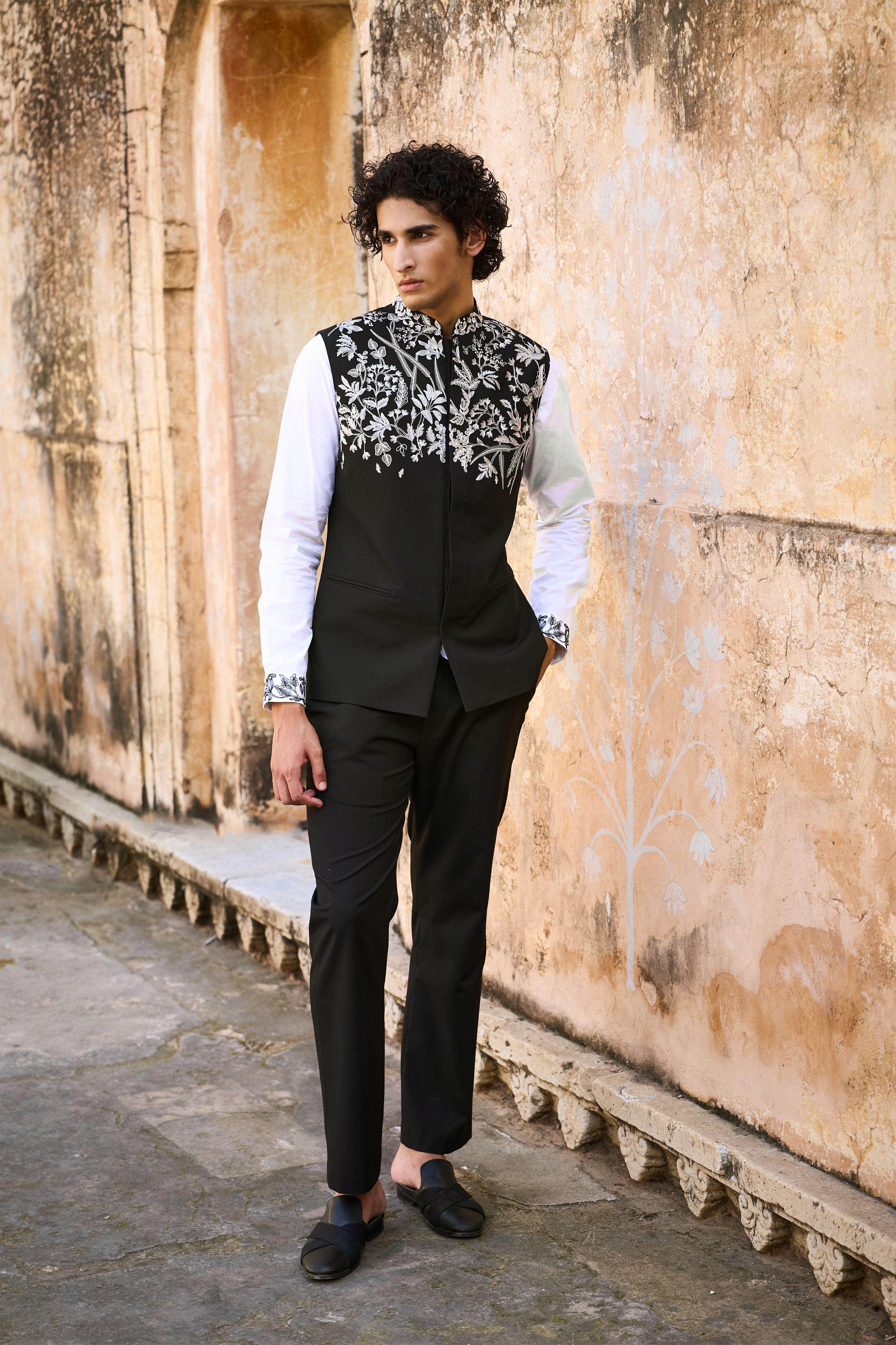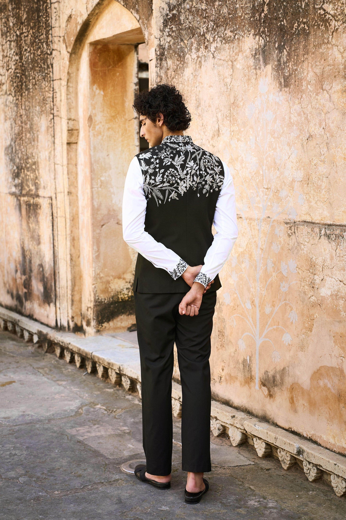 Black straight cut pants in all weather suiting material. Pockets in the sides and back. Belt loops at the waist, snap button and zip closure in the front.