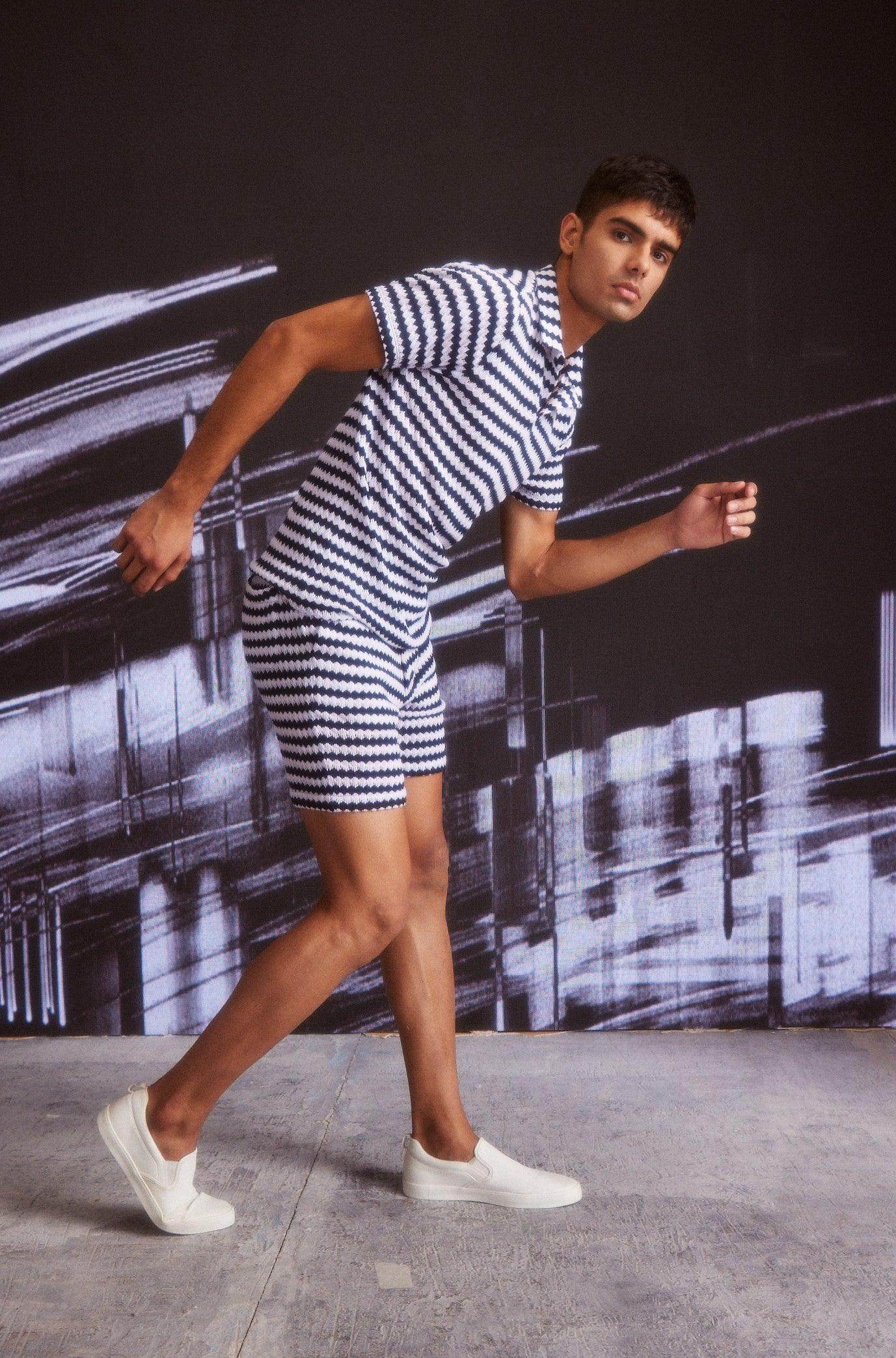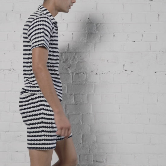 Organic cotton popover polo in textured knitted navy and white stripe fabric. Paired with matching shorts. Pockets on the side and back. Semi-elasticated at the waist. Hook and eye closure at the front. Zip fly.