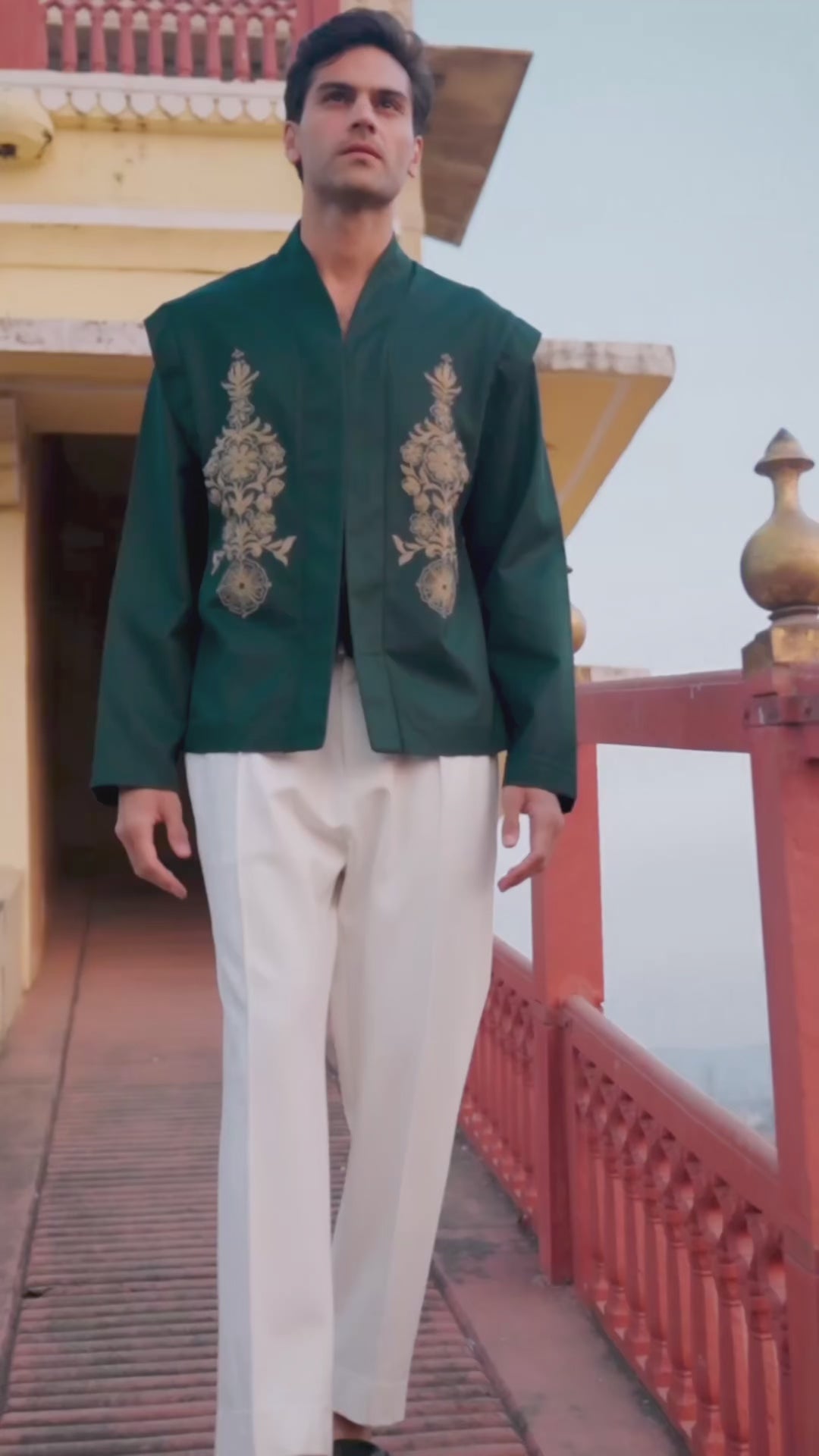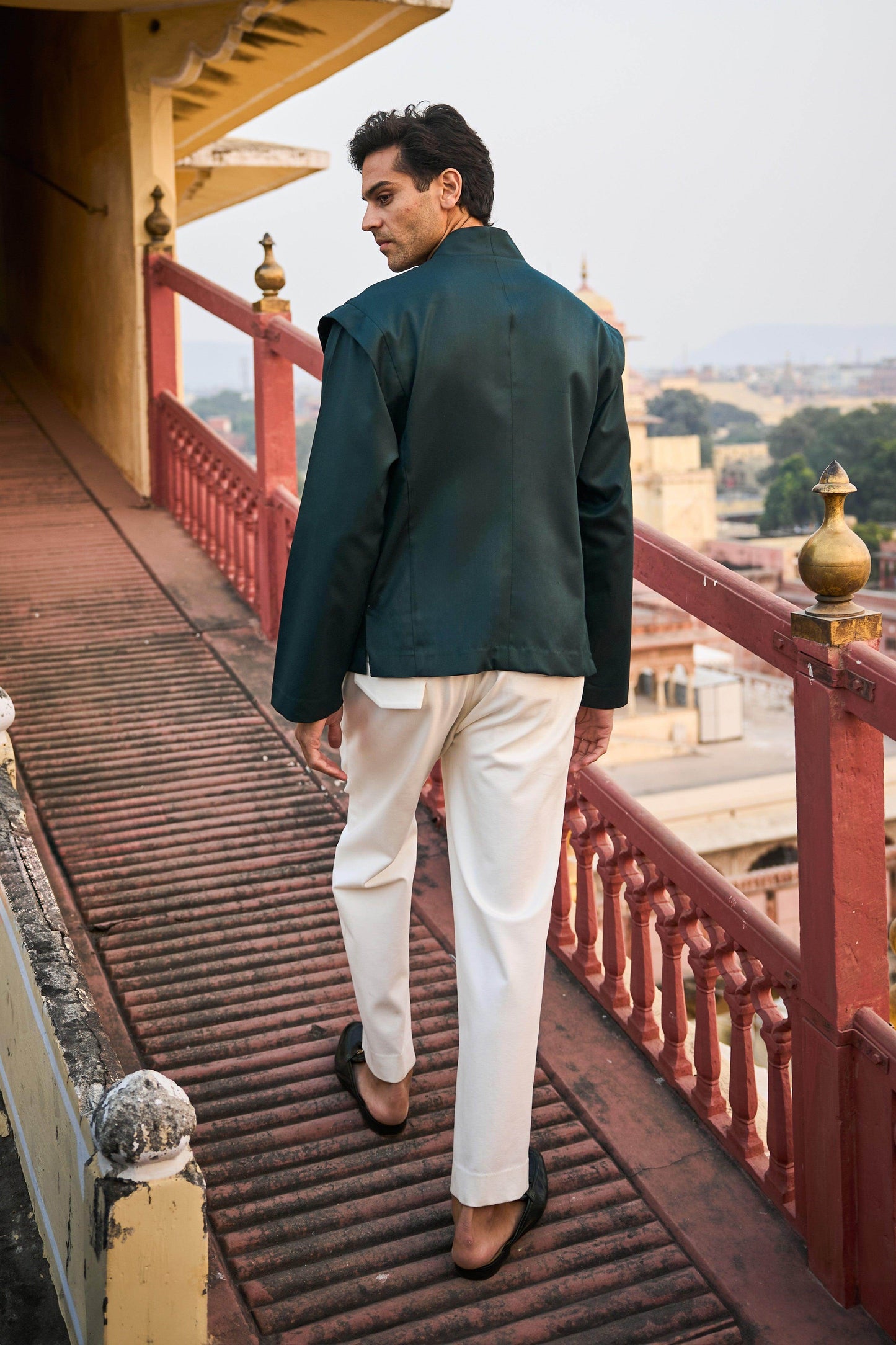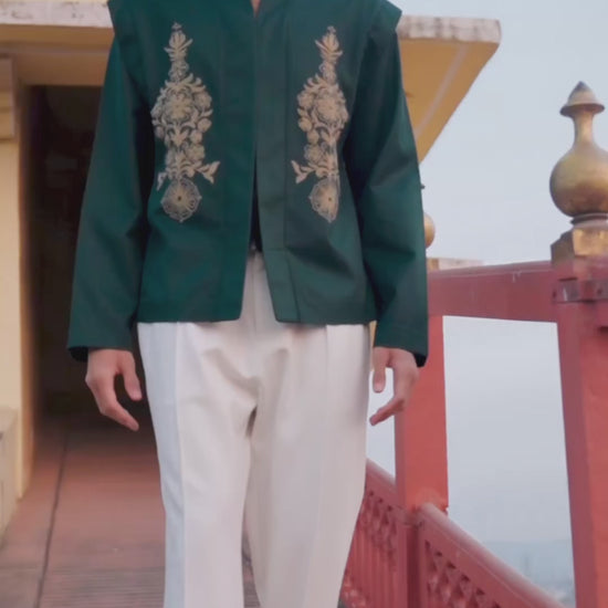 Structured shawl-collar shirt in all weather suiting fabric. Intricate earth-toned embroidered motifs placed on the front. Full sleeve. Concealed zip closure in the front.