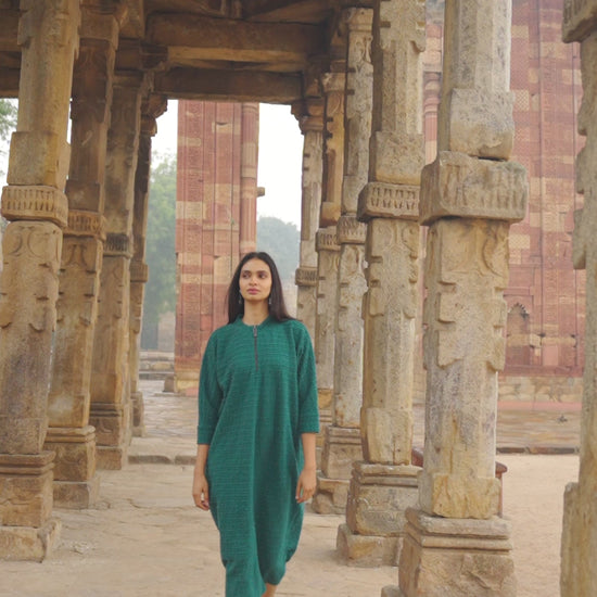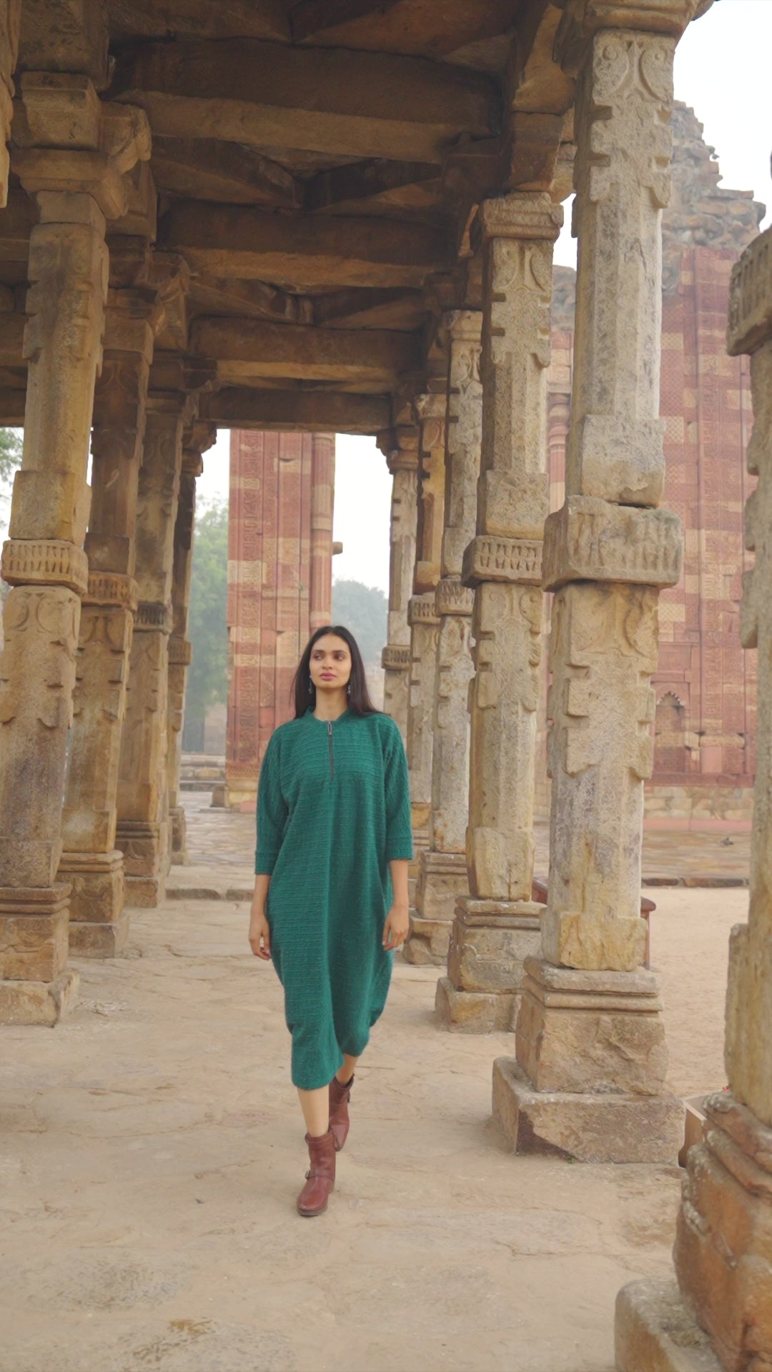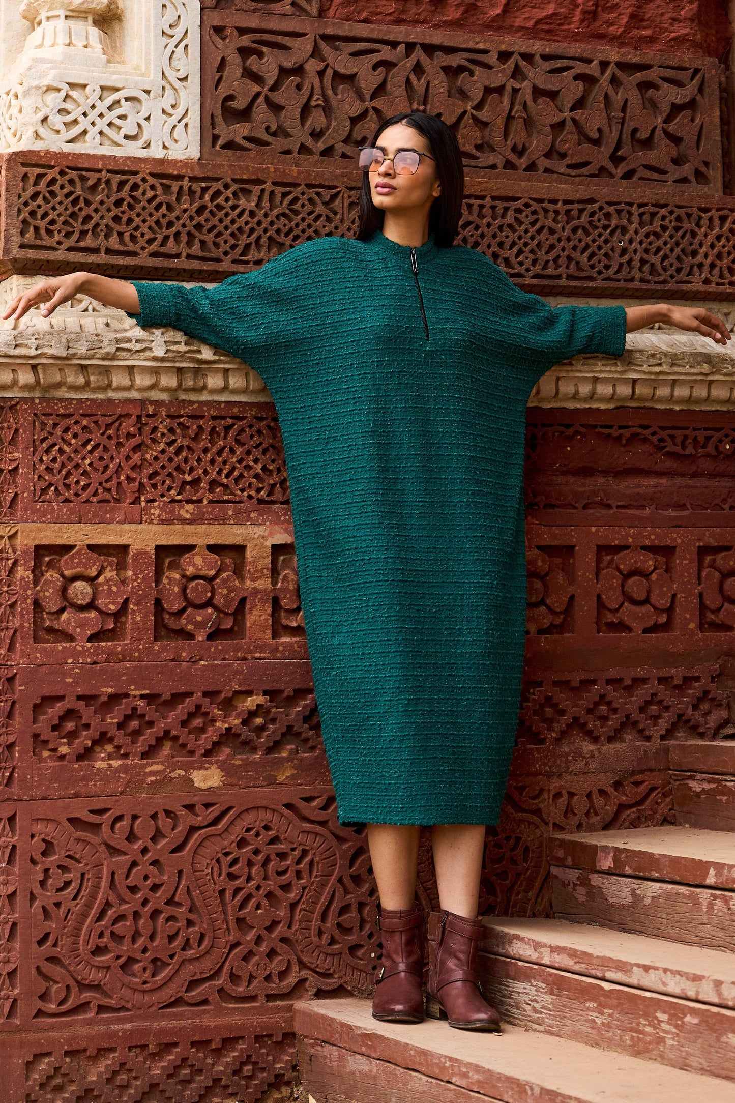 Soft textured knitted bouclé midi dress. Band collar, dolman 3/4th sleeves. Popover dress with a black zip and safety pin puller in the front. Relaxed fit.