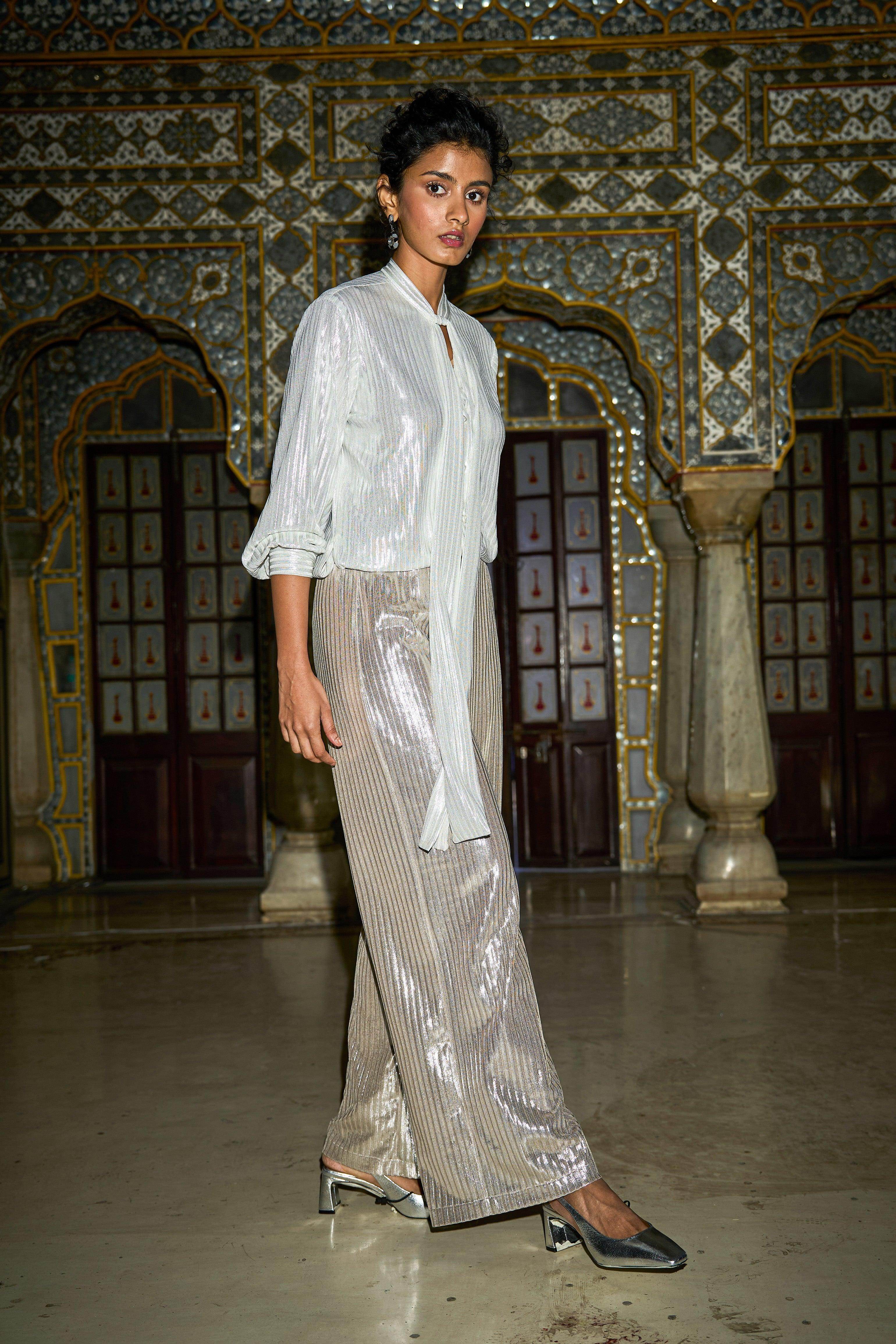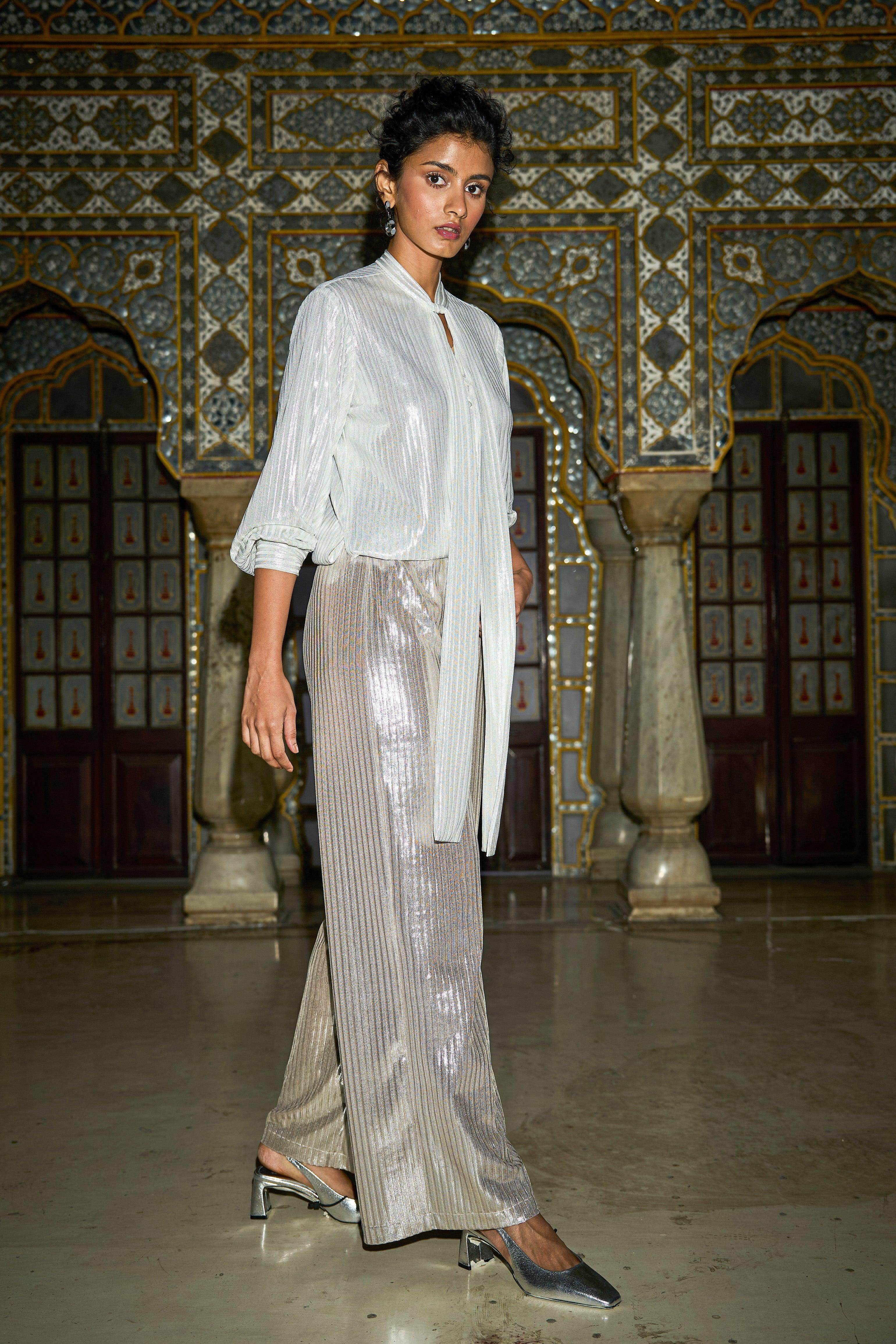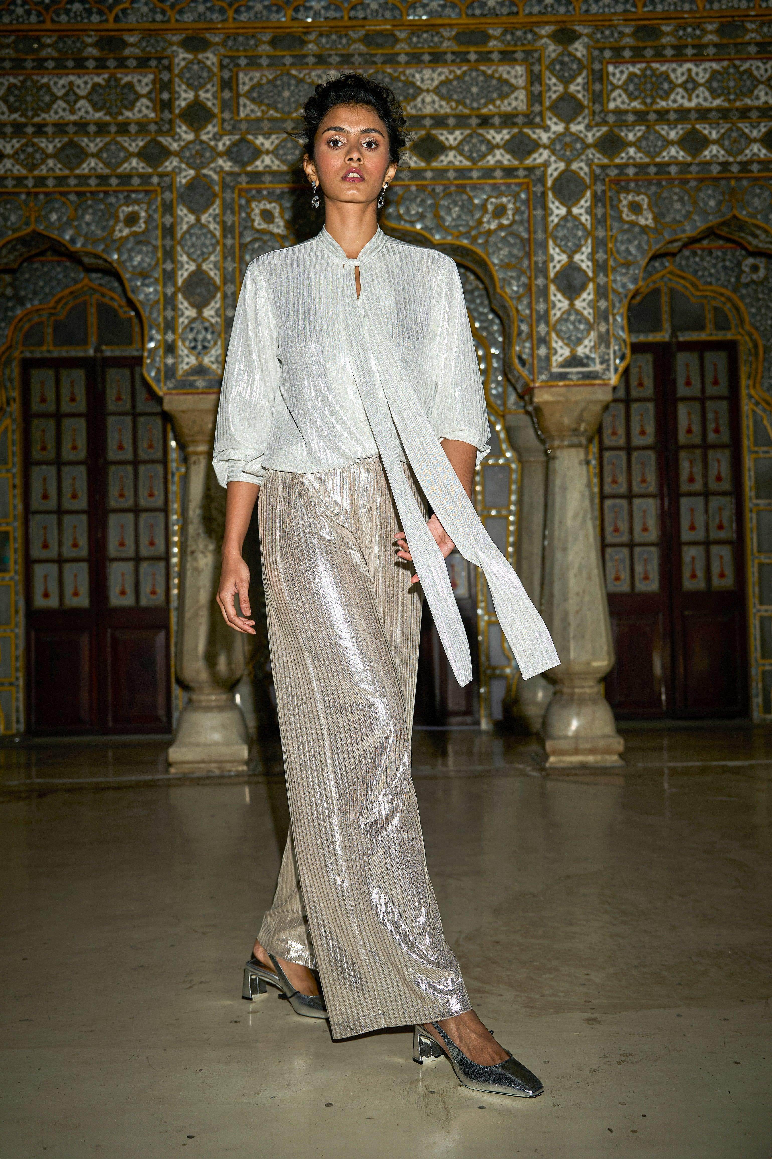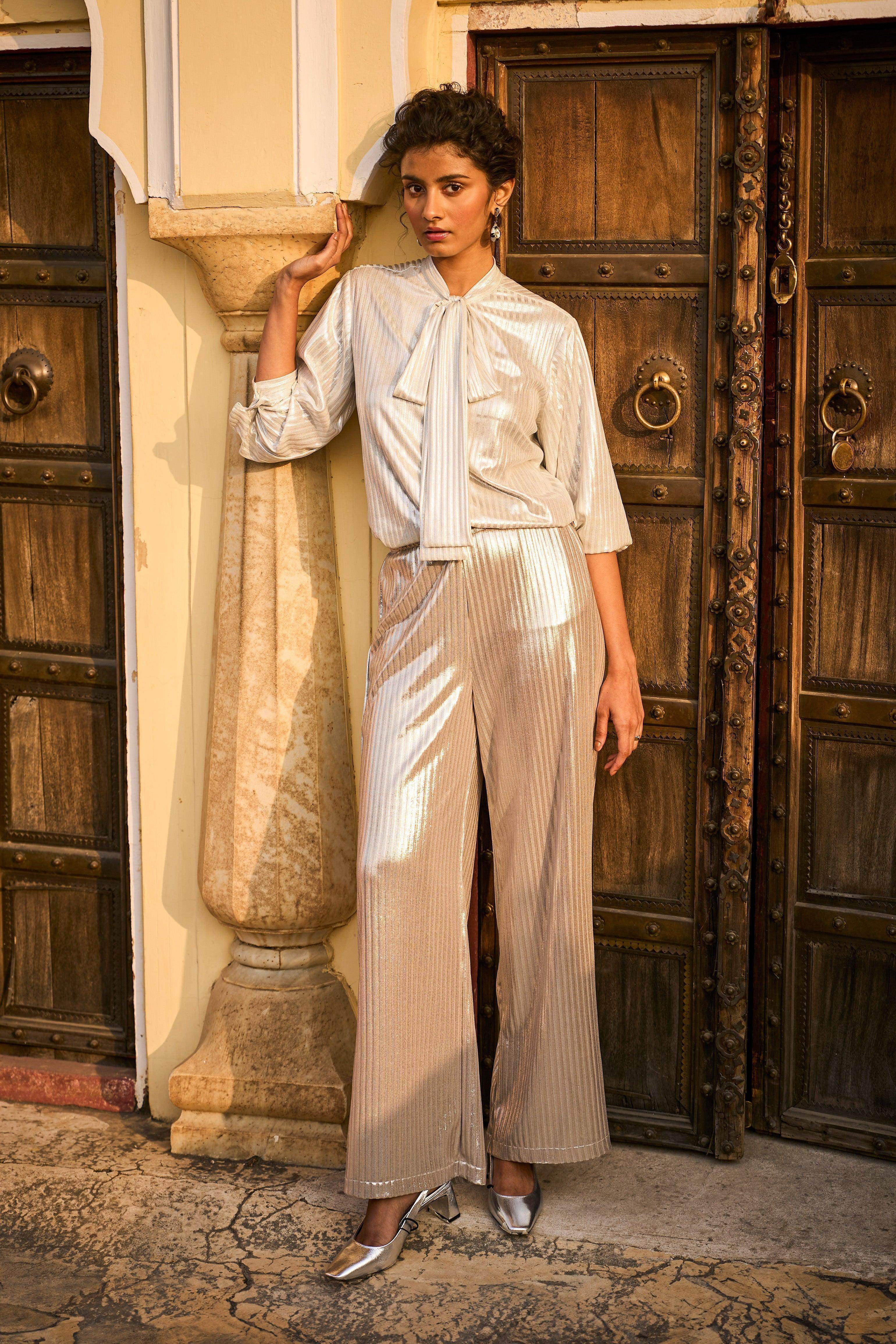 Shimmer textured stripe in soft rose gold. Straight-fit pants with a fully elasticated waist.