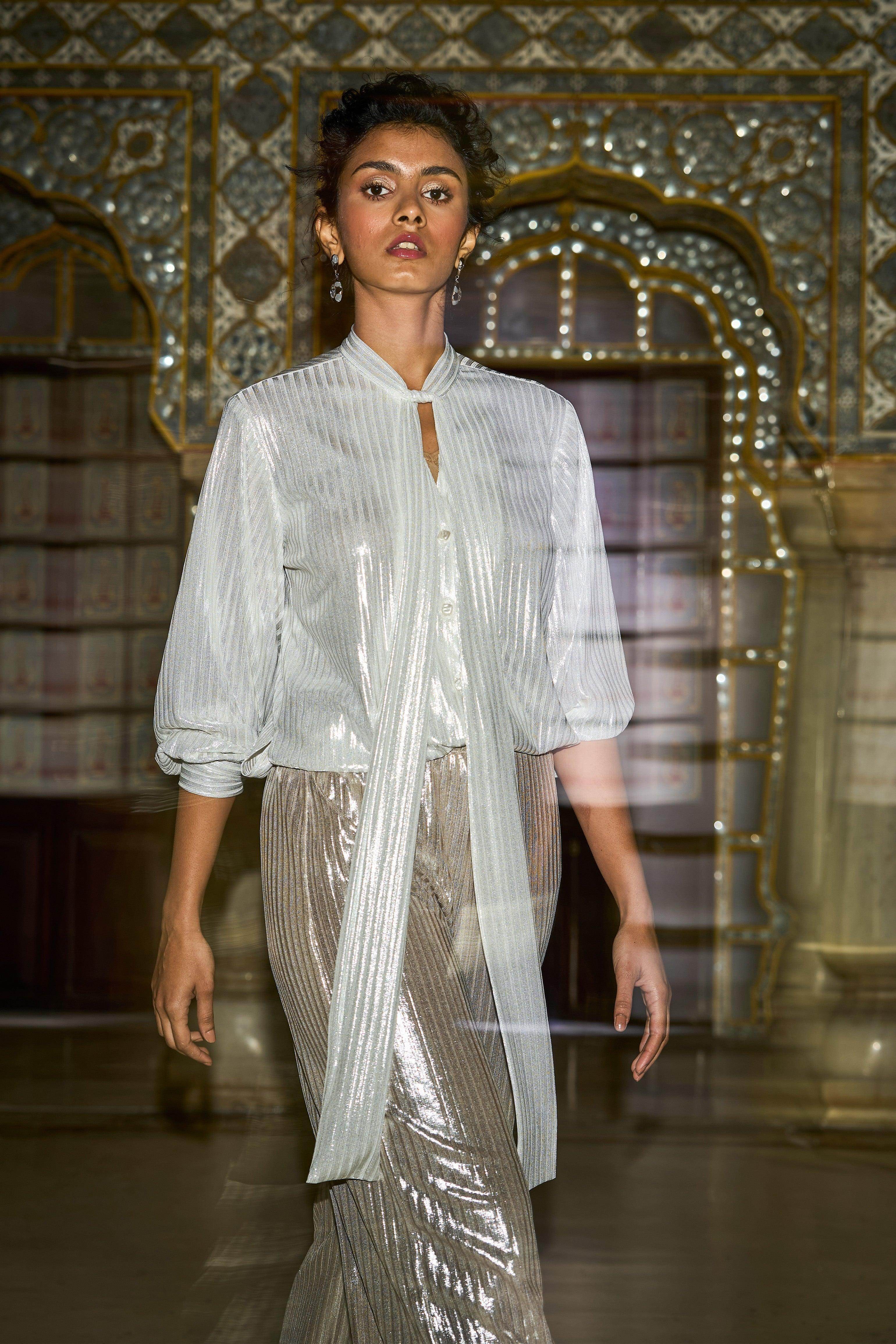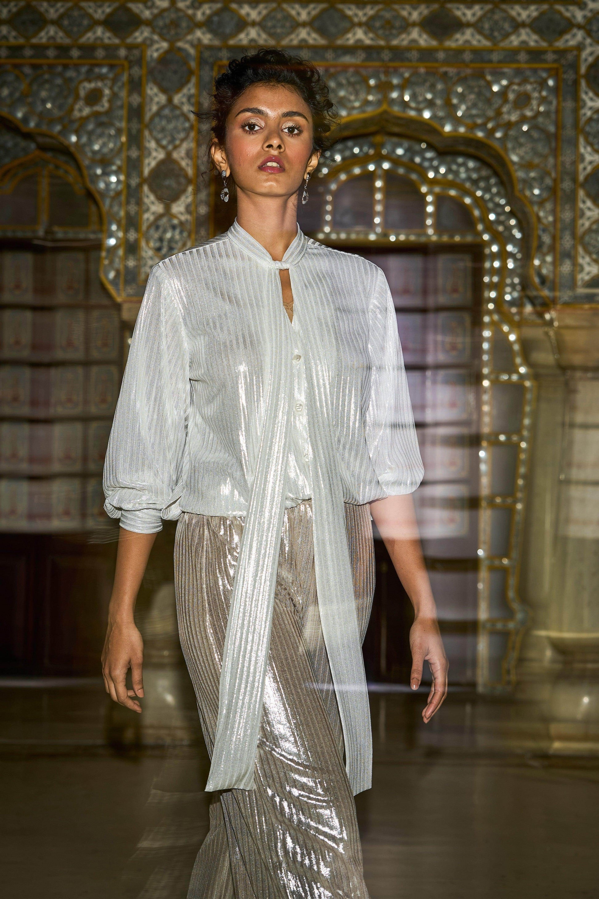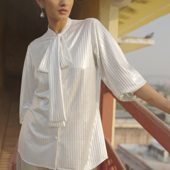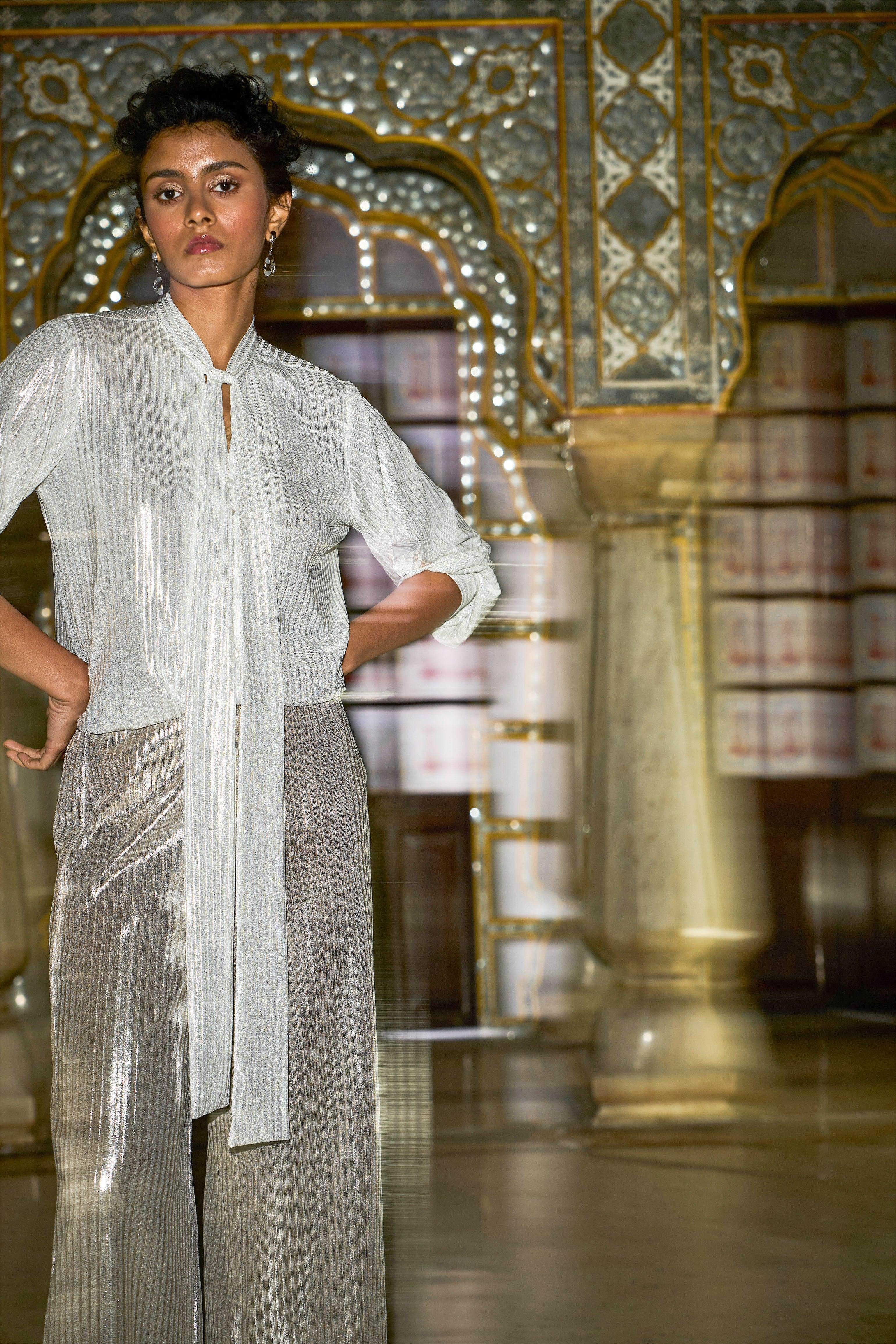 Shimmer textured stripe in soft rose gold. Straight-fit pants with a fully elasticated waist.