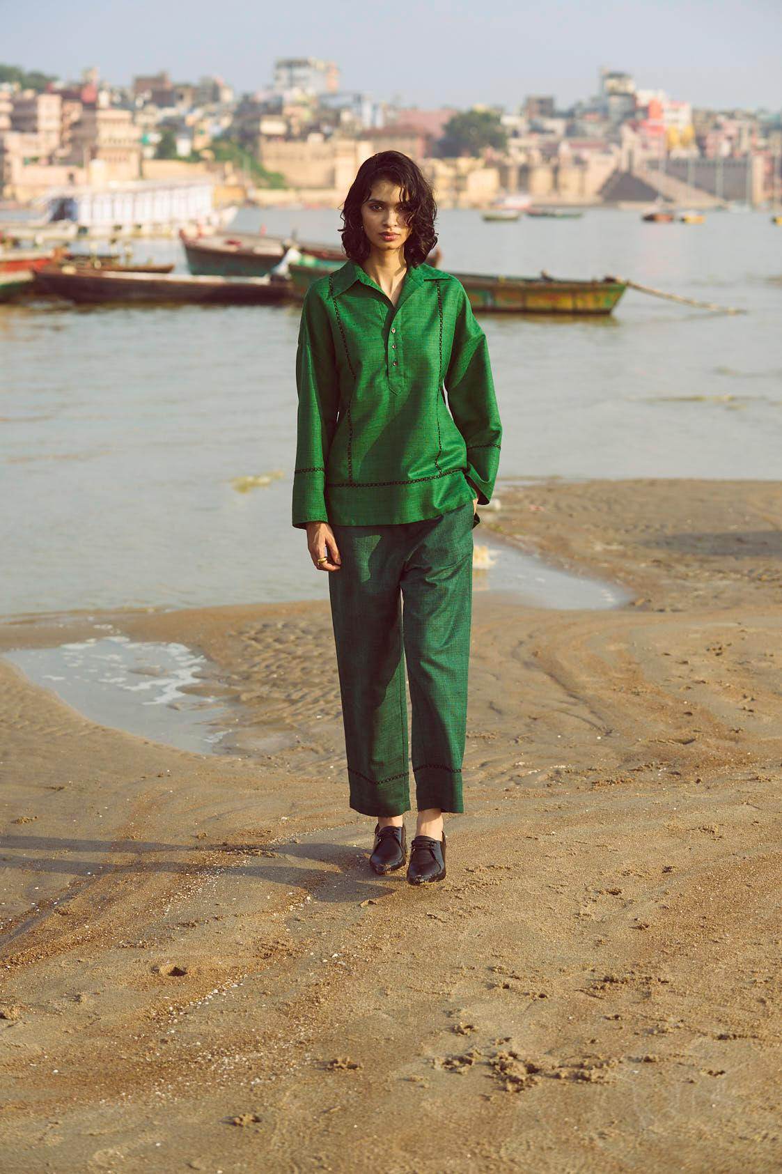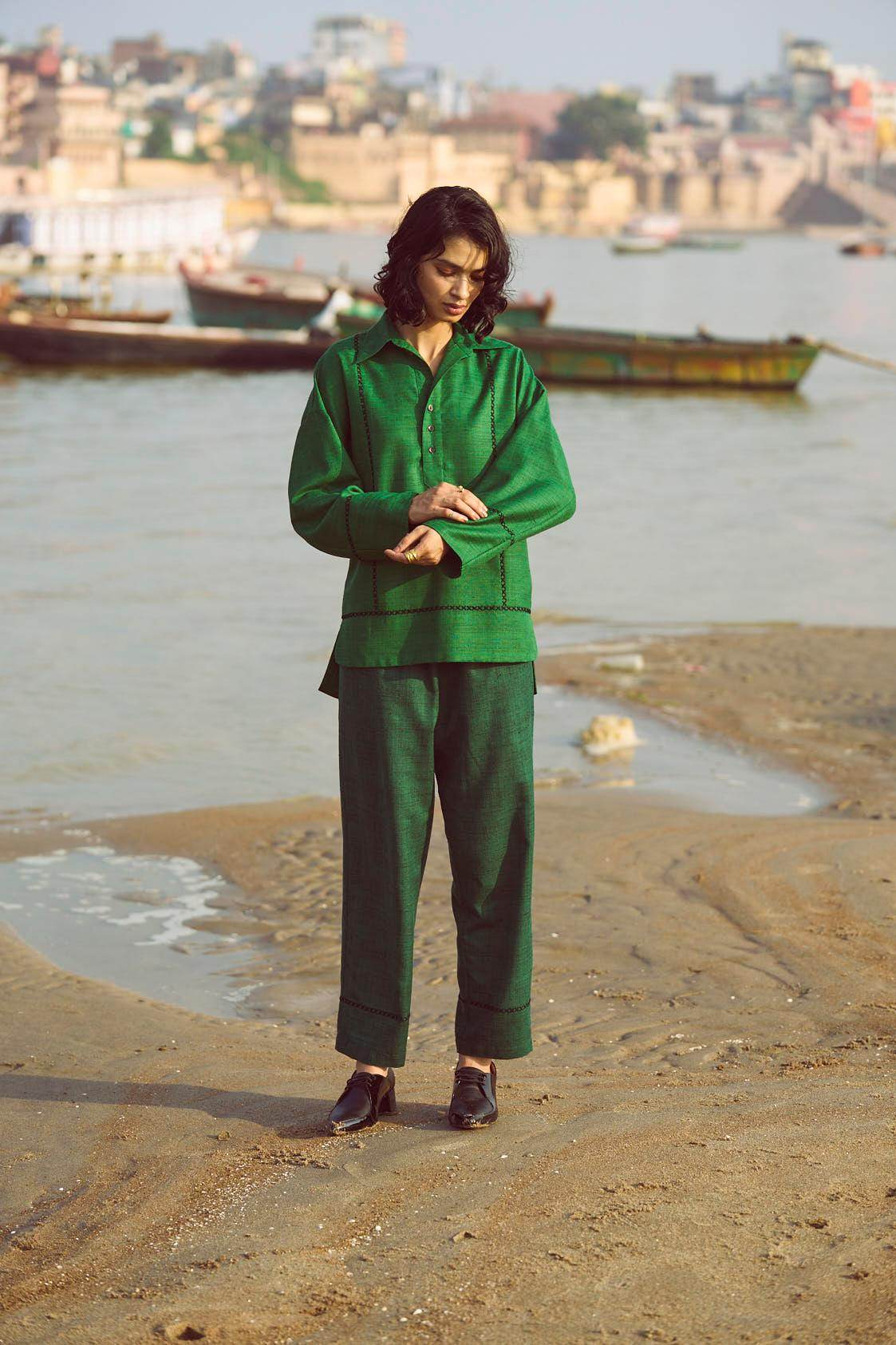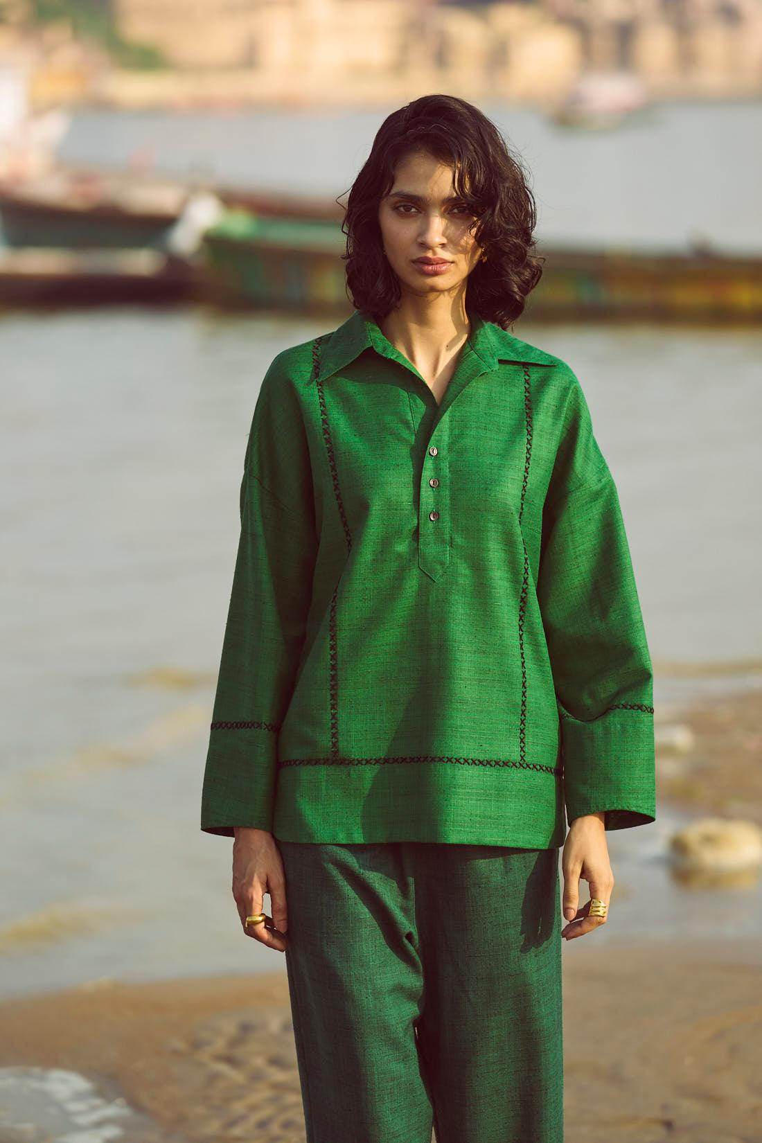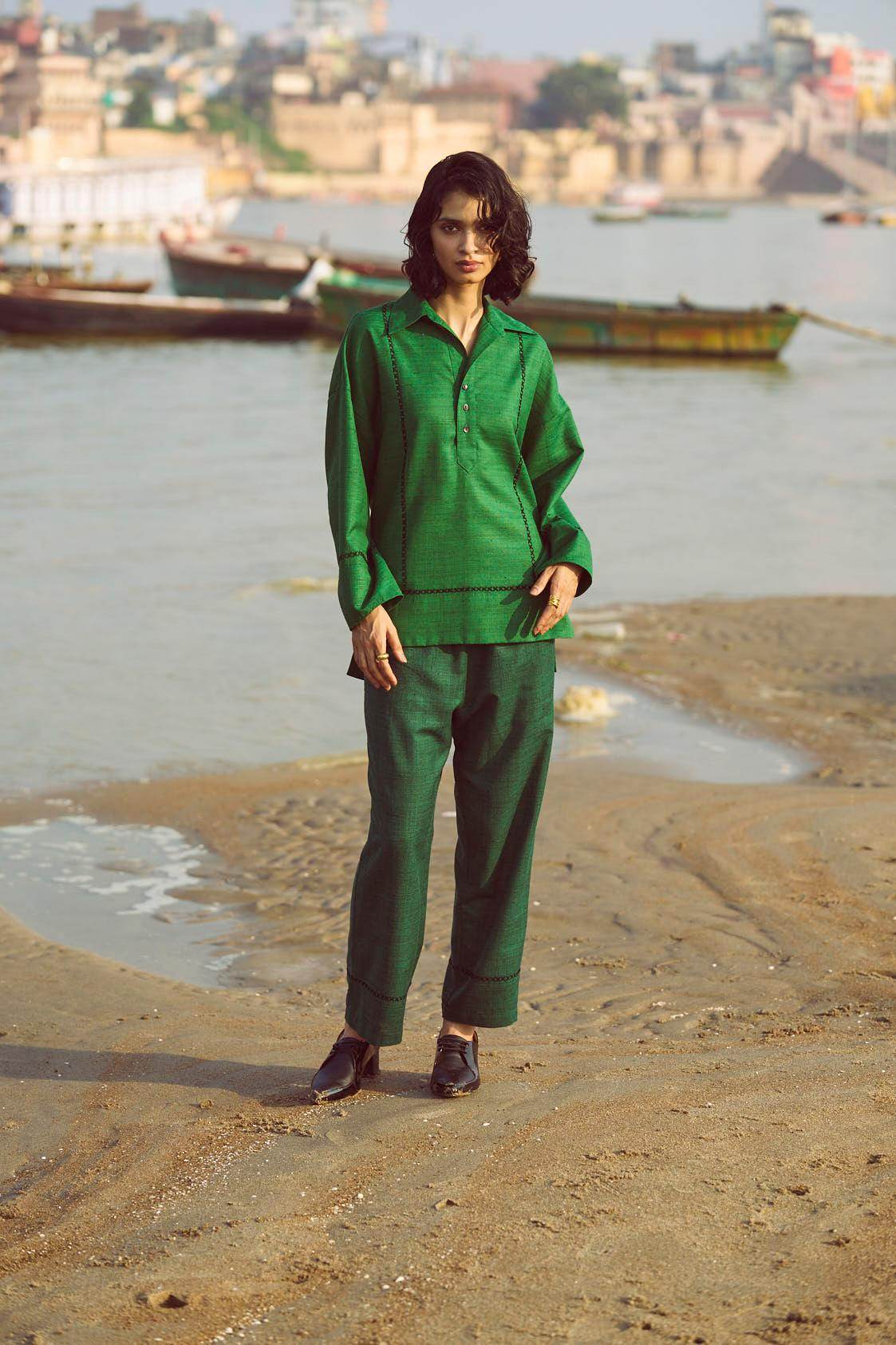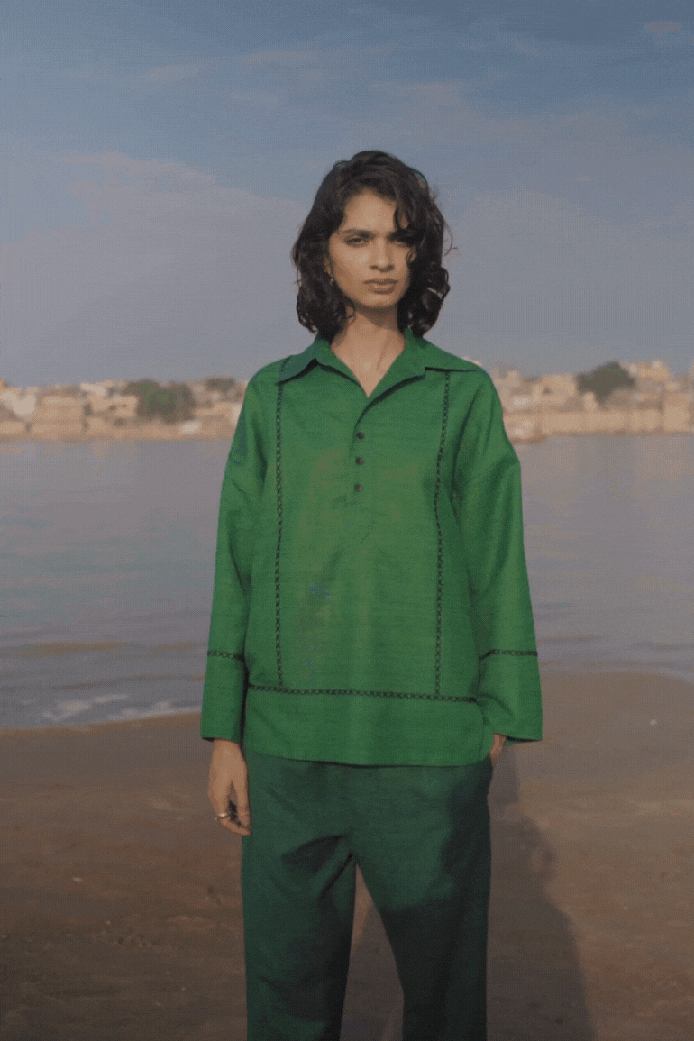 Green popover top in matka slub fabric. Placed contrast black cross stitch detail in front, back and sleeve cuff. Shirt collar. High low hem. Paired with complementing dark green matka slub pants with placed cross stitch embroidery at the bottom hem of the pants. Pockets on the side. Elasticated at the waist.