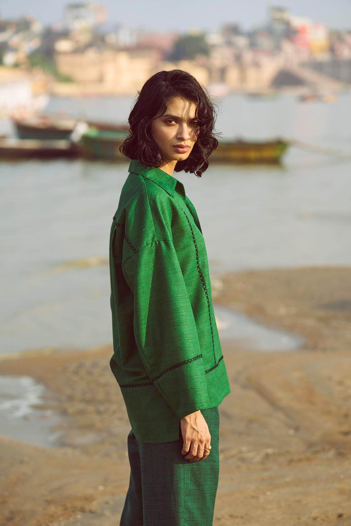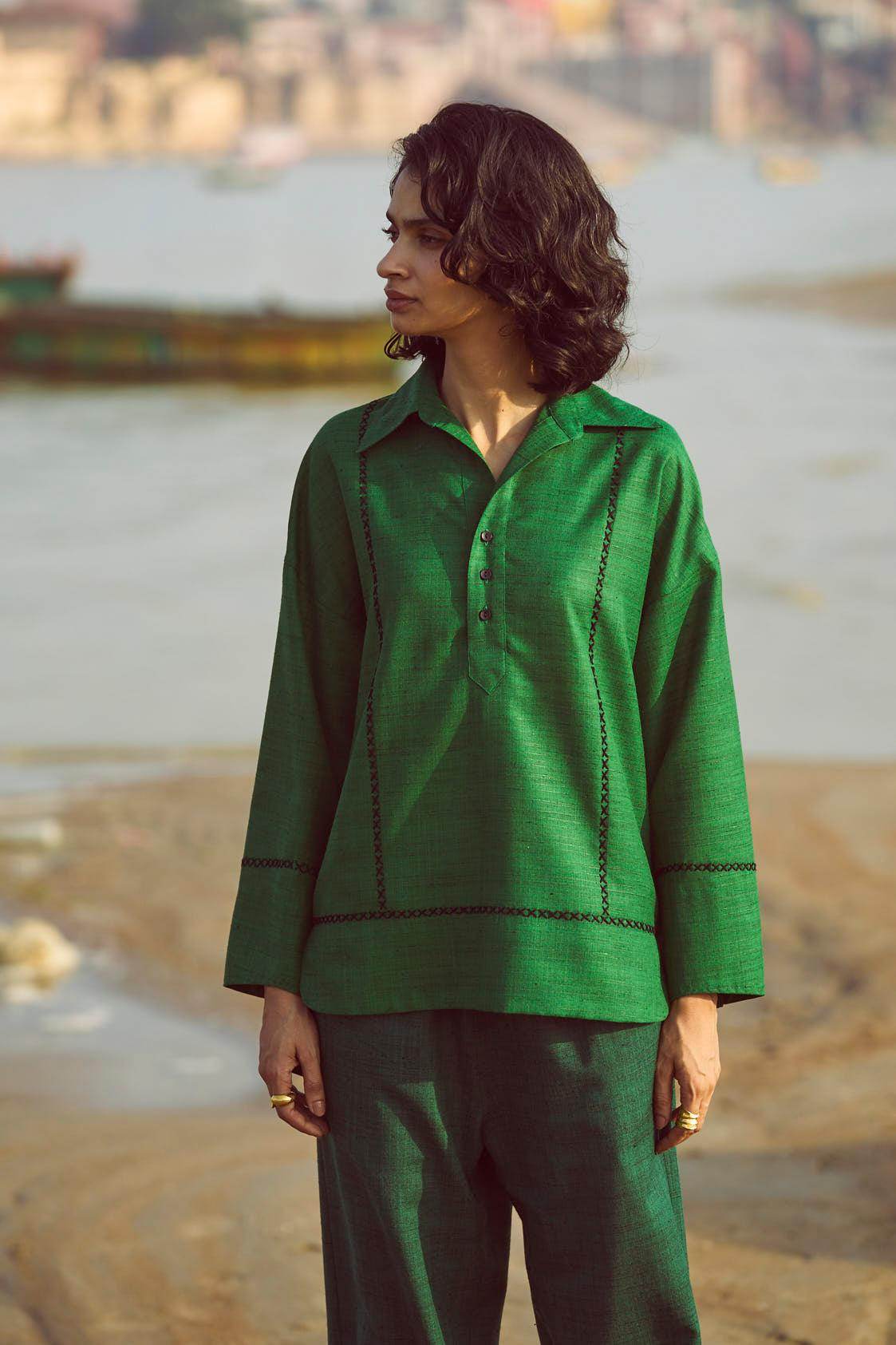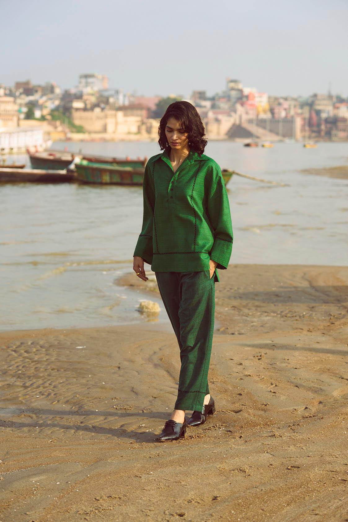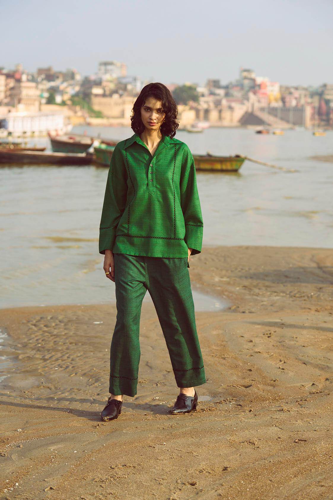 Green popover top in matka slub fabric. Placed contrast black cross stitch detail in front, back and sleeve cuff. Shirt collar. High low hem. Paired with complementing dark green matka slub pants with placed cross stitch embroidery at the bottom hem of the pants. Pockets on the side. Elasticated at the waist.