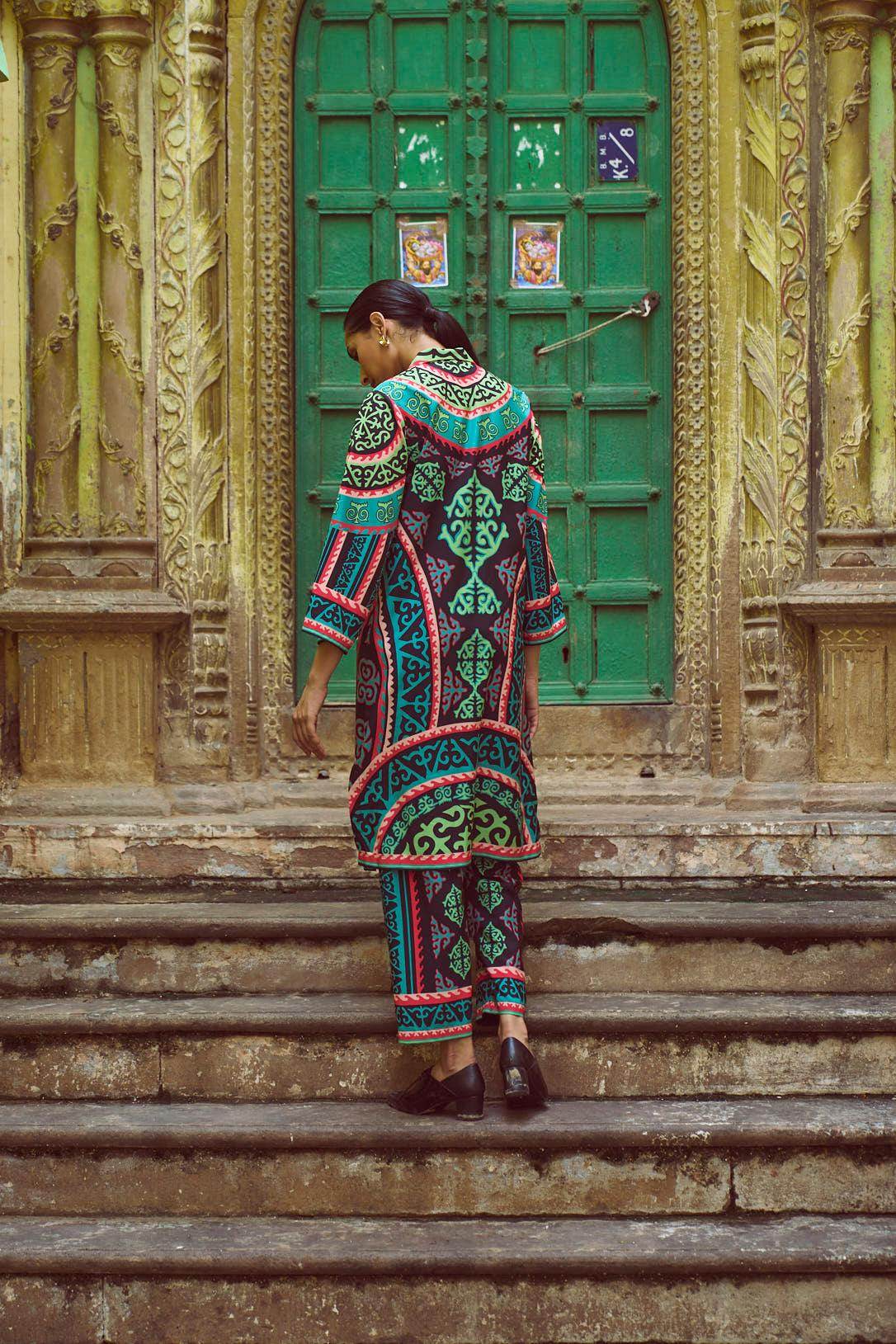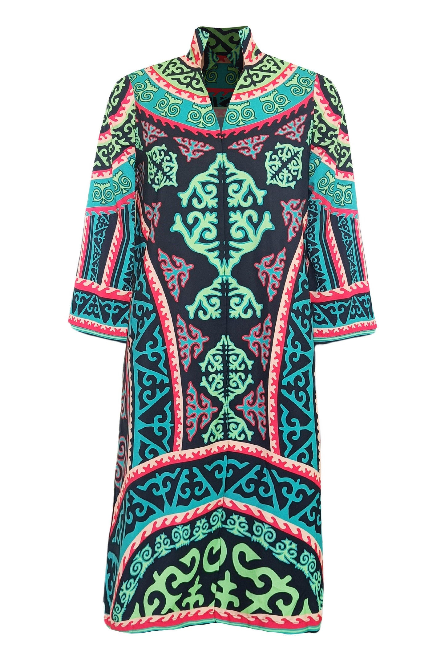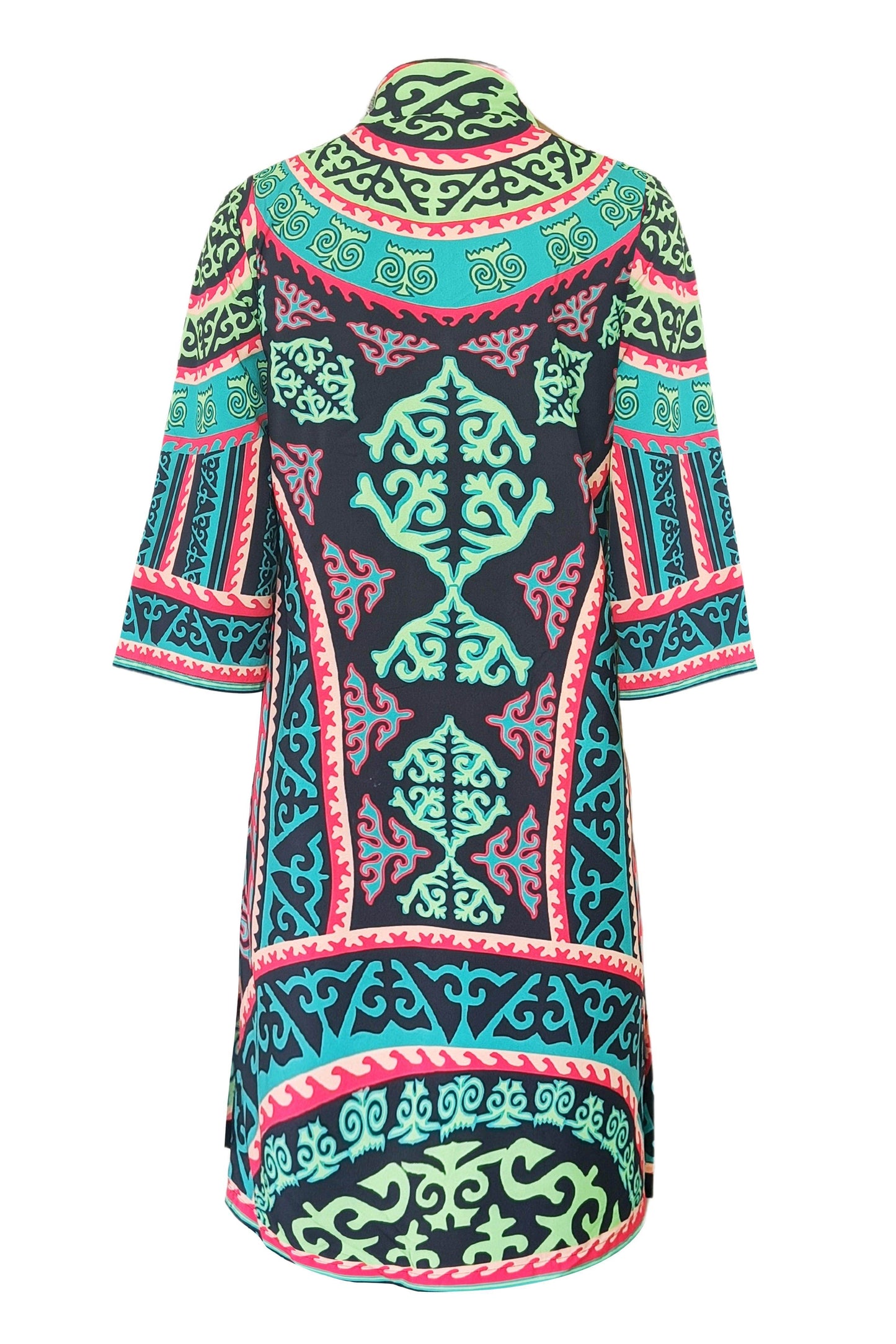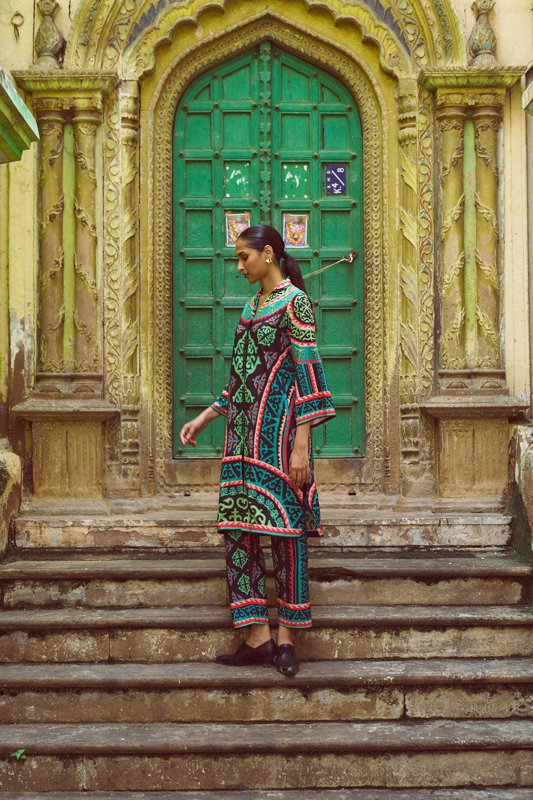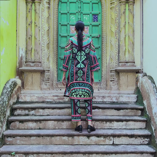 Mulitcolour tribal printed longline top on black base. Hook and eye closure at the front. Shirt collar and V-neck. Pockets and slits on the sides. Can be worn as a top or a jacket. Relaxed fit.