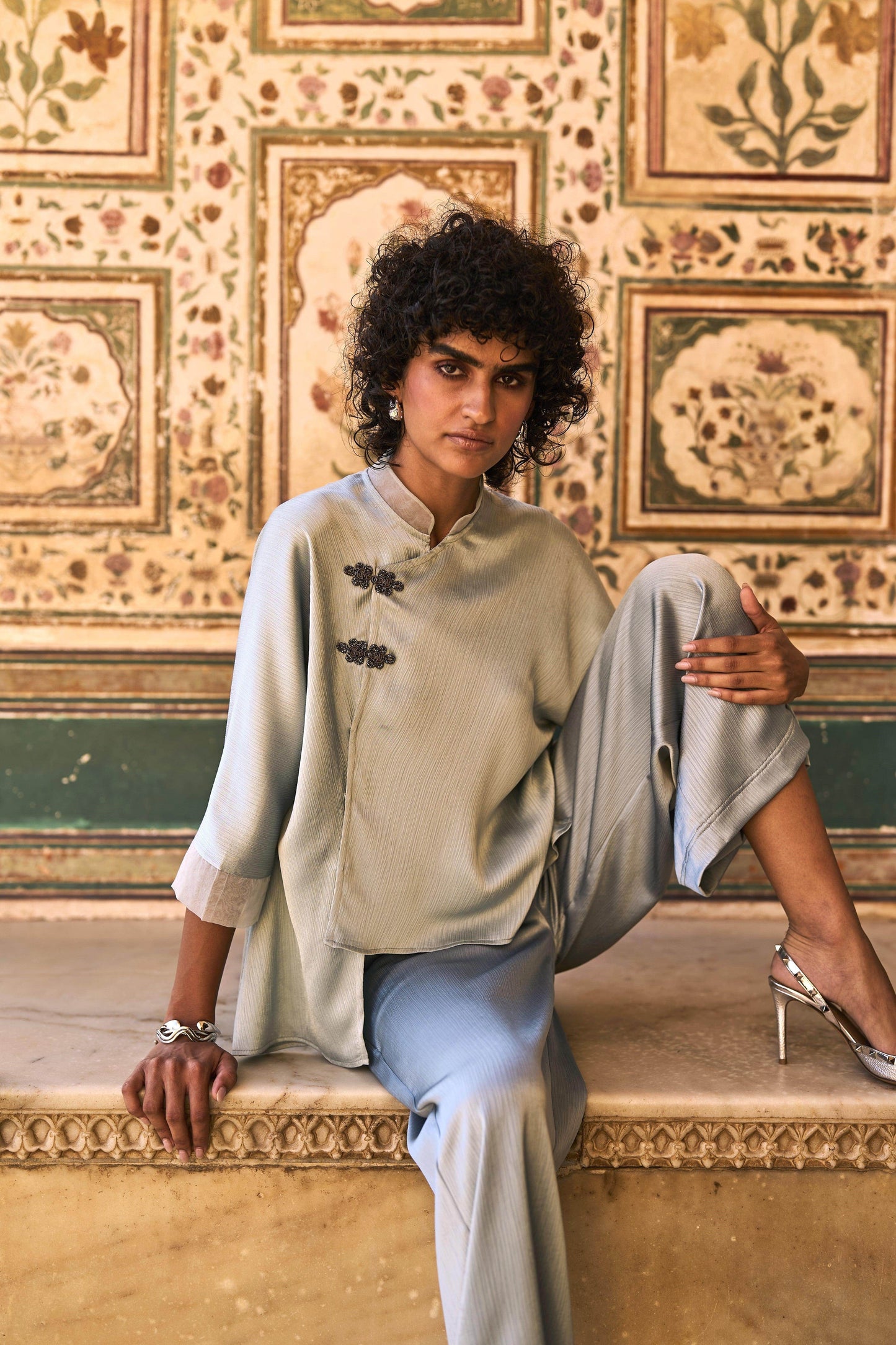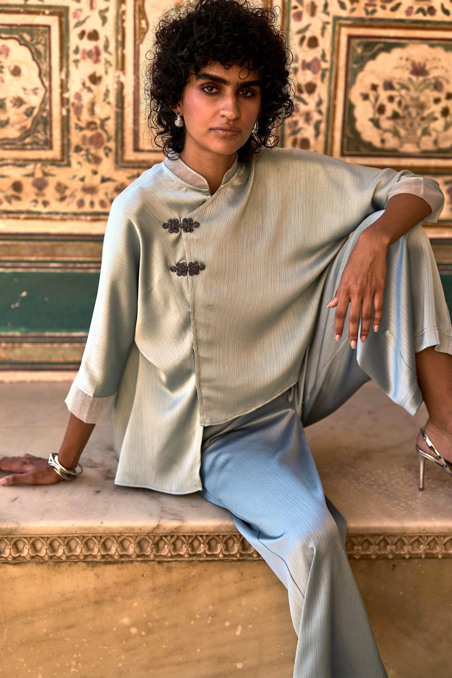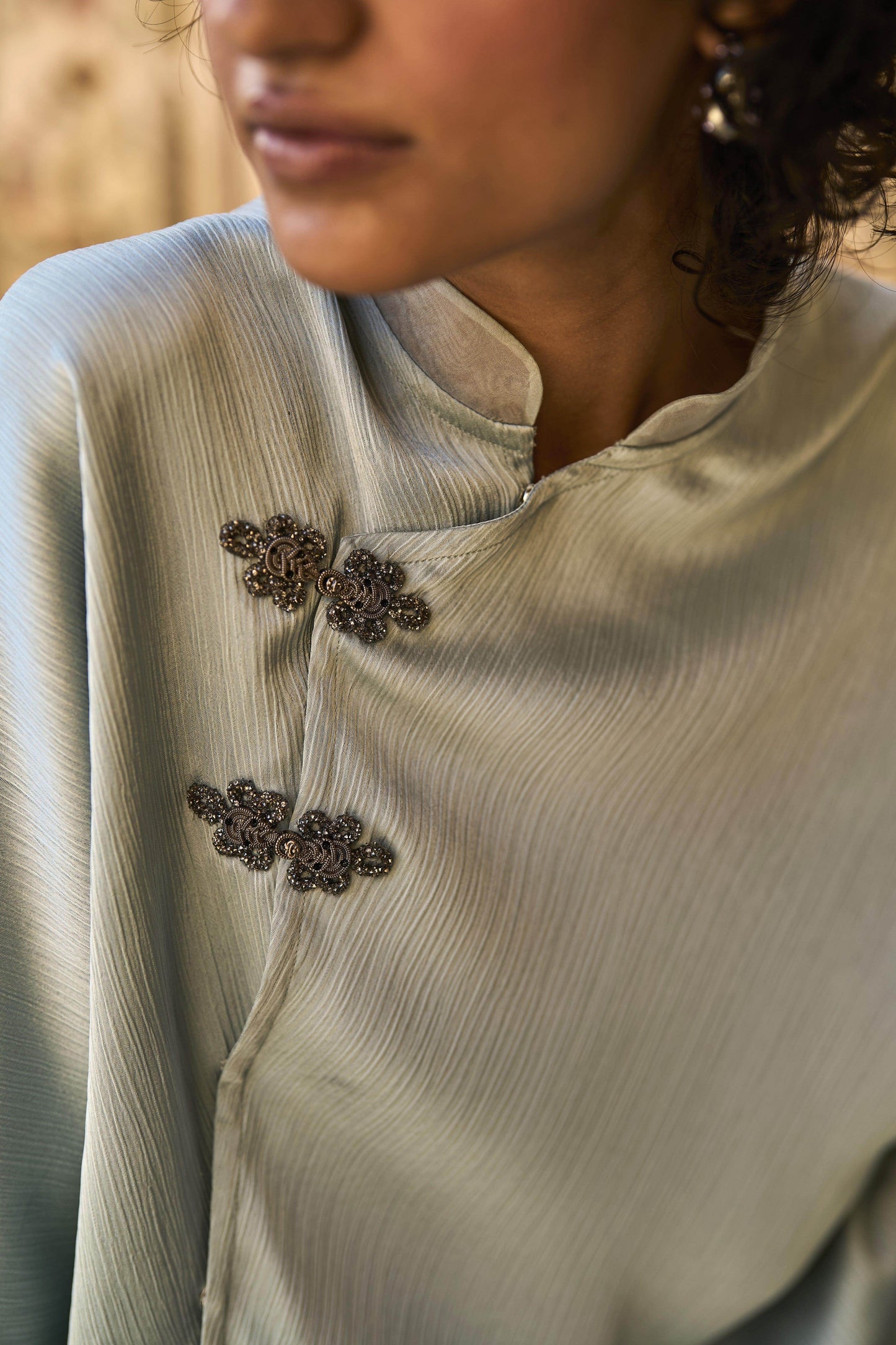 Uneven hem drapey top in a textured satin crape. Off center placket with jewel chinese inspired buttons. Internal snap button closure. Tonal organize fabric detailing on the band collar and sleeve cuff. Relaxed fit.