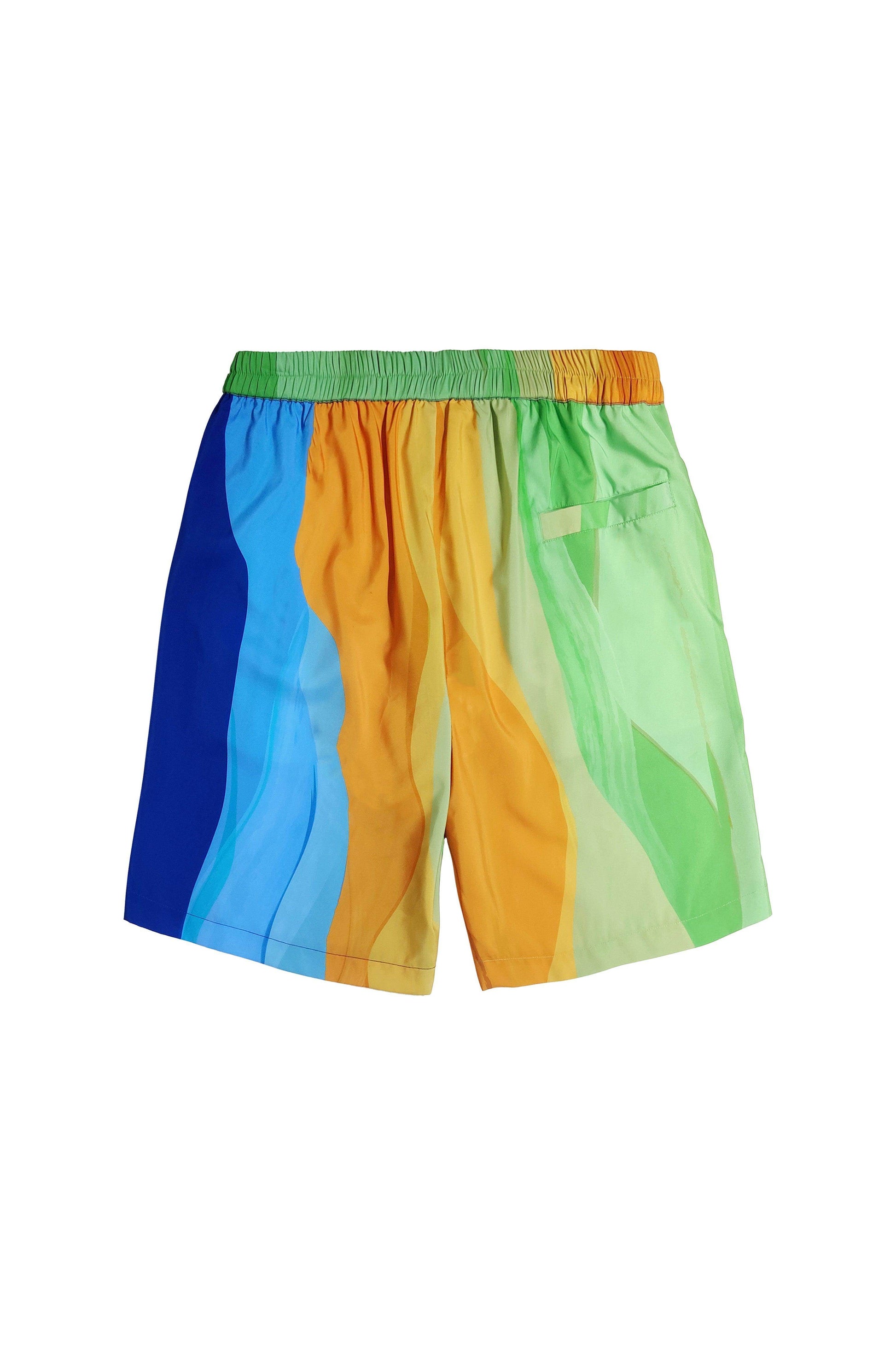 Shorts set in hand-painted water colour-inspired print. Half-sleeve button-down shirt with concealed button placket. Vent on the sides. Relaxed fit. Paired with matching swim shorts. Elasticated at the waist. Metallic snap button and zip closure at the front. Pockets on the side and back. Lined with recycled polyester mesh.