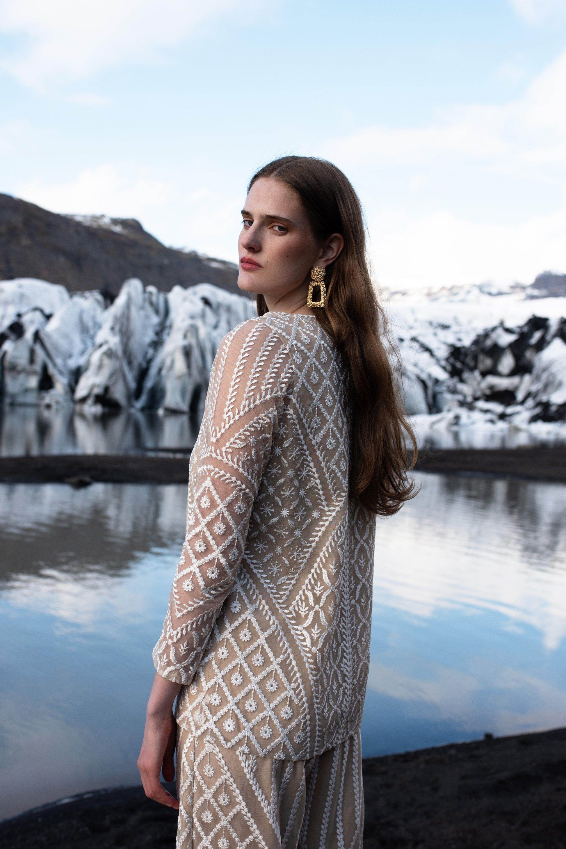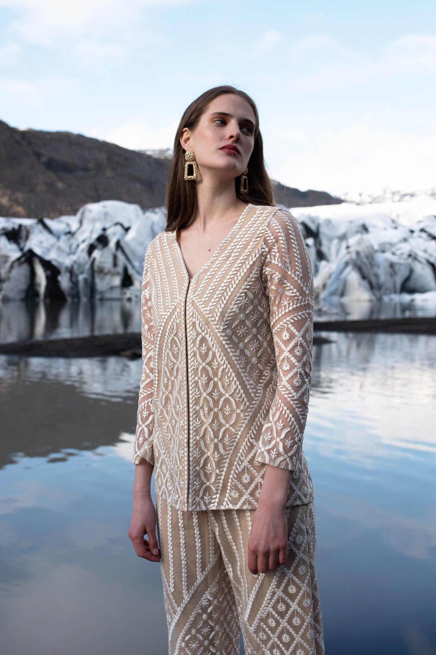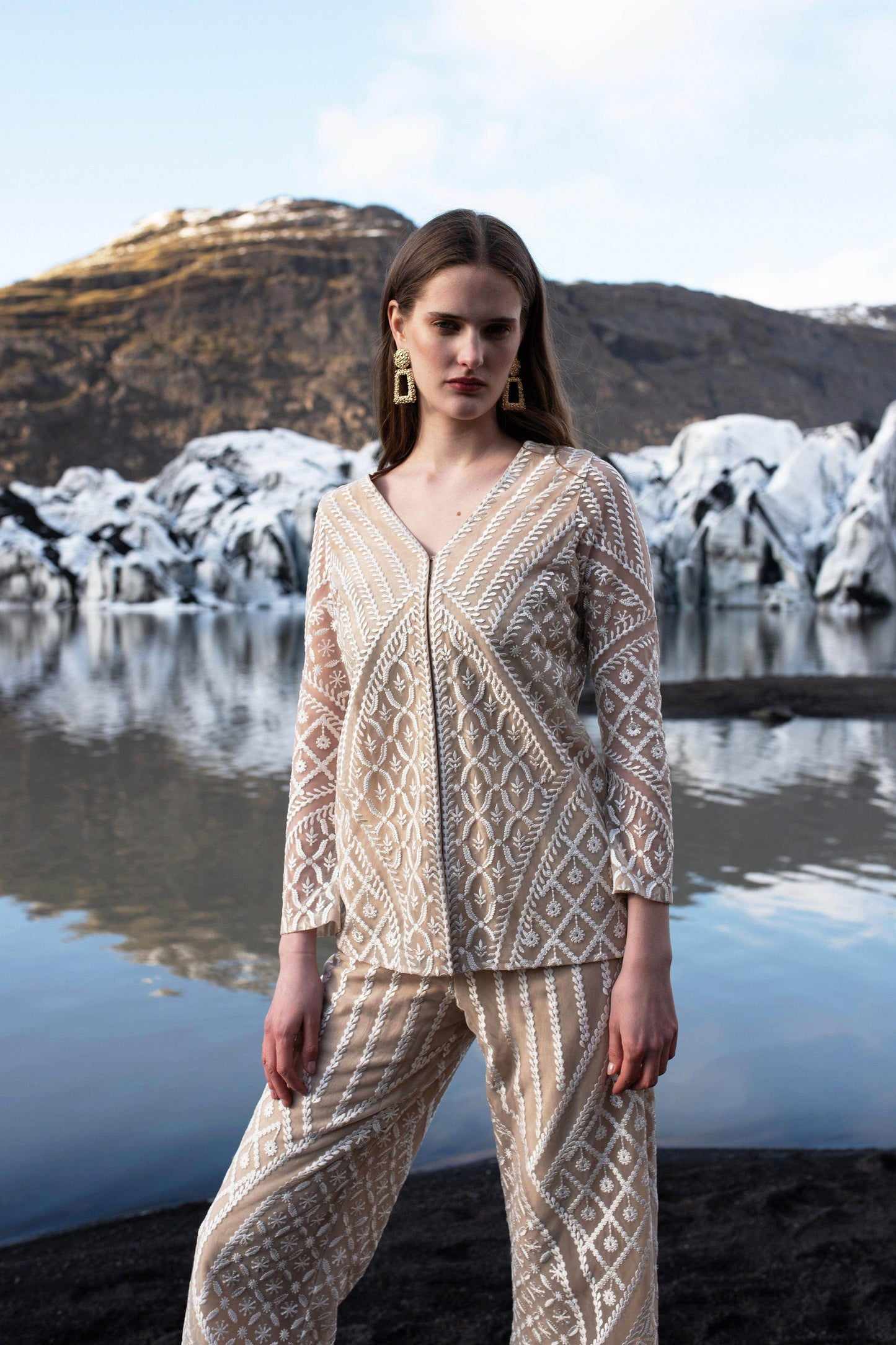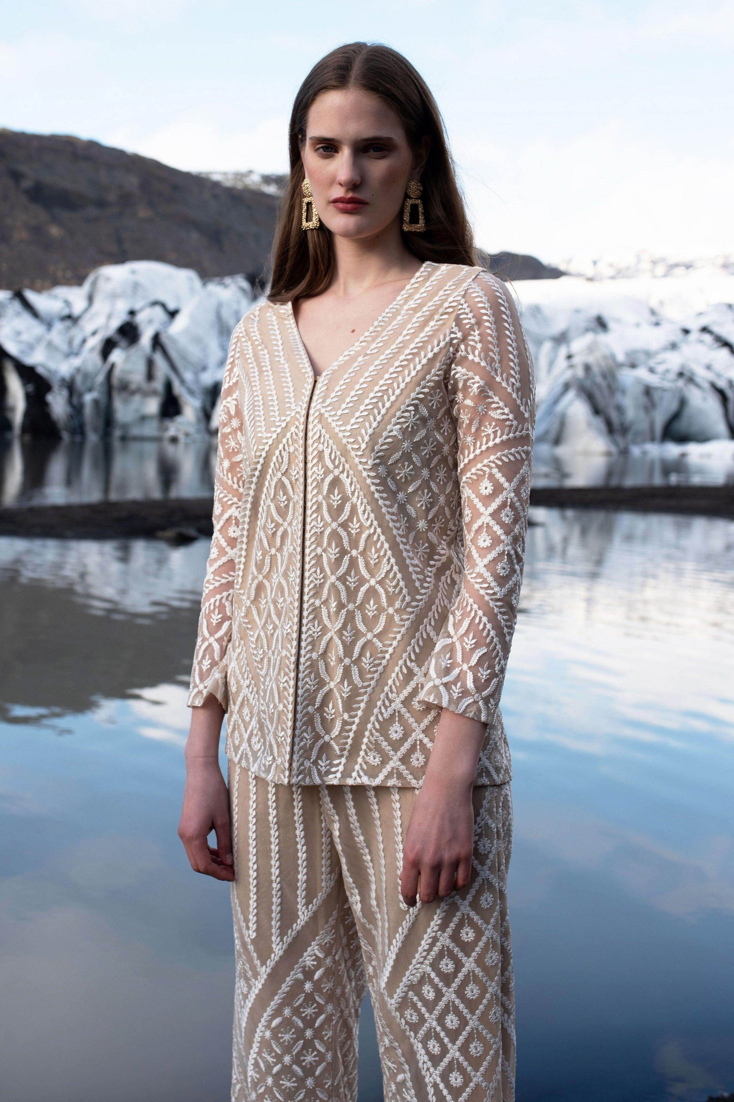 Ankle lenght straight fit pants with allover placement embroidery in white resham thread, mixing delicate floral and opulent baroque inspired motifs. Elasticated at the waist, hook-eye and zip closure on the side. The pants are fuly lined in a contrasting nude colour to show off the detailed embroidery.