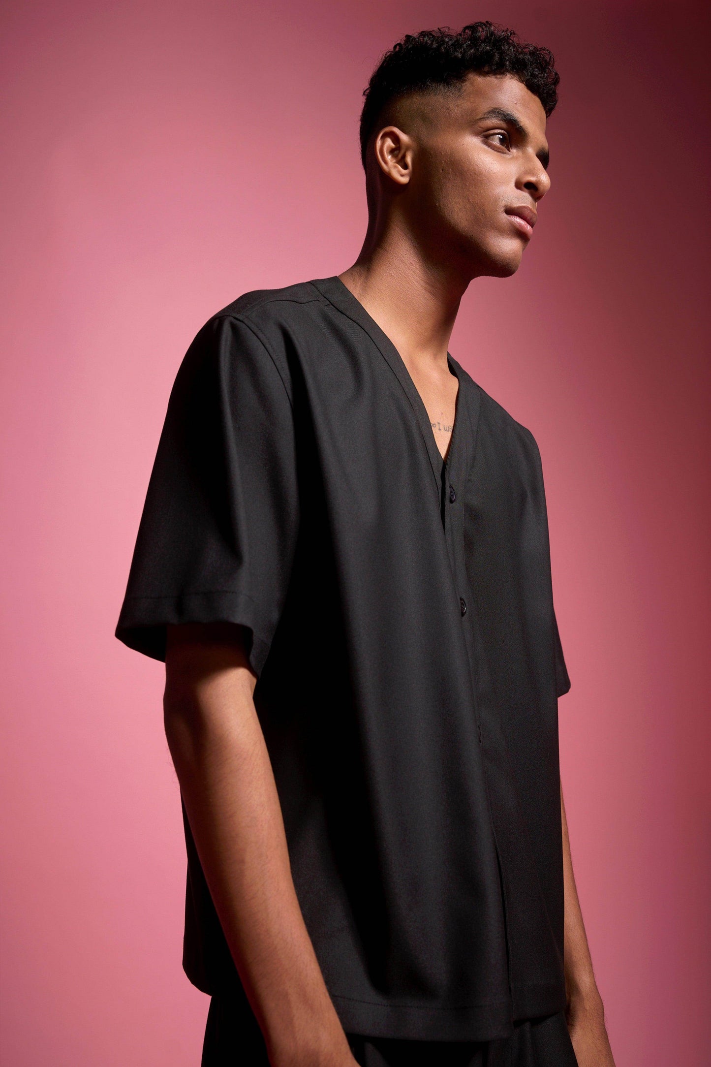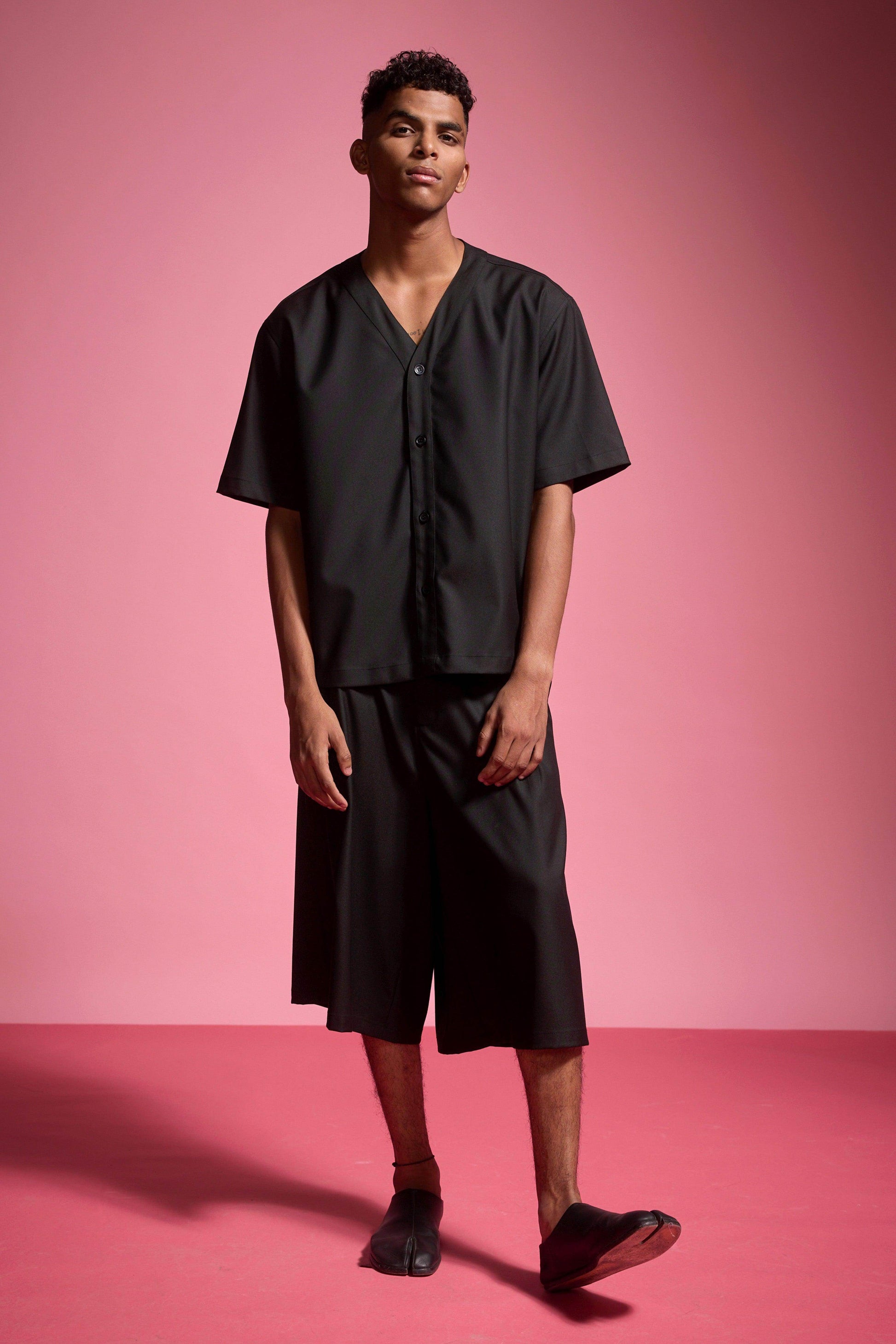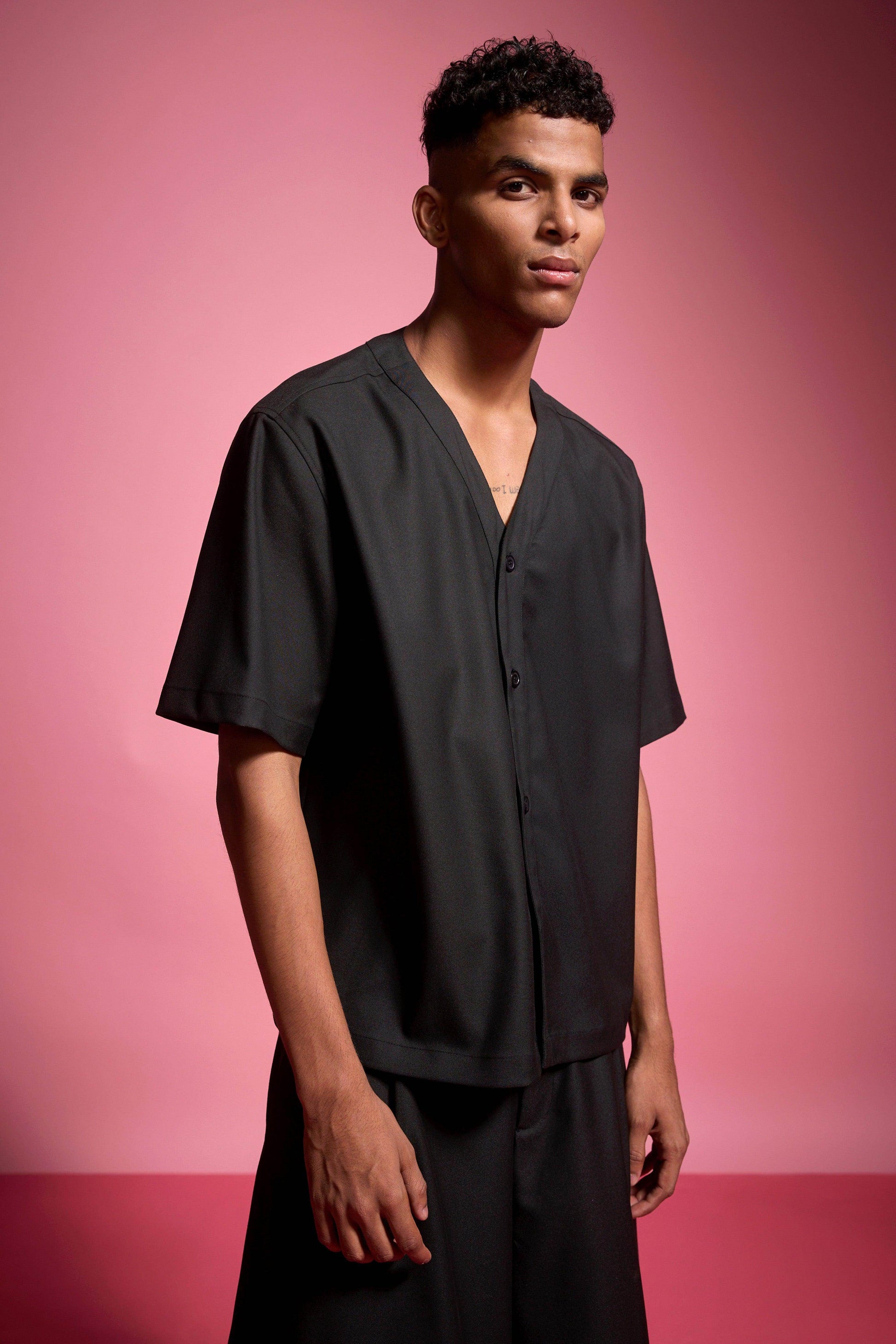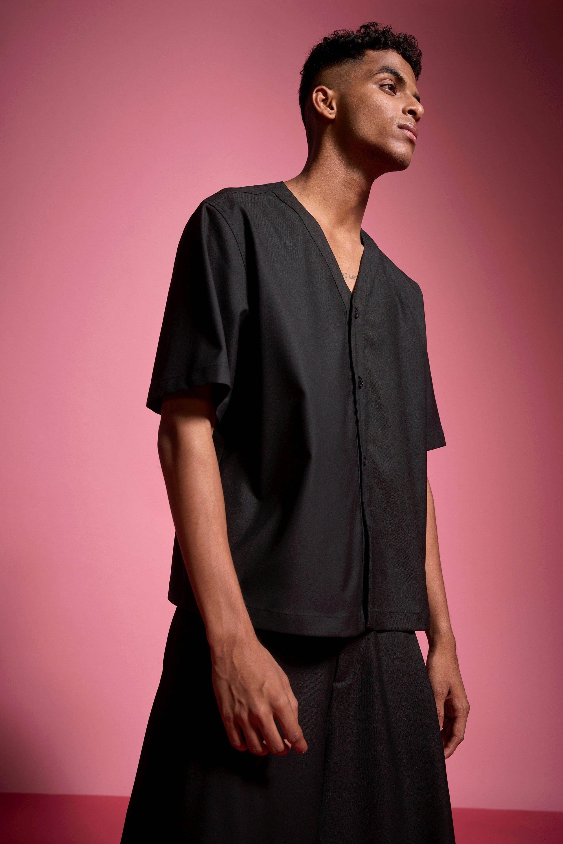 Y-neck half sleeve shirt in all-weather suiting material. Relaxed fit with a front button-down placket.