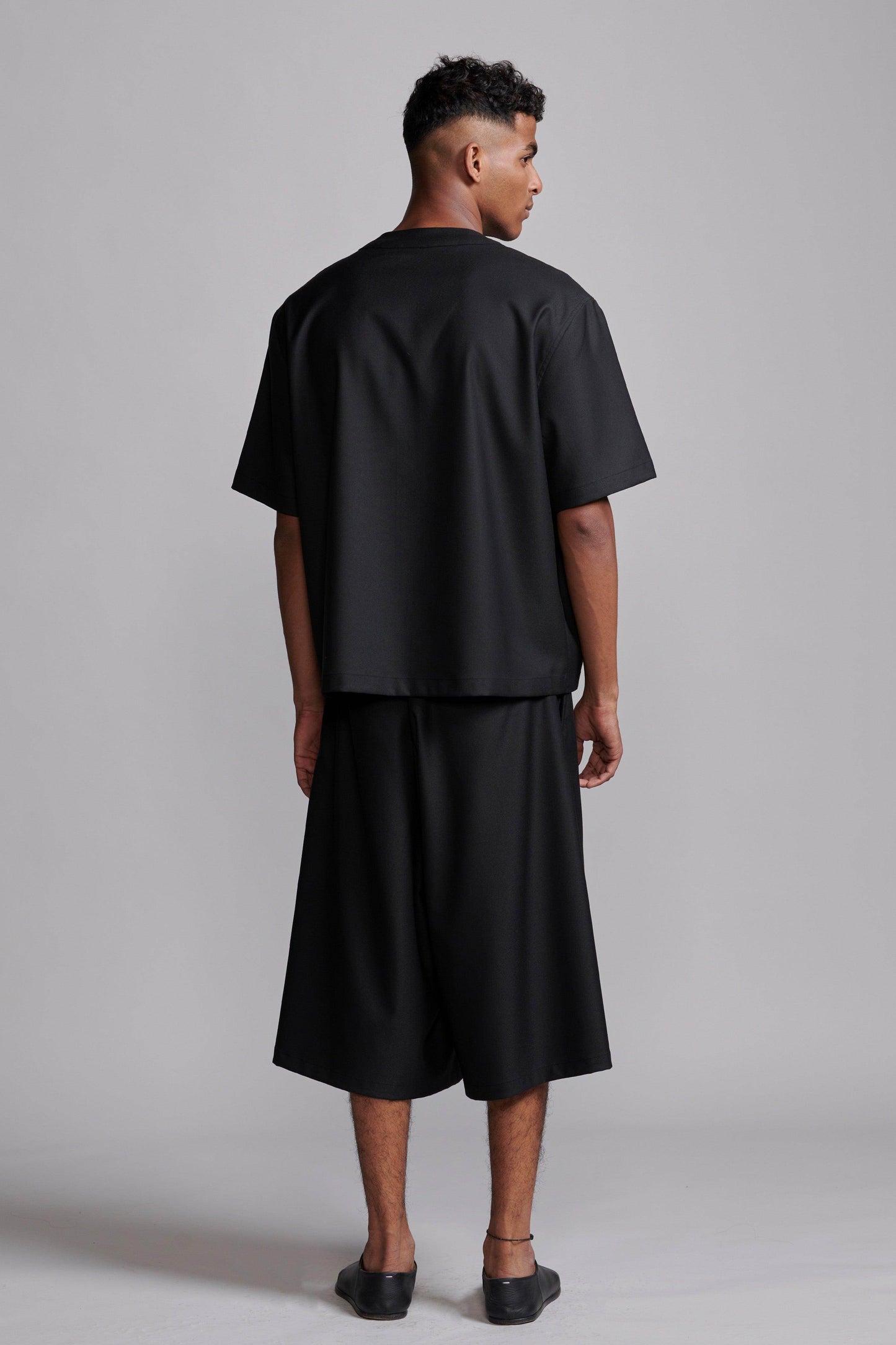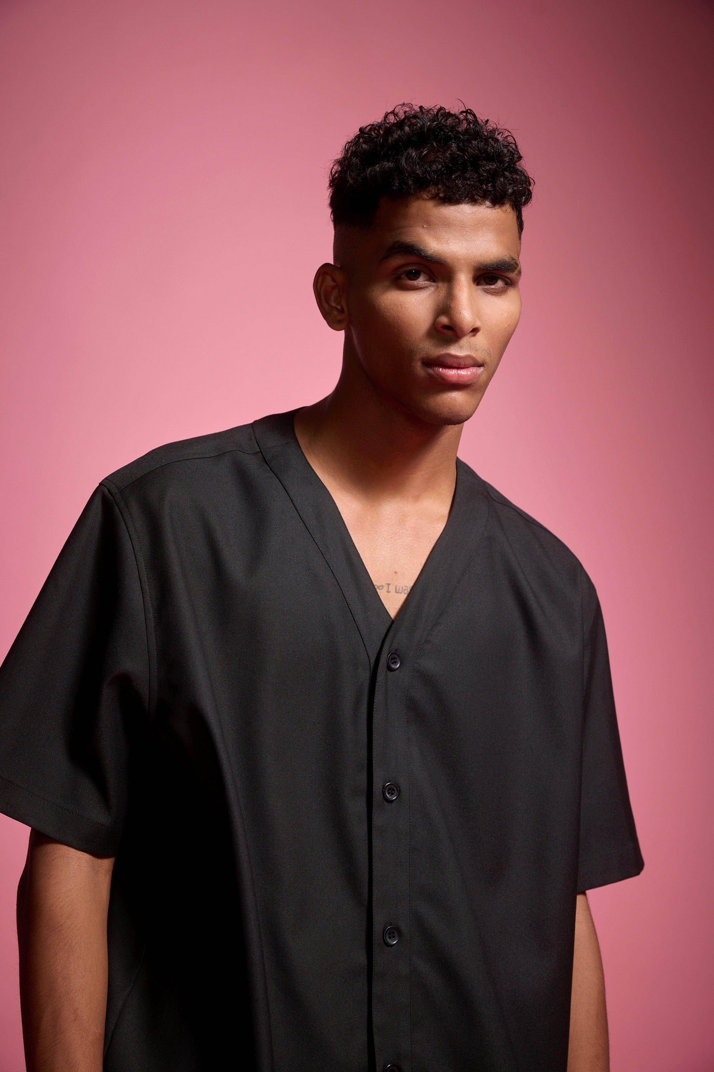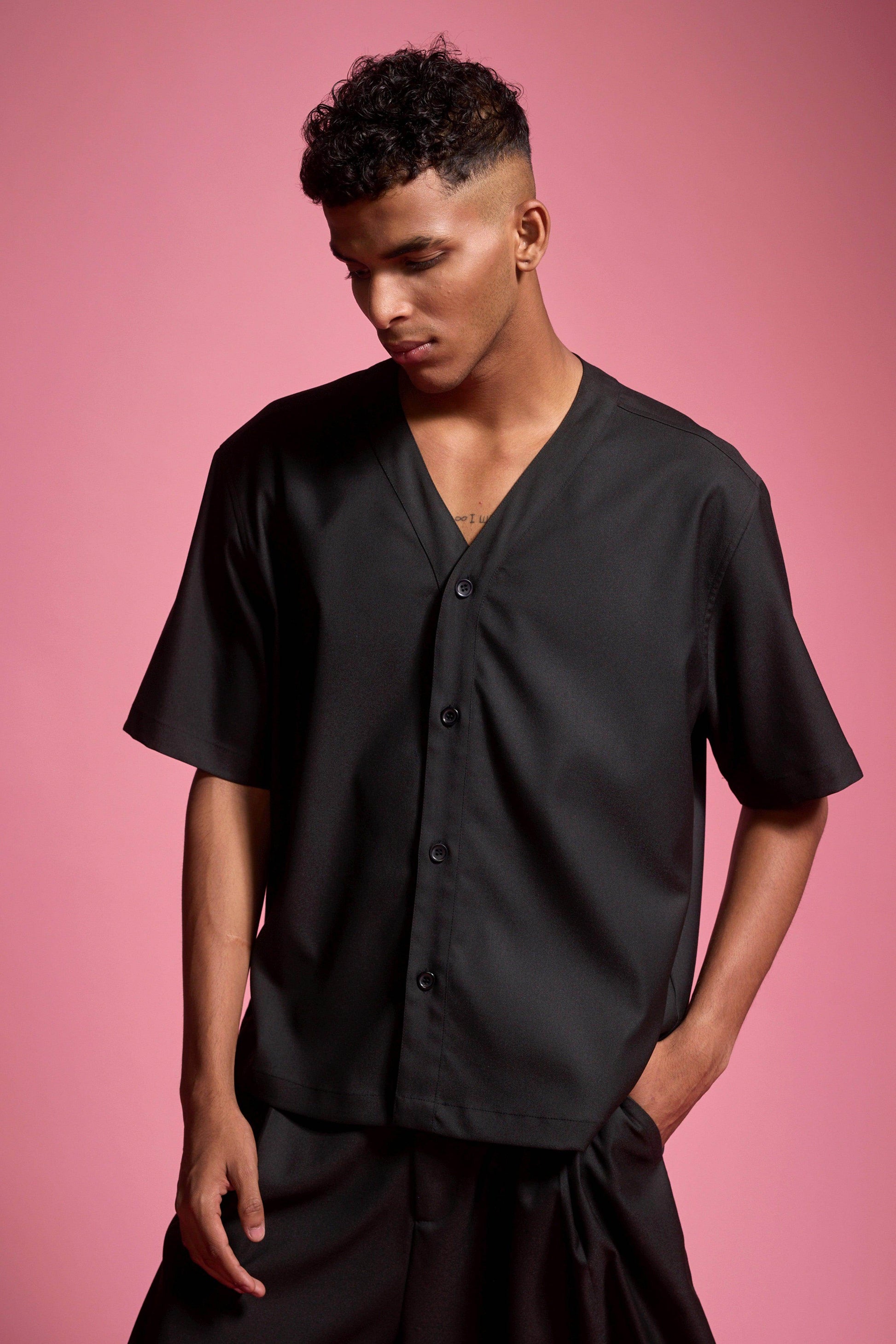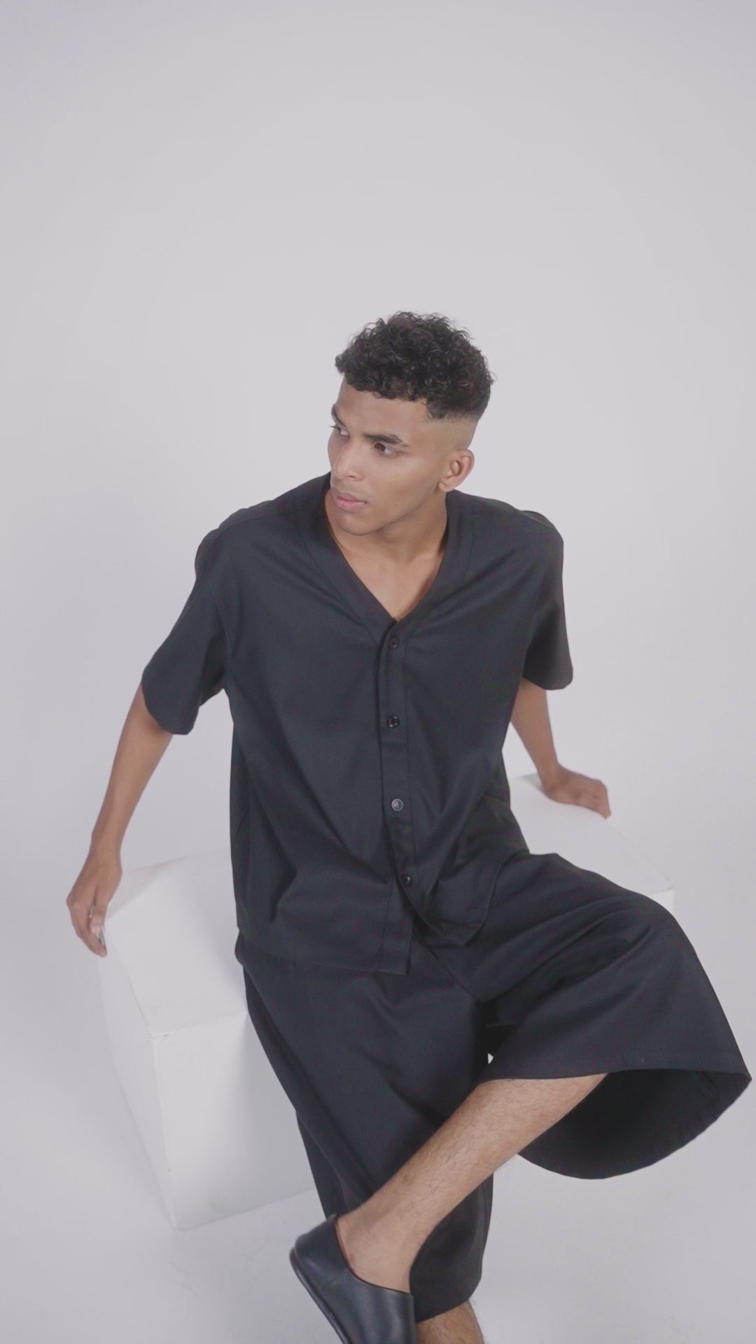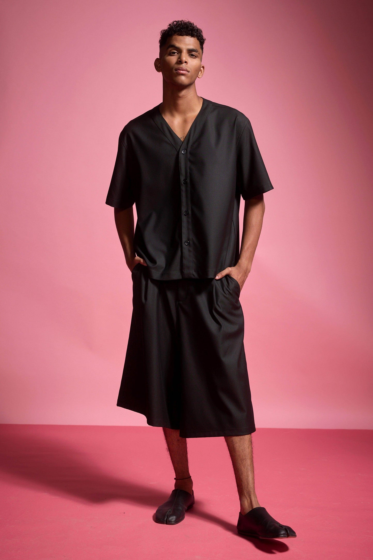 Y-neck half sleeve shirt in all-weather suiting material. Relaxed fit with a front button-down placket.