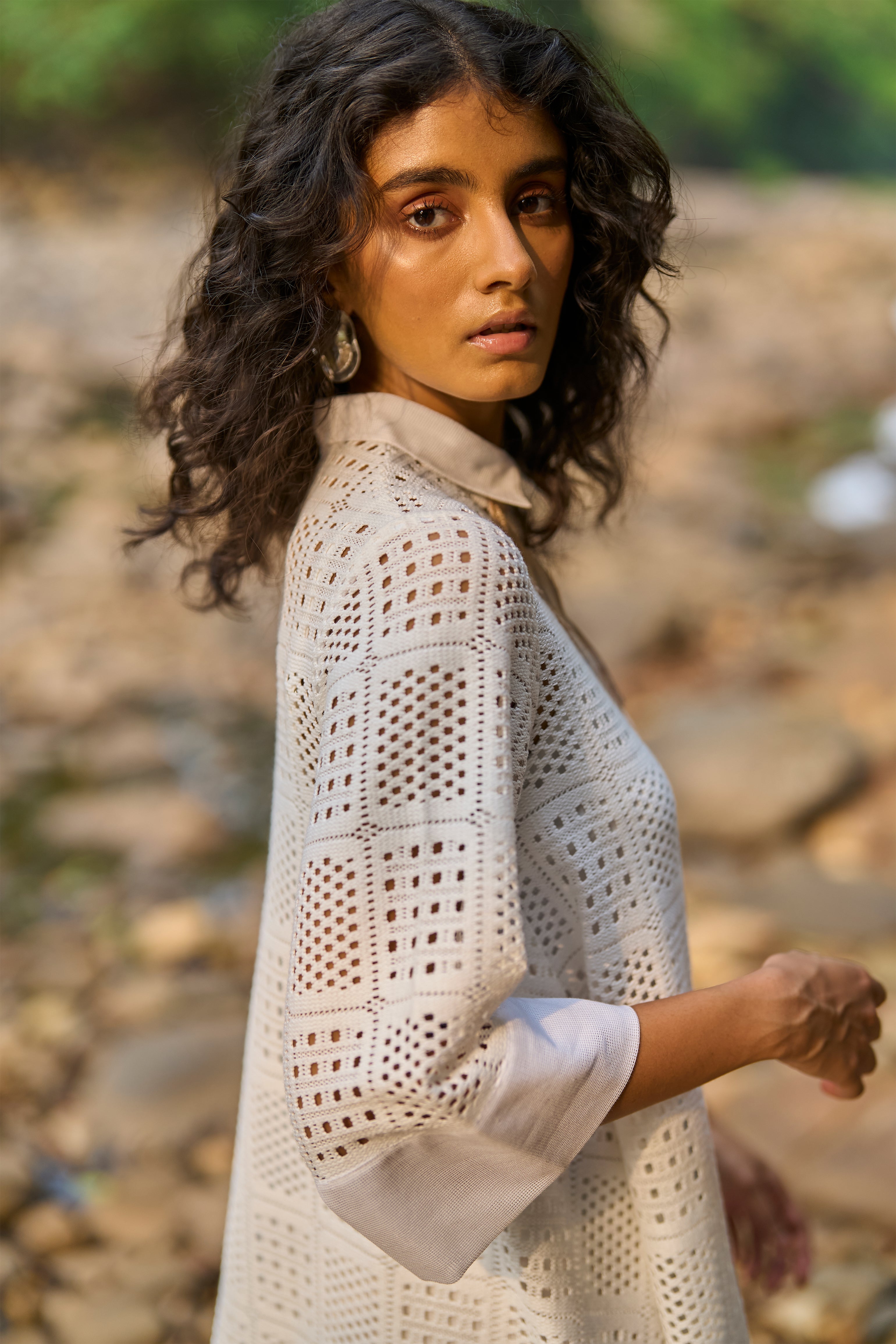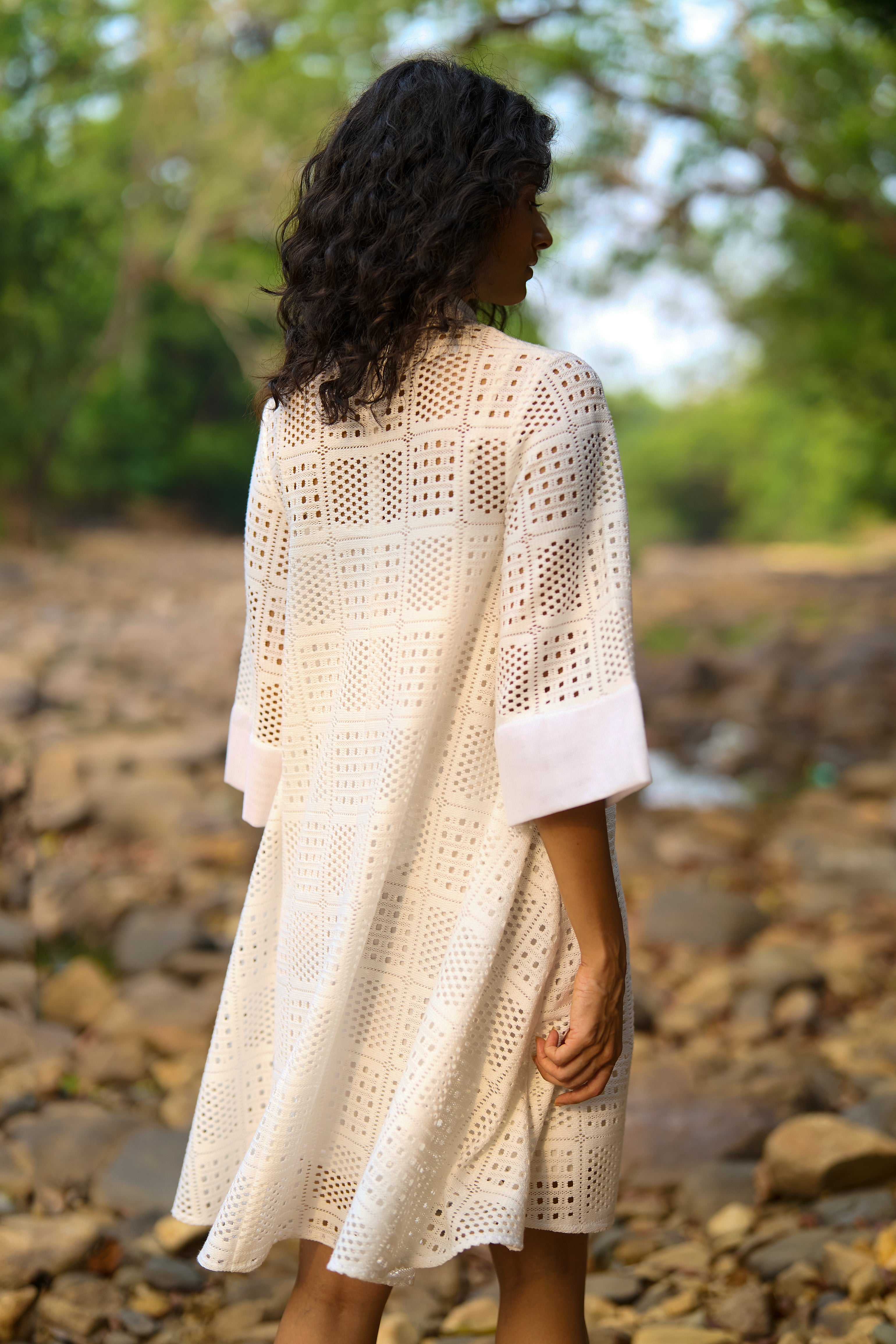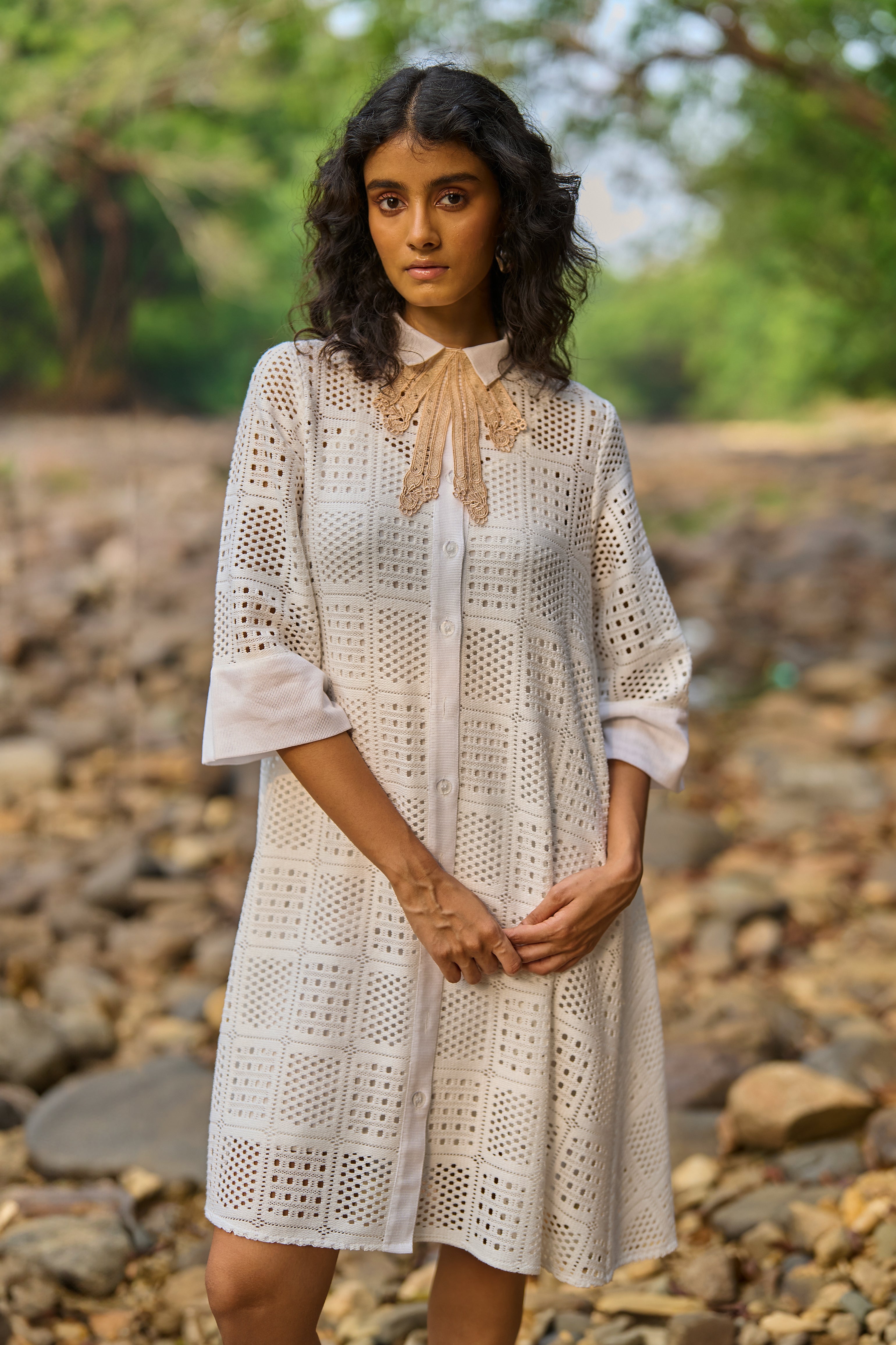 White relaxed fit A-line lace dress. Crochet knitted fabric dress with elbow-length sleeves. Comes with a detachable beige lace bow on collar. Front button down placket with transparent buttons. Comes with a slip.