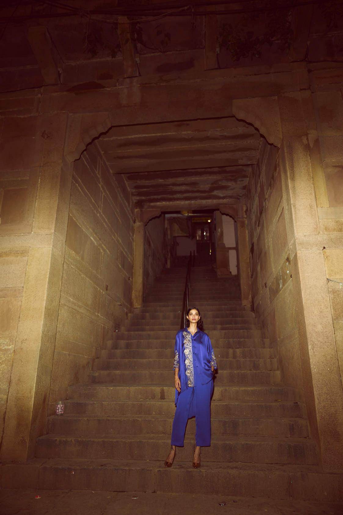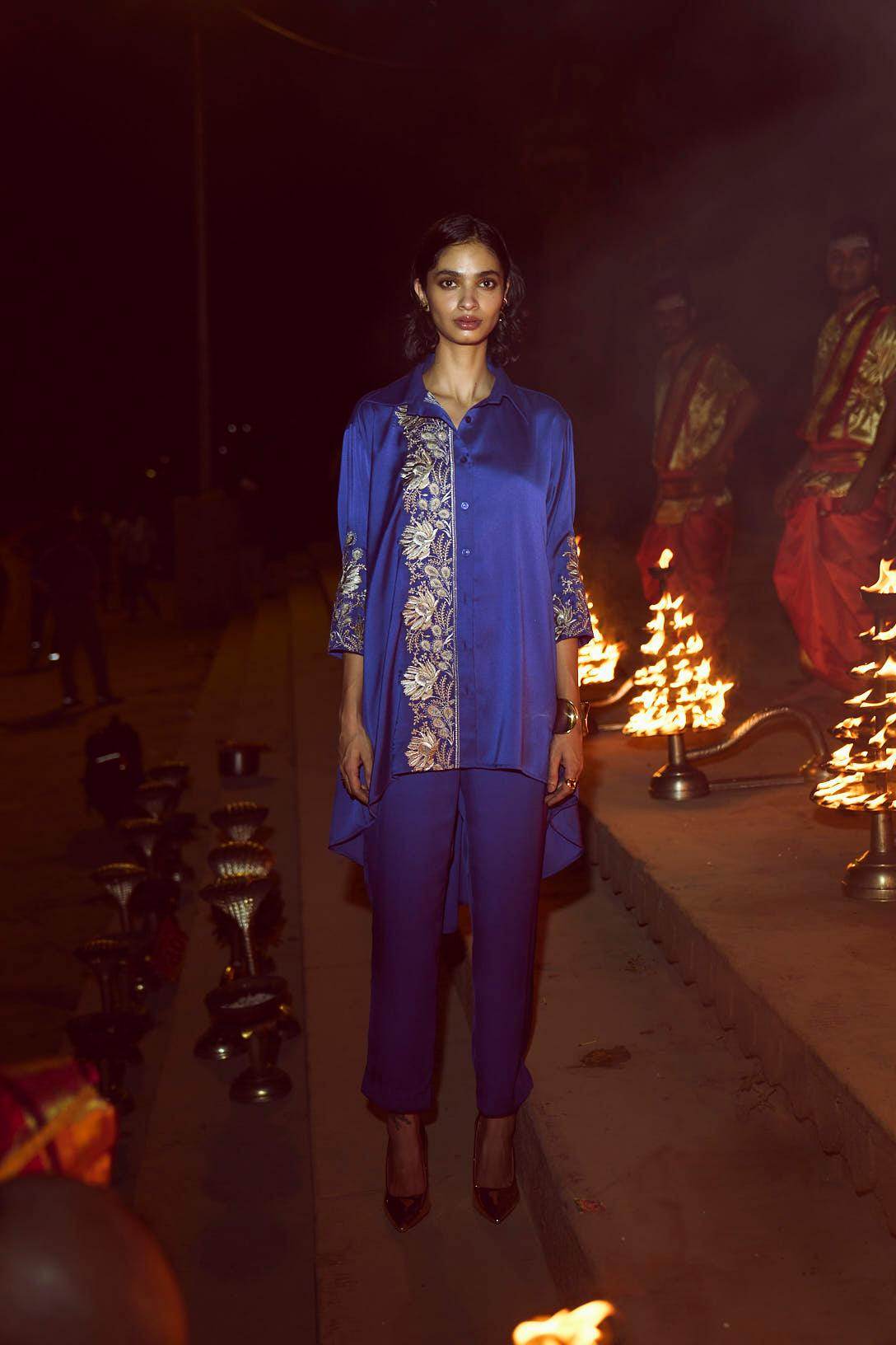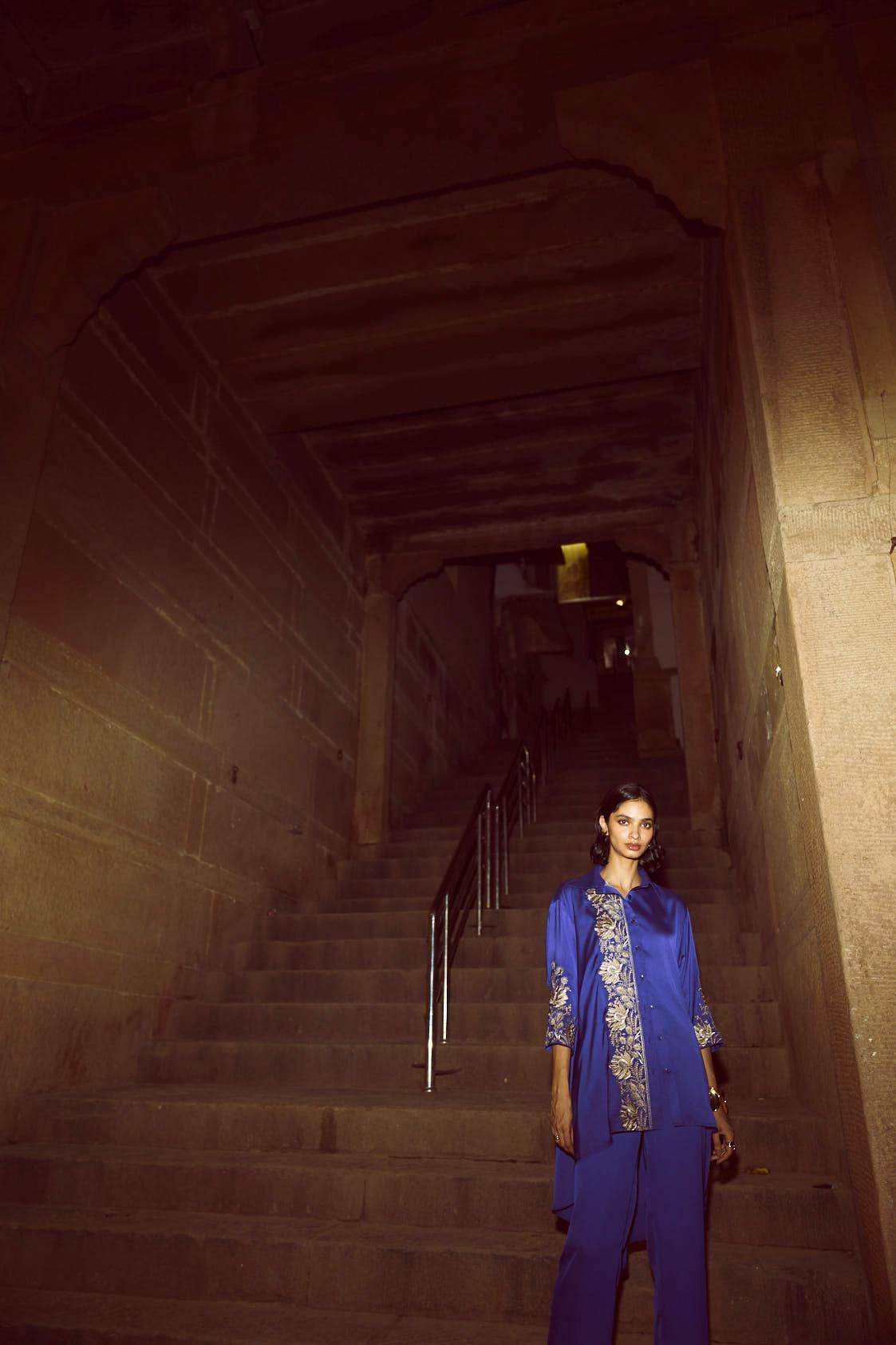Purple embroidered top in satin fabric. Placed zari-thread floral embroidery at the right placket and at the sleeve cuffs. Shirt collar with button closure at the front. 3/4th sleeves. Box pleat to create a flare and high/low curved hem at the back. Boxy fit. Paired with matching straight-fit pants. Pockets on the side. Hook and zip closure at the front. Belt loops.
