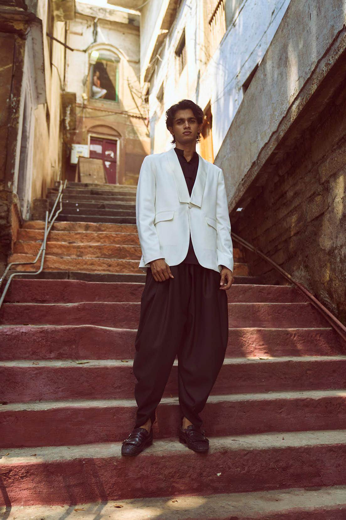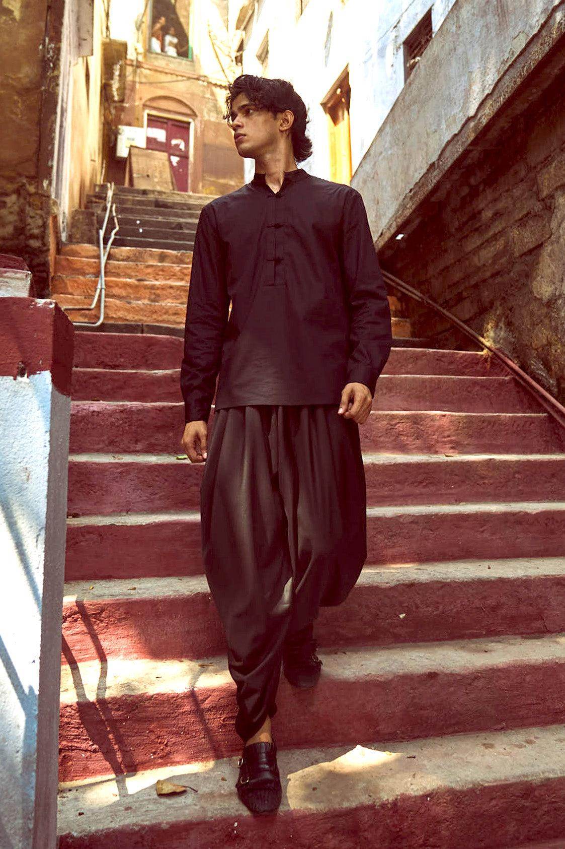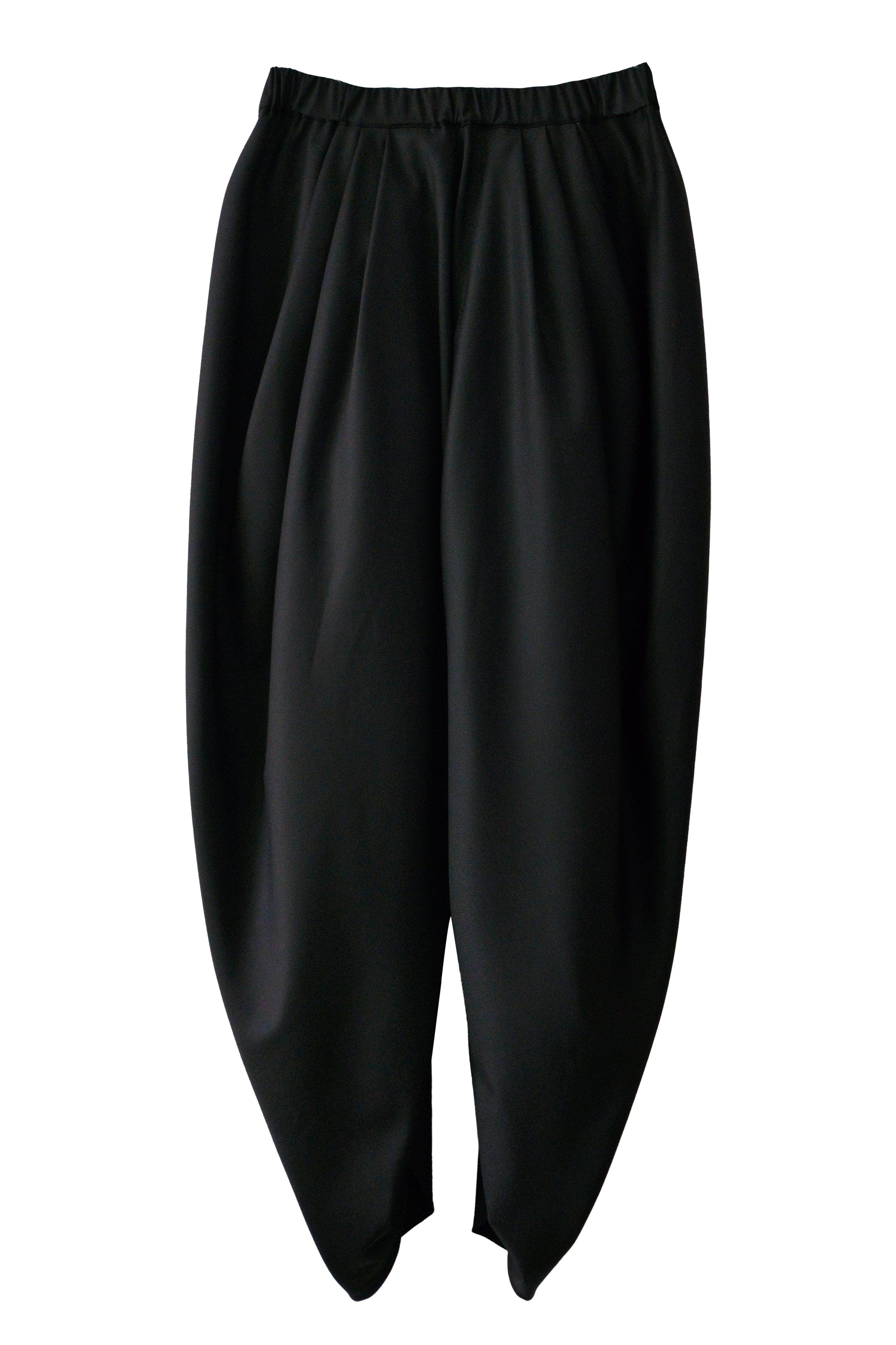 Black cowl pants in all weather suiting material. Dhoti-inspired draped pleat detail at add volume that tapers toward the cuff. Elasticated waist. Comfort fit.