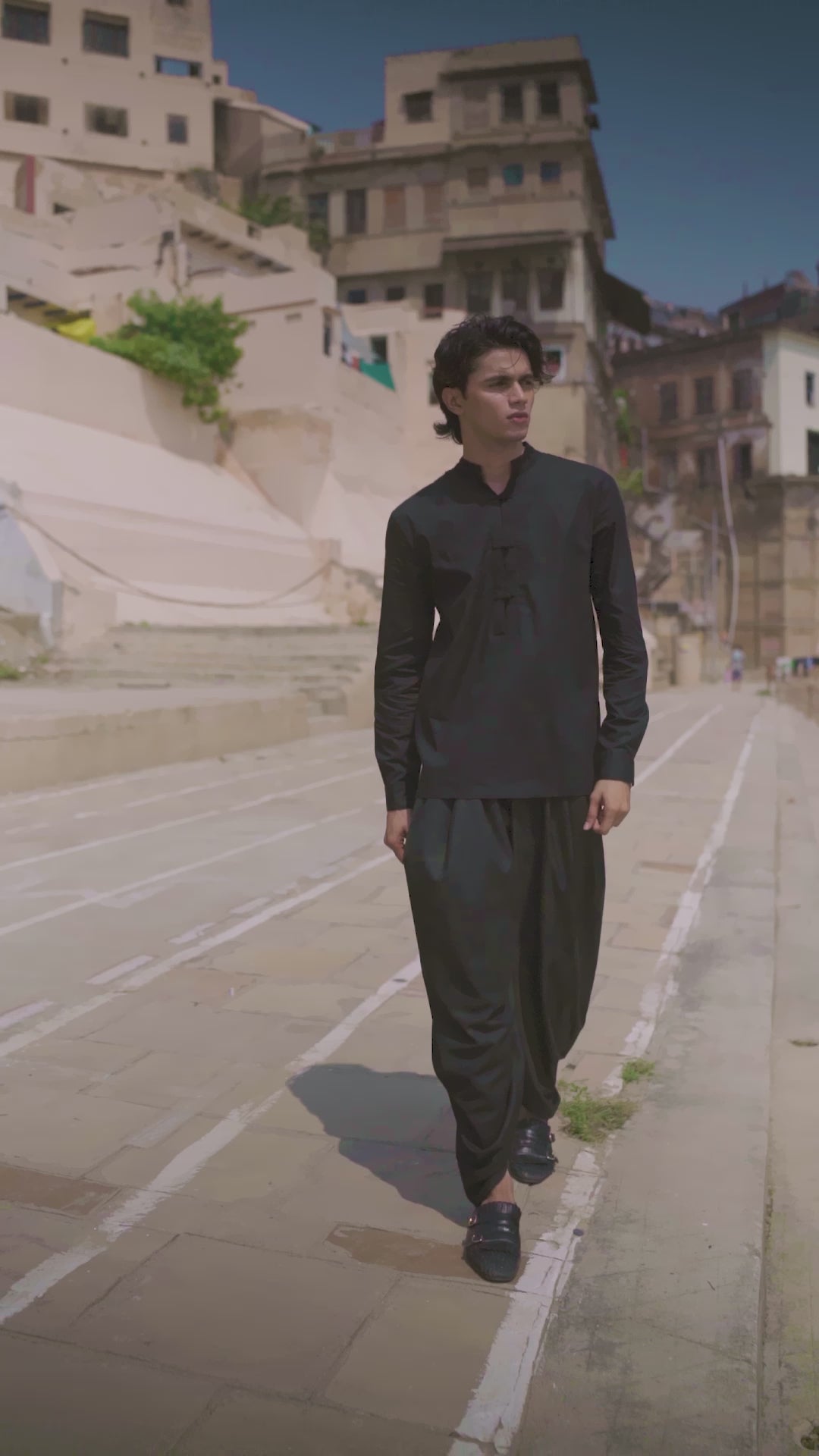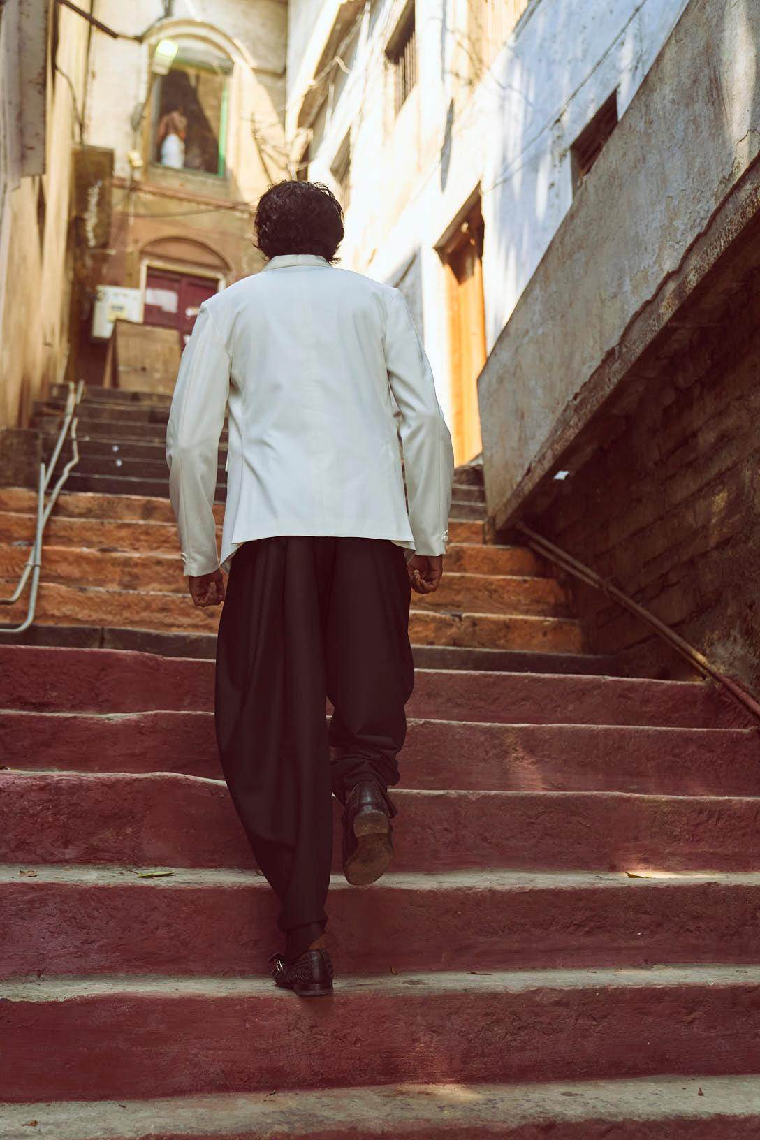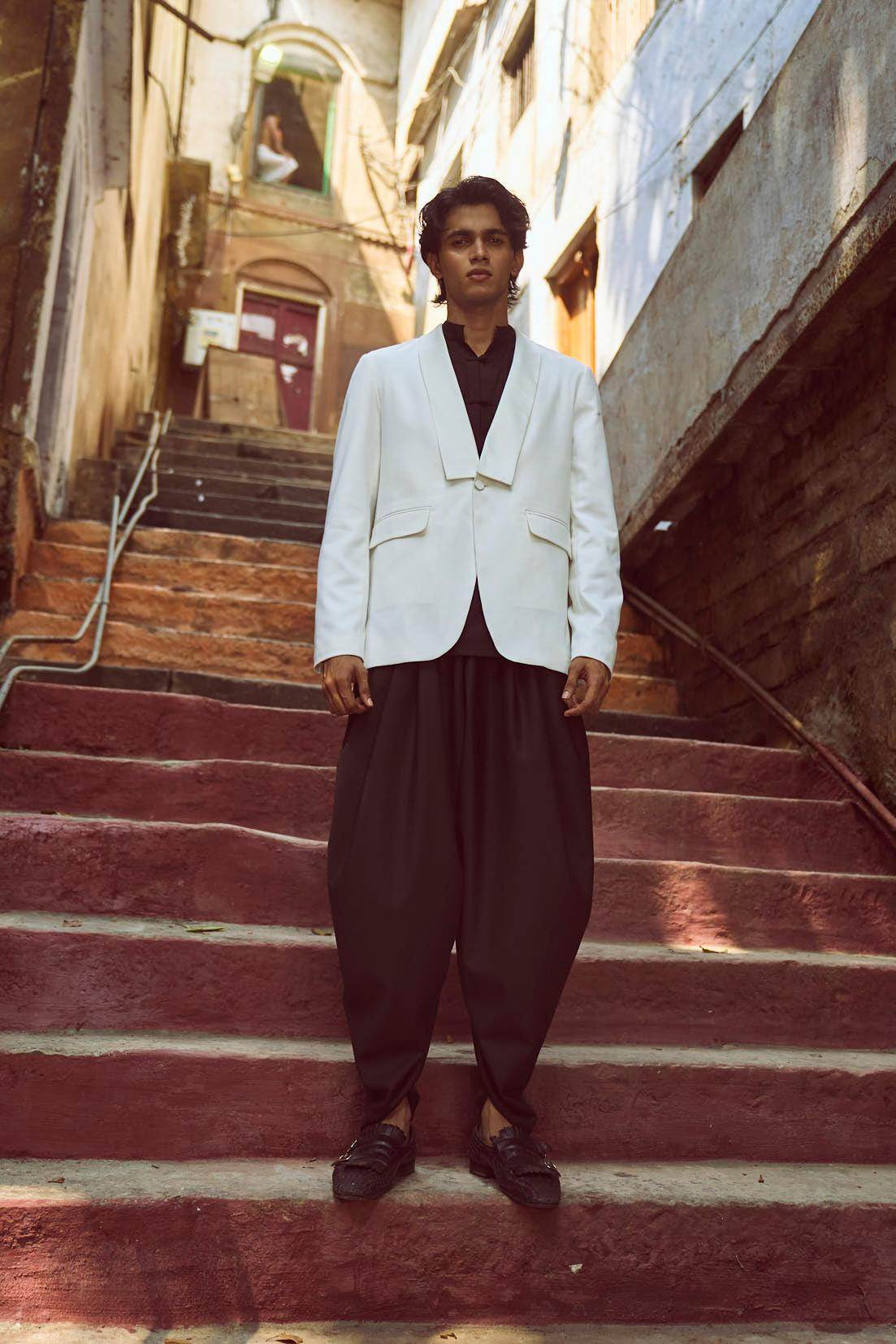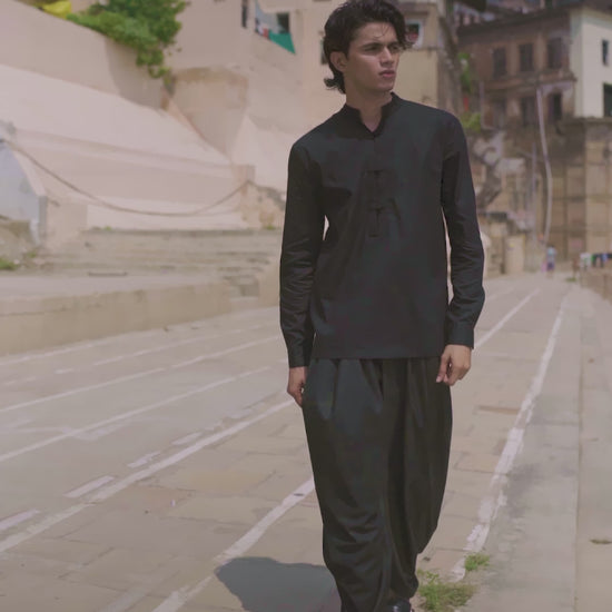 Black cowl pants in all weather suiting material. Dhoti-inspired draped pleat detail at add volume that tapers toward the cuff. Elasticated waist. Comfort fit.