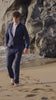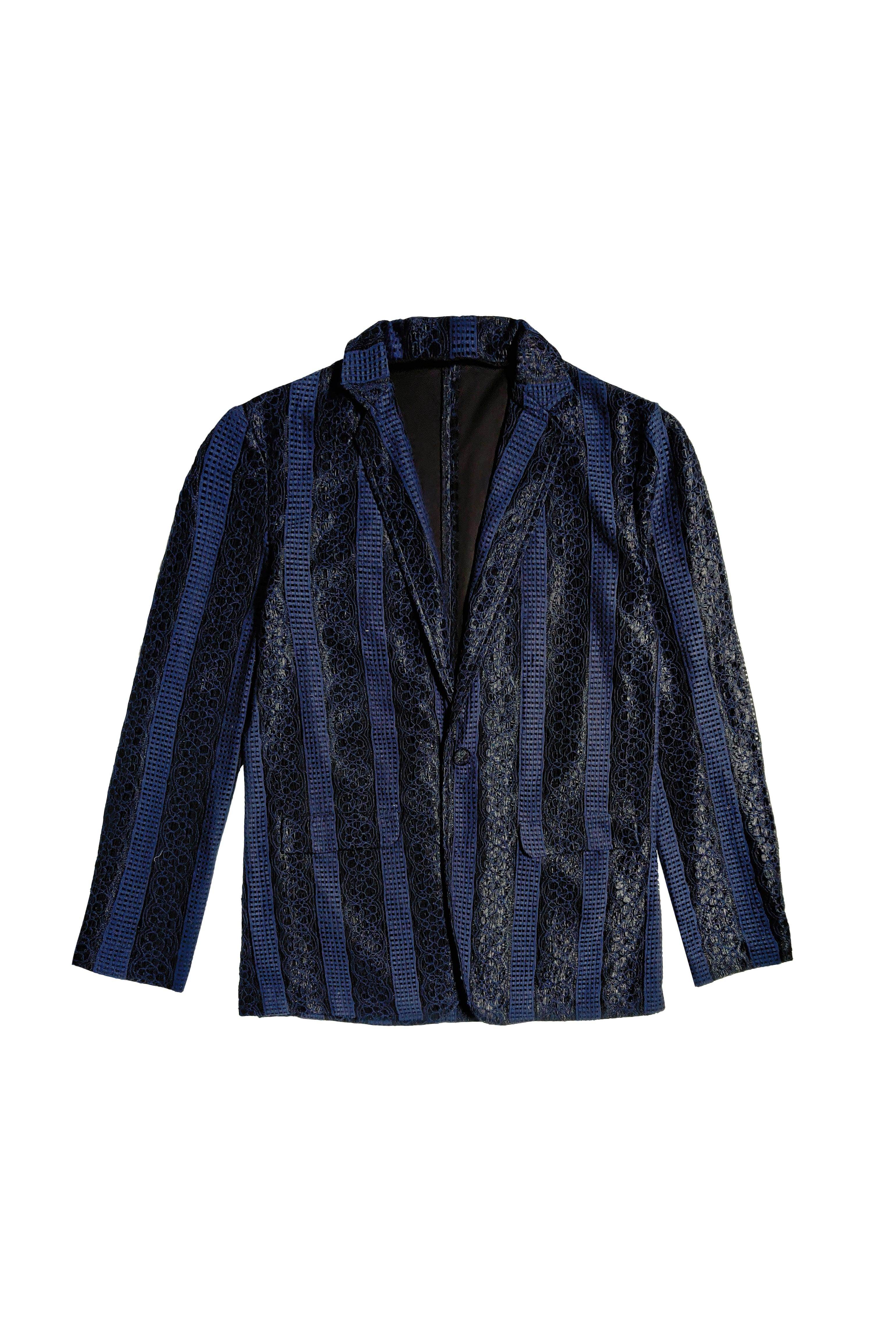 Blue and navy stripe patterned deconstructed jacket made of hand and machine-knitted lace. Notch collar lapels and single fabric button closure at the front. Pockets at the front, vents on the sides. Paired with matching straight pants. Hook and zip closure at the front. Pockets on the side and back. Both garments are fully lined.