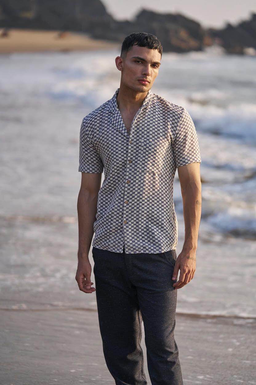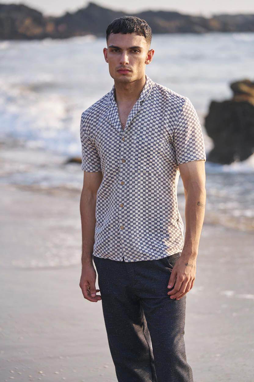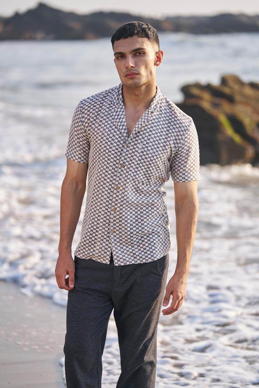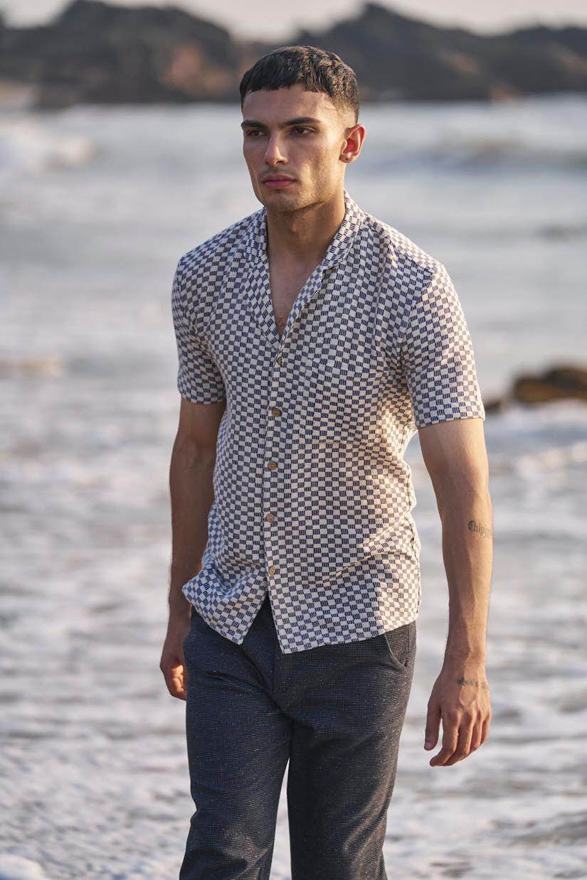 Textured half sleeve shirt in a box check pattern in knitted lace inspired fabric. Cuban collar, half sleeves.