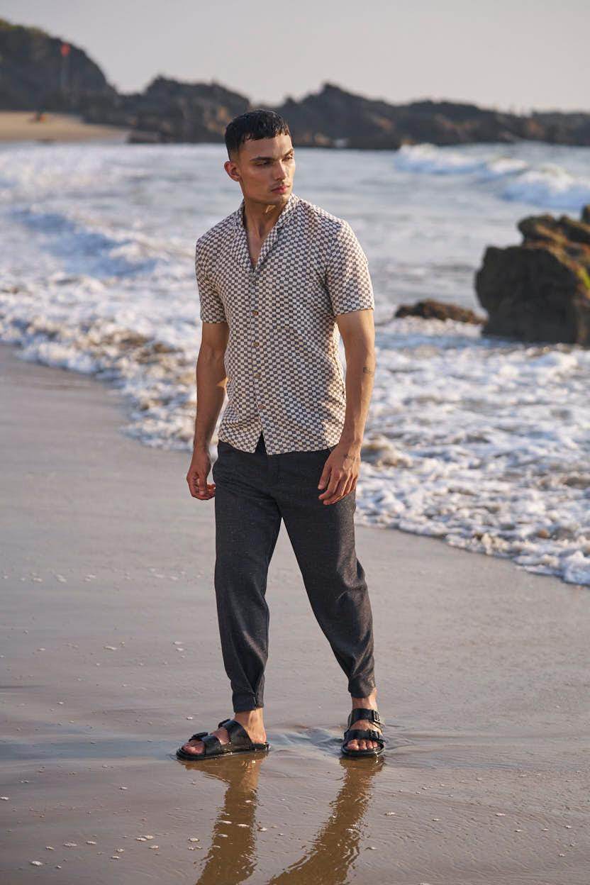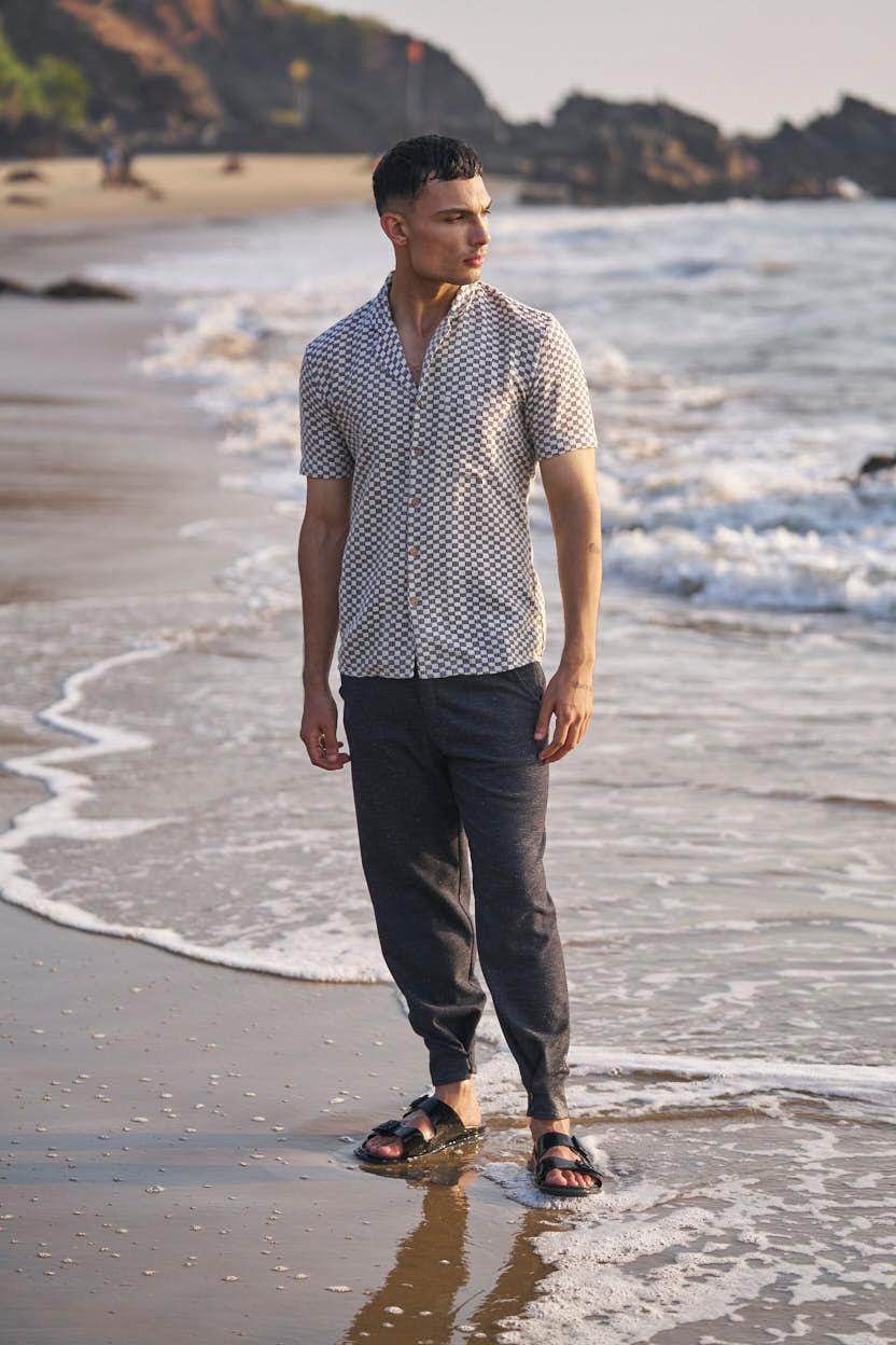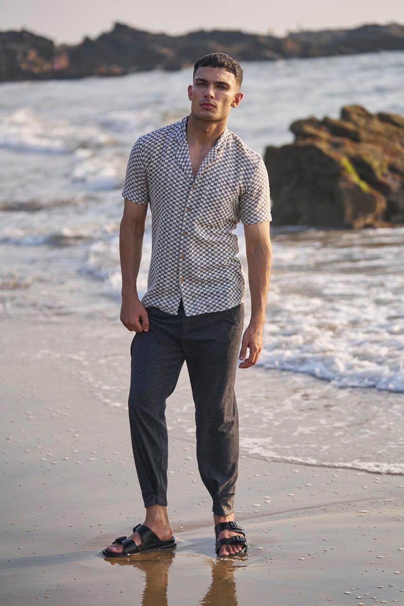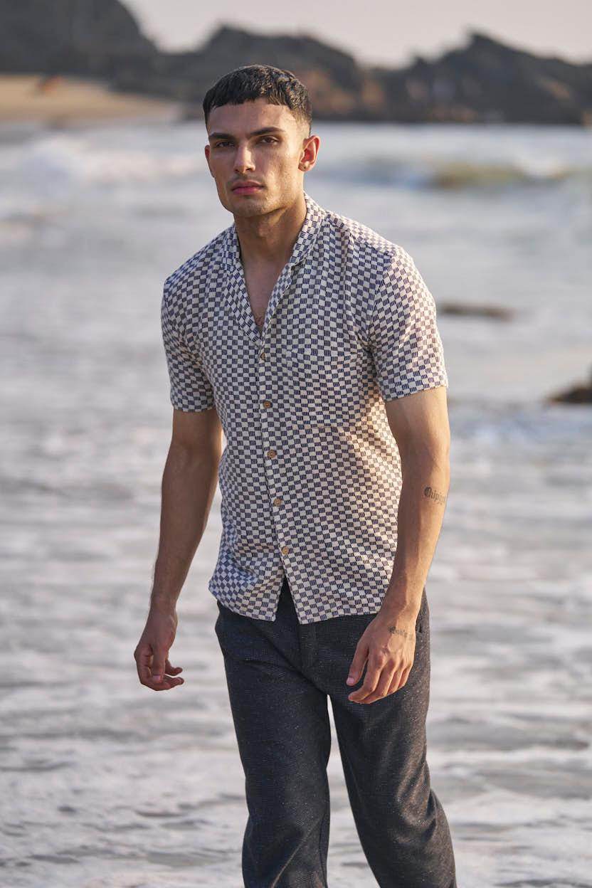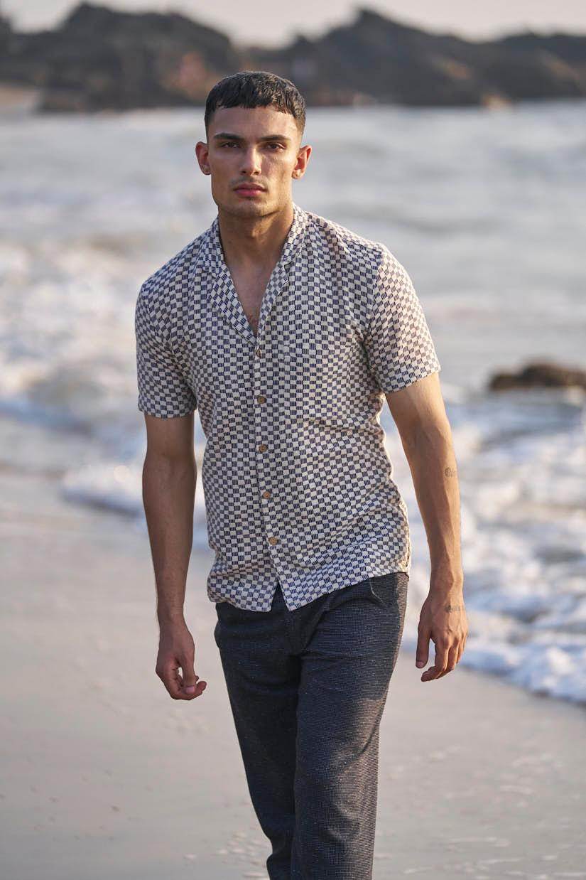 Textured half sleeve shirt in a box check pattern in knitted lace inspired fabric. Cuban collar, half sleeves.