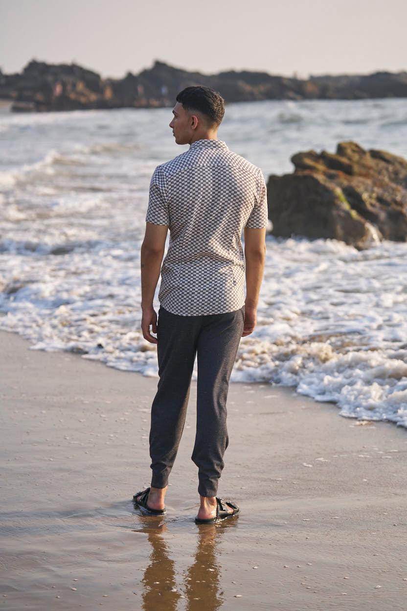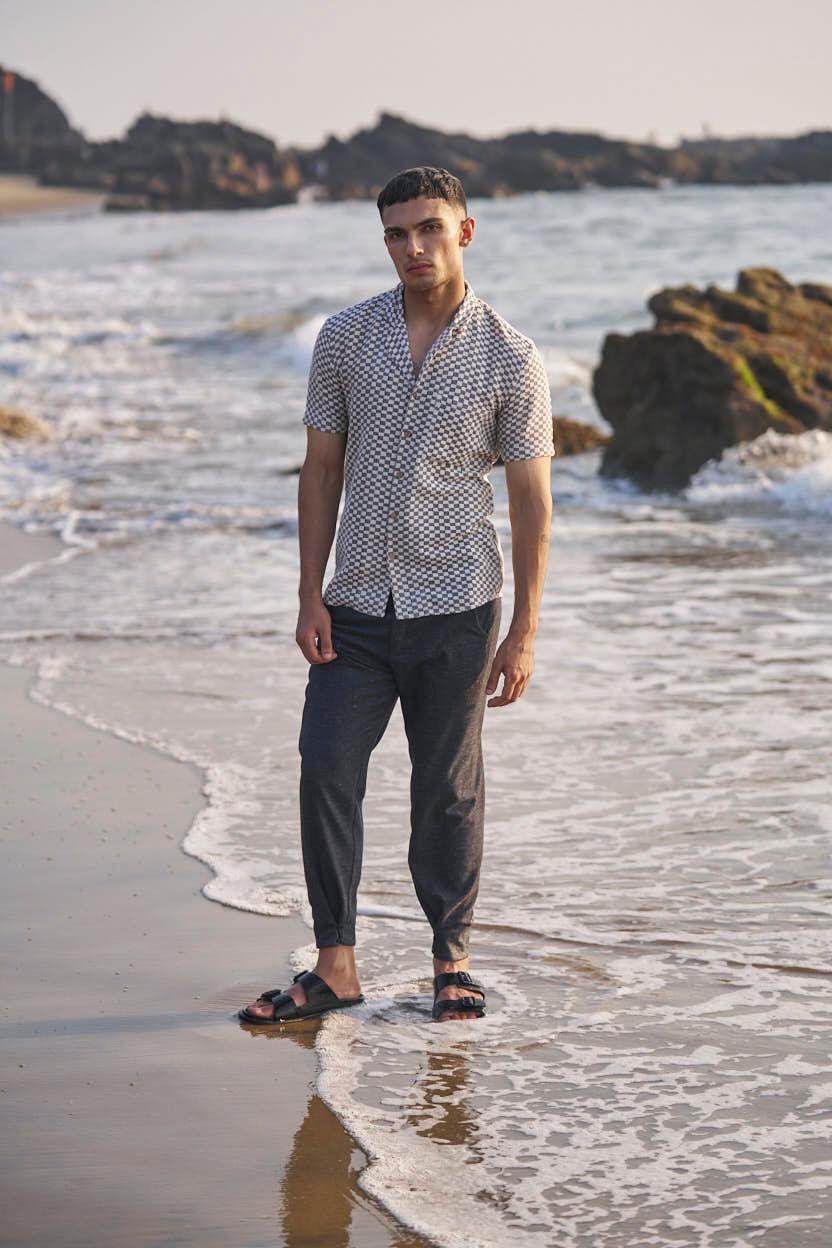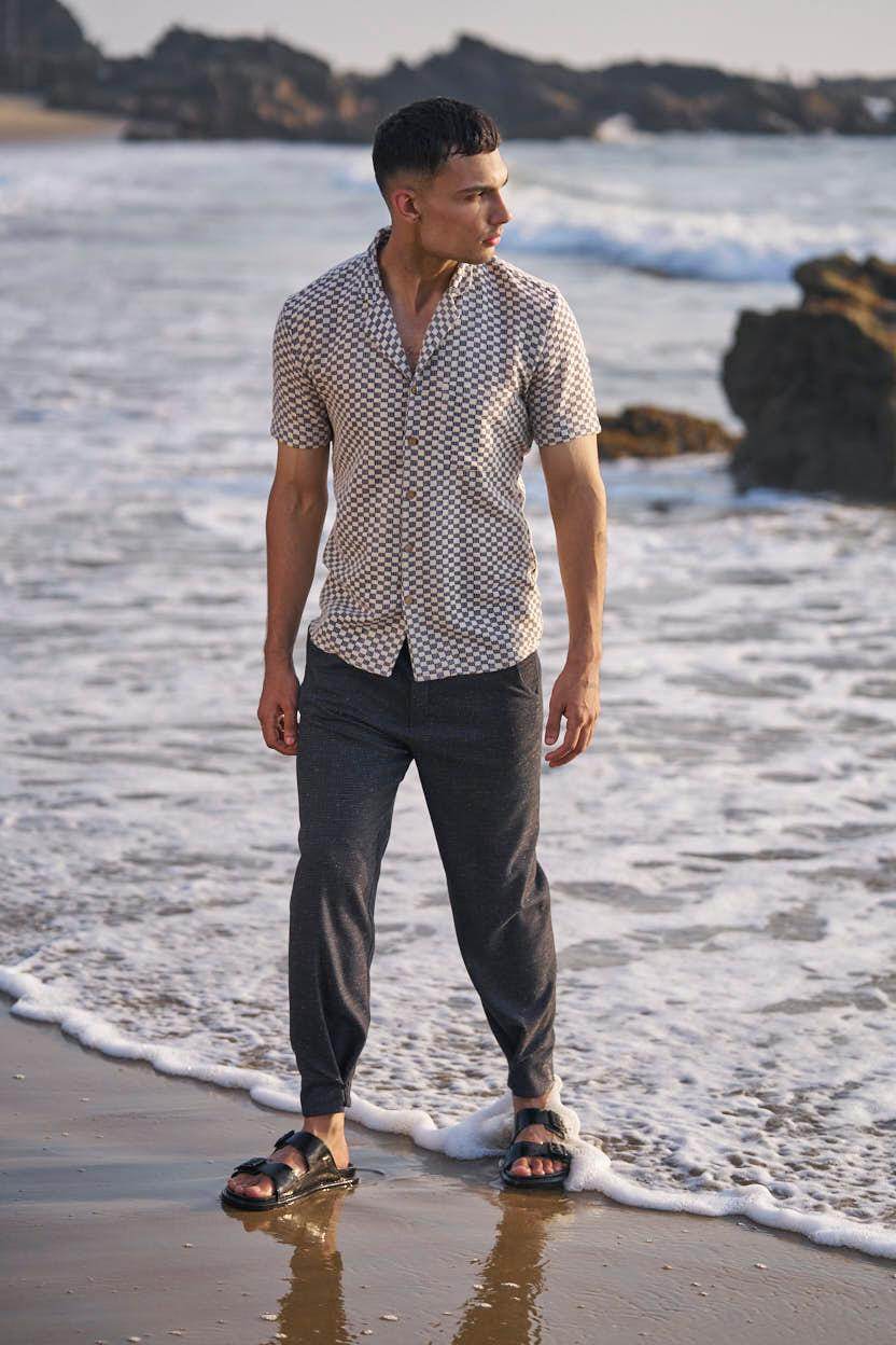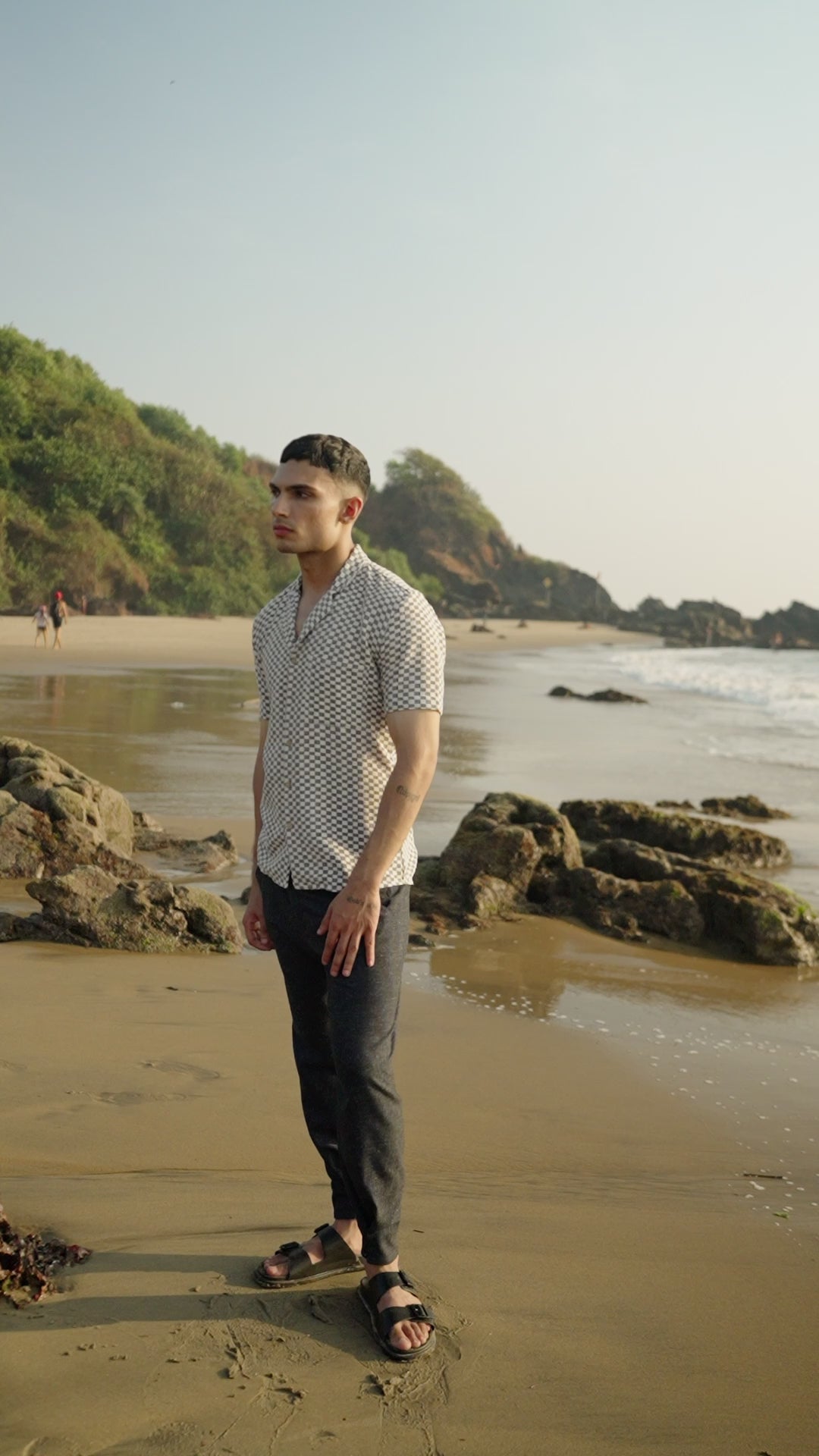 Textured half sleeve shirt in a box check pattern in knitted lace inspired fabric. Cuban collar, half sleeves.
