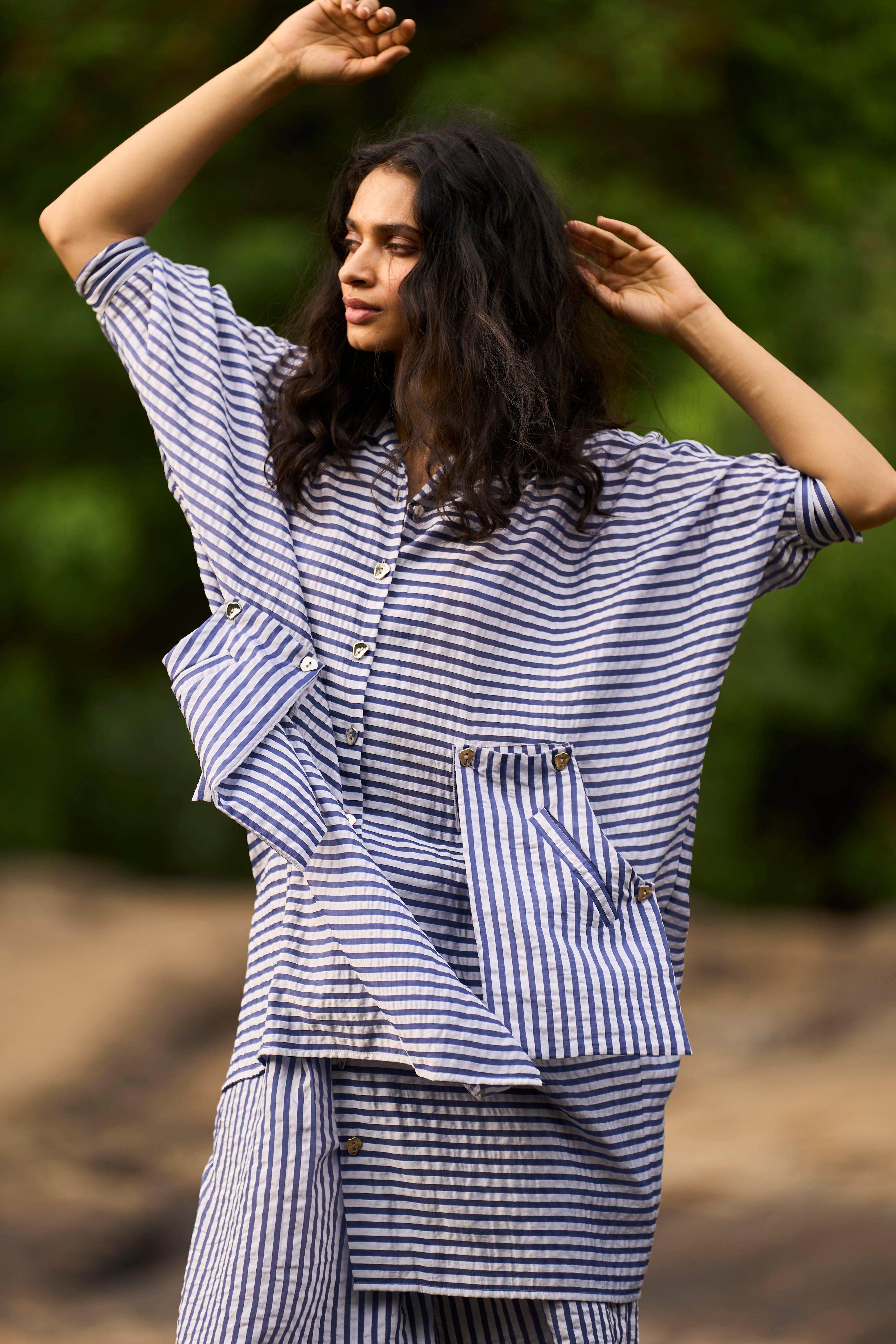 Relaxed longline blue and white striped shirt in a summery drapey lightweight fabric. Front button down placket with abstract silver button closures. Half dolman sleeves with a cuff. Detachable buttoned-on patch pockets in the front. Boxy fit. Paired with matching wide-legged relaxed fit pants. Inverted pleats in the front to add a slight A-line shape. Semi-elasticated waistband with a button and zip closure in the front. Pockets in the sides.