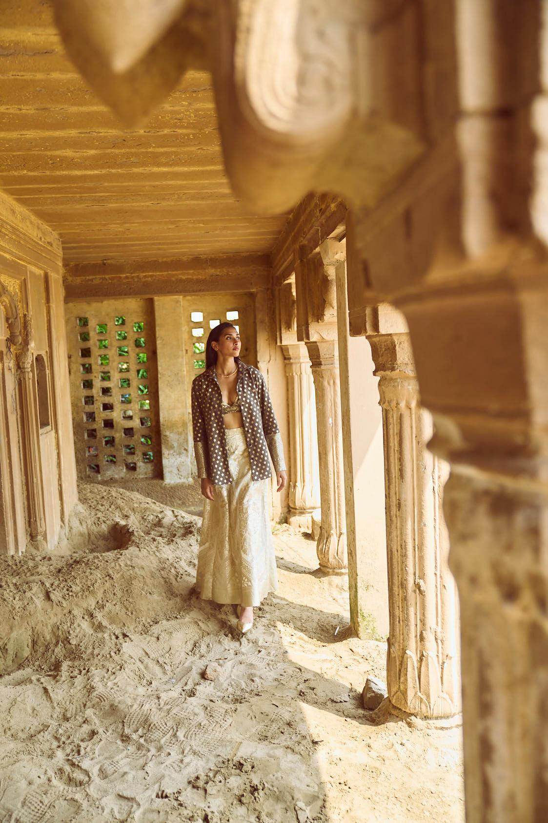 Stone grey shirt in lurex champagne chanderi brocade motifs. Placed borders on the sleeves cuffs of the shirt. Slit on the sides. Snap button closure at the front. Box pleat at the back.